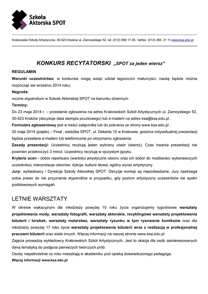 Krakowskie Szkoły Artystyczne, 30-523 Kraków ul. Zamoyskiego 52, tel. (012) 656 17 26, tel/fax (012) 266 21 11,www.ksa.edu.pl KONKURS RECYTATORSKI „SPOT za jeden wiersz” REGULAMIN Warunki uczestnictwa: w konkursie mogą wziąć udział tegoroczni maturzyści, naukę będzie można rozpocząć we wrześniu 2014 roku; Nagroda: roczne stypendium w Szkole Aktorskiej SPOT na kierunku dziennym Terminy: Do 23 maja 2014 r. – przesłanie zgłoszenia na adres Krakowskich Szkół Artystycznych ul. Zamoyskiego 52, 30-523 Kraków (decyduje data stempla pocztowego) lub e-mailem na adres [email protected] . Formularz zgłoszeniowy jest w treści załącznika lub do pobrania ze strony www.ksa.edu.pl . 30 maja 2014 (piątek) – Finał , siedziba SPOT, ul. Dekerta 10 w Krakowie, godzina indywidualnej prezentacji będzie przesłana e-mailem lub telefonicznie po otrzymaniu zgłoszenia. Zasady prezentacji: Uczestnicy recytują jeden wybrany utwór (wiersz). Czas trwania prezentacji nie powinien przekroczyć 3 minut. Uczestnicy recytują w ojczystym języku. Kryteria ocen - dobór repertuaru (wartości artystyczne utworu oraz ich dobór do możliwości wykonawczych uczestnika); interpretacja utworów; dykcja; kultura słowa; ogólny wyraz artystyczny. Jury: wykładowcy i Dyrekcja Szkoły Aktorskiej SPOT. Decyzje komisji są niepodważalne. Jury zastrzega sobie prawo do nie przyznania stypendiów w przypadku, gdy poziom artystyczny uczestników nie spełni podstawowych wymagań. LETNIE WARSZTATY W okresie wakacyjnym dla młodzieży powyżej 15 roku życia organizujemy tygodniowe warsztaty projektowania mody, warsztaty fotografii, warsztaty aktorskie, recyklingowe warsztaty projektowania biżuterii i torebek, warsztaty malarstwa, warsztaty rysunku w tym rysowanie komiksów oraz dla młodzieży powyżej 17 roku życia warsztaty projektowania biżuterii wraz z realizacją w profesjonalnej pracowni biżuterii oraz wiele innych. Więcej informacji na naszej stronie www.ksa.edu.pl Zajęcia prowadzą wykładowcy Krakowskich Szkół Artystycznych. Jest to okazja dla osób zainteresowanych daną tematyką do podjęcia pierwszych twórczych prób. Osoby niepełnoletnie co roku mieszkają w akademiku pod opieką doświadczonego pedagoga. Więcej informacji www.ksa.edu.pl