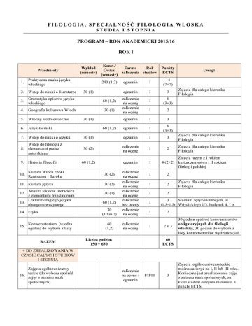 FILOLOGIA, SPECJALNOŚĆ FILOLOGIA WŁOSKA STUDIA I STOPNIA PROGRAM – ROK AKADEMICKI 2015/16 ROK I Przedmioty Wykład (semestr) Konw./ Forma Rok Ćwicz. zaliczenia studiów (semestr) 1. Praktyczna nauka języka włoskiego 2. Wstęp do nauki o literaturze 3. Gramatyka opisowa języka włoskiego 60 (1,2) 4. Geografia kulturowa Włoch 30 (1) 5. Włochy średniowieczne 6. Język łaciński 7. Wstęp do nauki o języku 8. Wstęp do filologii z elementami prawa autorskiego 9. Historia filozofii 10. Kultura Włoch epoki Renesansu i Baroku 11. Kultura języka Analiza tekstów literackich z elementami translatorium Lektorat drugiego języka 13. obcego nowożytnego 12. 14. Etyka Konwersatorium (wiedza 15. ogólna) do wyboru z listy RAZEM Punkty ECTS Uwagi egzamin I 14 (7+7) egzamin I 3 I 6 (3+3) I 2 egzamin I 3 egzamin I 6 (3+3) 30 (1) egzamin I 3 Zajęcia dla całego kierunku Filologia 30 (2) zaliczenie na ocenę I 2 Zajęcia dla całego kierunku Filologia 60 (1,2) egzamin I 240 (1,2) 30 (1) 30 (1) 60 (1,2) zaliczenie na ocenę zaliczenie na ocenę 30 (1 lub 2) zaliczenie na ocenę zaliczenie na ocenę zaliczenie na ocenę zaliczenie bez oceny zaliczenie na ocenę 60 (1,2) zaliczenie na ocenę 30 (2) 30 (2) 30 (1) 60 (1,2) Zajęcia razem z I rokiem 4 (2+2) kulturoznawstwa i II rokiem filologii polskiej I 2 I 2 I 2 I I I Liczba godzin: 150 + 630 Zajęcia dla całego kierunku Filologia 3 Zajęcia dla całego kierunku Filologia Studium Języków Obcych, ul. (1,5+1,5) Wóycickiego 1/3, budynek 4, I p. 2 2x3 30 godzin spośród konwersatoriów obligatoryjnych dla filologii włoskiej, 30 godzin do wyboru z listy konwersatoriów wydziałowych 60 ECTS + DO ZREALIZOWANIA W CZASIE CAŁYCH STUDIÓW I STOPNIA Zajęcia ogólnouniwersyteckie (do wyboru spośród 16. zajęć z zakresu nauk społecznych) zaliczenie na ocenę / egzamin I/II/III 3 Zajęcia ogólnouniwersyteckie można zaliczyć na I, II lub III roku. Konieczne jest zrealizowanie zajęć z zakresu nauk społecznych, za które student otrzyma minimum 3 punkty ECTS. ROK II Przedmioty 1. Praktyczna nauka języka włoskiego 2. Związki kulturowe włosko-polskie Wykład (semestr) Wstęp do historii sztuki włoskiej Analiza tekstów literackich 5. z elementami translatorium 6. Historia języka włoskiego Literatura włoska XIX wieku 9. Lektorat drugiego języka obcego nowożytnego 10. Egzamin z drugiego języka obcego nowożytnego 11. Wychowanie fizyczne 12. Seminarium licencjackie 13. Konwersatorium (wiedza ogólna) do wyboru z listy 14. Zajęcia wybranej specjalizacji RAZEM + DO ZREALIZOWANIA W CZASIE CAŁYCH STUDIÓW I STOPNIA Rok studiów Punkty ECTS 210 (3,4) egzamin II 13 (7+6) zaliczenie na ocenę II 3 zaliczenie na ocenę II 3 egzamin II 3 zaliczenie na ocenę II 6 (3+3) egzamin II 3 zaliczenie na ocenę II 3 egzamin II 3 30 (3) 30 (3) 60 (3,4) 30 (4) 7. Włochy XIX wieku 8. Forma zaliczenia 30 (3) 3. Stylistyka praktyczna 4. Konw./ Ćwicz. (semestr) 30 (4) 30 (4) 60 (3,4) II zaliczenie bez oceny II 30 (4) zaliczenie bez oceny II 60 (3,4) zaliczenie na ocenę według programu specjalizacji Liczba godzin: 120 + 540 + zajęcia specjalizacyjne II II Zajęcia dla całego kierunku Filologia 3 (1,5+ 1,5) Studium Języków Obcych 1 60 (3,4) Uwagi 2 (1+1) Studium Języków Obcych Sprawami wychowania fizycznego zajmuje się STUDIUM WYCHOWANIA FIZYCZNEGO. 3 2x3 8 60 ECTS 30 godzin spośród konwersatoriów obligatoryjnych dla filologii włoskiej, 30 godzin do wyboru z listy konwersatoriów wydziałowych Student musi zrealizować przynajmniej jedną specjalizację spośród następujących: - Nauczycielska - Edytorska - Komunikacja językowa: media, reklama, PR - Filmoznawcza - Teatrologiczna - Zarządzanie kulturą - Media w kulturze - Muzeologiczna Zajęcia ogólnouniwersyteckie (do wyboru spośród 15. zajęć z zakresu nauk społecznych) zaliczenie na ocenę / egzamin I/II/III Zajęcia ogólnouniwersyteckie można zaliczyć na I, II lub III roku. Konieczne jest zrealizowanie zajęć z zakresu nauk społecznych, za które student otrzyma minimum 3 punkty ECTS. 3 ROK III Przedmioty 1. Wykład (semestr) Praktyczna nauka języka włoskiego 2. Włochy XX wieku 3. Literatura włoska XX wieku 4. Analiza tekstów literackich z elementami translatorium 5. Media włoskie Konw./ Ćwicz. (semestr) III 13 (7+6) 30 (5) zaliczenie na ocenę III 3 egzamin III 4 30 (5) zaliczenie na ocenę III 3 30 (6) zaliczenie na ocenę III 3 III 2 III 10 (5+5) 30 (5) 7. Seminarium licencjackie 60 (5,6) Konwersatorium (wiedza ogólna) do wyboru z listy 9. Zajęcia wybranej specjalizacji 10. Praktyki studenckie RAZEM Uwagi egzamin 15 (6) 8. Punkty ECTS 210 (5,6) Najnowsza literatura włoska 6. Forma Rok zaliczenia studiów 60 (5 lub 6) zaliczenie na ocenę zaliczenie bez oceny zaliczenie na ocenę według programu specjalizacji III 6 III 10 zaliczenie II lub III bez oceny Liczba godzin: 30 + 435 + zajęcia specjalizacyjne i praktyki 5 semestr – 120 h 6 semestr– 90 h 30 godzin spośród konwersatoriów obligatoryjnych dla filologii włoskiej, 30 godzin do wyboru z listy konwersatoriów wydziałowych Student musi zrealizować przynajmniej jedną specjalizację spośród następujących: - Nauczycielska - Edytorska - Komunikacja językowa: media, reklama, PR - Filmoznawcza - Teatrologiczna - Zarządzanie kulturą - Media w kulturze - Muzeologiczna Praktyki można zaliczać na II lub III roku. Liczbę godzin praktyk określa Regulamin praktyk na WNH UKSW. 3 57 ECTS + DO ZREALIZOWANIA W CZASIE CAŁYCH STUDIÓW I STOPNIA Zajęcia ogólnouniwersyteckie (do wyboru spośród 11. zajęć z zakresu nauk społecznych) zaliczenie na ocenę/ egzamin 3 Zajęcia ogólnouniwersyteckie można zaliczyć na I, II lub III roku. Konieczne jest zrealizowanie zajęć z zakresu nauk społecznych, za które student otrzyma minimum 3 punkty ECTS. RAZEM ROK I, II, III: 180 ECTS
