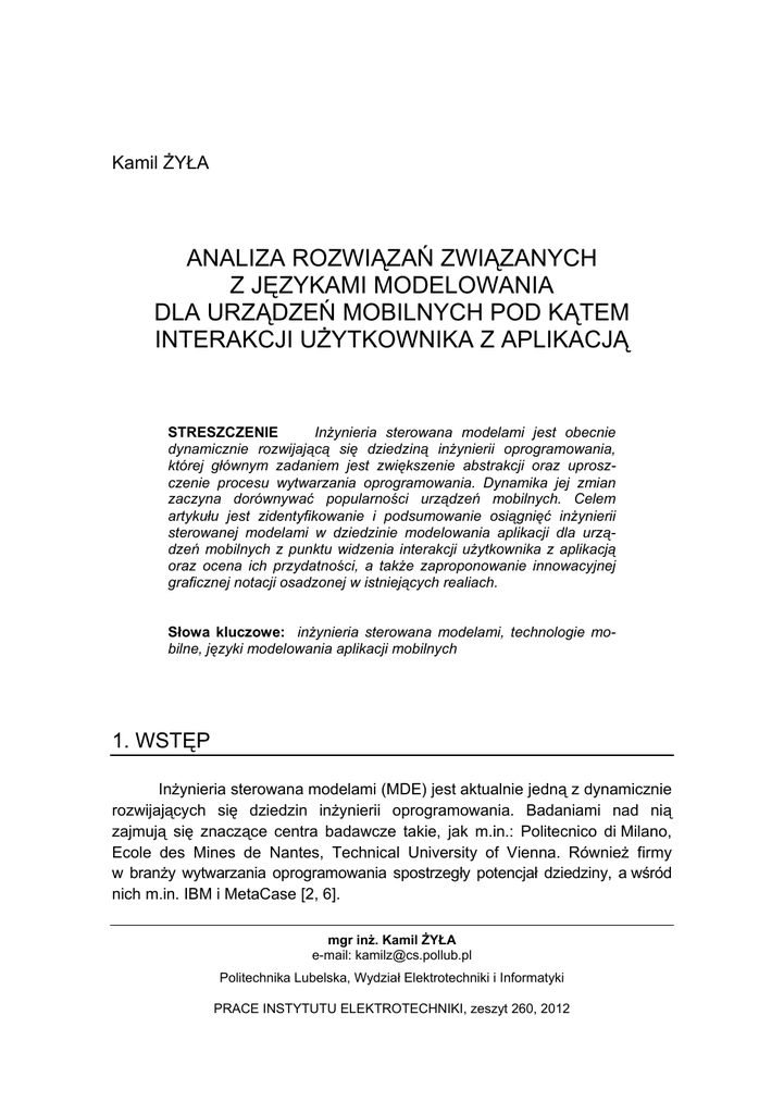 Kamil ŻYŁA ANALIZA ROZWIĄZAŃ ZWIĄZANYCH Z JĘZYKAMI MODELOWANIA DLA URZĄDZEŃ MOBILNYCH POD KĄTEM INTERAKCJI UŻYTKOWNIKA Z APLIKACJĄ STRESZCZENIE Inżynieria sterowana modelami jest obecnie dynamicznie rozwijającą się dziedziną inżynierii oprogramowania, której głównym zadaniem jest zwiększenie abstrakcji oraz uproszczenie procesu wytwarzania oprogramowania. Dynamika jej zmian zaczyna dorównywać popularności urządzeń mobilnych. Celem artykułu jest zidentyfikowanie i podsumowanie osiągnięć inżynierii sterowanej modelami w dziedzinie modelowania aplikacji dla urządzeń mobilnych z punktu widzenia interakcji użytkownika z aplikacją oraz ocena ich przydatności, a także zaproponowanie innowacyjnej graficznej notacji osadzonej w istniejących realiach. Słowa kluczowe: inżynieria sterowana modelami, technologie mobilne, języki modelowania aplikacji mobilnych 1. WSTĘP Inżynieria sterowana modelami (MDE) jest aktualnie jedną z dynamicznie rozwijających się dziedzin inżynierii oprogramowania. Badaniami nad nią zajmują się znaczące centra badawcze takie, jak m.in.: Politecnico di Milano, Ecole des Mines de Nantes, Technical University of Vienna. Również firmy w branży wytwarzania oprogramowania spostrzegły potencjał dziedziny, a wśród nich m.in. IBM i MetaCase [2, 6]. mgr inż. Kamil ŻYŁA e-mail: [email protected] Politechnika Lubelska, Wydział Elektrotechniki i Informatyki PRACE INSTYTUTU ELEKTROTECHNIKI, zeszyt 260, 2012 84 K. Żyła Jednocześnie wzrasta znaczenie urządzeń mobilnych – już od 2009 roku telefon komórkowy jest najczęściej kupowanym urządzeniem elektronicznym na świecie [3]. W dodatku warto zauważyć, że coraz większą część rynku obejmują tzw. smartfony (w 2010 roku stanowiły 3/4 sprzedanych telefonów) i tablety [1]. Ciągła ekspansja tego rynku sprzyja rozwojowi platform programistycznych oraz zapotrzebowaniu na szybkie metody wytwarzania oprogramowania. Siła obydwu trendów sprawia, że warto zastanowić się nad rozwiązaniami MDE mogącymi znaleźć zastosowanie w procesie wytwarzania aplikacji na urządzenia mobilne. 2. PODSTAWOWE POJĘCIA MDE Obecnie w ramach inżynierii sterowanej modelami wyróżnia się dwa główne podejścia do procesu wytwarzania oprogramowania: MDA (ang. Model-Driven Architecture) – sformalizowane podejście zaproponowane przez OMG (ang. Object Management Group) oraz MDSD (ang. Model-Driven Software Development) – mniej sformalizowane podejście ukierunkowane na szybką implementację. [2] Niezależnie od podejścia, oprogramowanie reprezentuje się przy pomocy modeli zbudowanych z wykorzystaniem graficznych bądź tekstowych języków modelowania. Wspomniane języki są zazwyczaj dostosowane do dziedziny aplikacji i są wtedy nazywane językami dziedzinowymi (ang. DSLs – Domain-Specific Languages). Model zdefiniowany przy pomocy języka dziedzinowego nazywa się modelem dziedzinowym (ang. DSM – Domain-Specific Model) [2]. Sformalizowany opis metody tworzenia modeli, będący „modelem modelu”, jest nazywany metamodelem i jest zbiorem konceptów (elementów, procesów itp.) związanych z określoną dziedziną. Jeśli model jest abstrakcją świata rzeczywistego, to metamodel jest abstrakcją opisującą właściwości takiego modelu oraz określającą podstawowe jego elementy [4]. Kod wynikowy aplikacji jest generowany na podstawie odpowiednich modeli – w przypadku złożonych systemów informatycznych kod wynikowy może być wypadkową wielu modeli różnego typu. W związku z tym ważne jest utrzymanie spójności modeli z kodem. W tym celu zmiany powinny być wprowadzane w modelu, a nie kodzie aplikacji, a następnie propagowane przez generator [2]. Analiza rozwiązań związanych z językami modelowania dla urządzeń mobilnych… 85 3. GRAFICZNE ROZWIĄZANIA MDE W KONTEKŚCIE MODELOWANIA APLIKACJI MOBILNYCH App Inventor jest narzędziem modelowania aplikacji mobilnych na platformę Android opracowanym przez firmę Google. Obecnie opieka nad nim została przekazana Massachusetts Institute of Technology. Modelowanie aplikacji przebiega dwuetapowo – opracowanie interfejsu aplikacji mobilnej przy pomocy App Inventor Designer, a następnie reprezentacja akcji związanych z elementami interfejsu przy pomocy App Inventor Blocks Editor [5]. Na rysunku 1 przedstawiono fragmenty modelu interfejsu i logiki biznesowej aplikacji na platformę Android, która w odpowiedzi na kliknięcie przycisku odtwarza plik dźwiękowy. Sekcja A przedstawia edytor WYSIWYG (ang. What You See Is What You Get) służący do modelowania interfejsu. Sekcja B przedstawia narzędzie modelowania działania aplikacji, w którym dostępne komponenty symbolizują m.in. metody, zdarzenia, stałe, pętle, itp. Rys. 1. Widok App Inventor Designer (A) oraz Blocks Editor (B) WebML (ang. Web Modeling Language) jest narzędziem modelowania aplikacji internetowych zarządzających dużymi ilościami danych opracowanym i rozwijanym przede wszystkim przez Politecnico di Milano oraz Web Models. Na proces powstawania aplikacji składają się specyfikacja wymagań funkcjonalnych i niefunkcjonalnych, opracowanie modelu danych oraz opracowanie modelu hipertekstu. Każdy z etapów korzysta z charakterystycznych dla siebie rozwiązań [2]. Na rysunku 2 przedstawiono fragment modelu danych oraz modelu hipertekstu aplikacji zarządzającej sprzedażą. Model danych (sekcja A) jest typowym diagramem związków encji i przedstawia zależność jeden do wielu 86 K. Żyła pomiędzy kategorią a towarem. Natomiast model hipertekstu (sekcja B) przedstawia stronę „Kategorie produktów” wyświetlającą kategorie produktów, a po wyborze kategorii przez użytkownika produkty w tej kategorii. IFML (ang. Interaction Flow Modeling Language) jest graficznym językiem dziedzinowym, będącym w trakcie procesu Rys. 2. Przykładowy model danych (A) standaryzacji OMG, służącym i hipertekstu (B) [2] do uogólnionego op