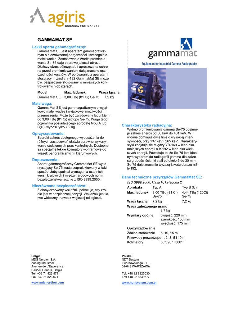 GAMMAMAT SE Lekki aparat gammagraficzny: GammaMat SE jest aparatem gammagraficznym o niezrównanej poręczności i szczególnie małej wadze. Zastosowanie źródła promieniowania Se-75 daje poprawę jakości obrazu. Dłuższy okres półrozpadu i uproszczona ochrona przed promieniowaniem dają znaczne oszczędności kosztów. W porównaniu z aparatami stosującymi źródła Ir-192 GammaMat SE może być bezpiecznie stosowany w mniejszych kontrolowanych obszarach. Model GammaMat SE Max. ładunek Waga łączna 3,00 TBq (81 Ci) Se-75 7,2 kg Mała waga: GammaMat SE jest gammagraficznym o wyjątkowo małej wadze i wyjątkowej możliwości przenoszenia. Może być załadowany ładunkiem do 3,00 TBq (81 Ci) izotopu Se-75. Waga tego pojemnika posiadającego aprobatę typu A lub B(U), wynosi tylko 7,2 kg. Oprzyrządowanie: Szeroki zakres dostępnego wyposażenia do różnych zastosowań ułatwia sprawne wykonywanie codziennych prac kontrolnych. Dostępne są specjalne lekkie kolimatory wolframowe do wiązek panoramicznych i kierunkowych. Dopuszczenia: Aparat gammagraficzny GammaMat SE wykorzystujący Se-75 został zaprojektowany w taki sposób, żeby spełniał wymagania ostatnich wersji krajowych i międzynarodowych norm bezpieczeństwa łącznie z ISO 3999:2000. Niezrównane bezpieczeństwo: Zielony/czerwony wskaźnik pokazuje, czy źródło jest w bezpiecznej pozycji. Wskaźnik jest łatwo widoczny, nawet z większej odległości. Charakterystyka radiacyjna: Widmo promieniowania gamma Se-75 obejmuje zakres energii od 66 keV do 401 keV. W widmie dominują dwie linie o wysokiej intensywności, przy 137 keV i 265 keV. Charakterystyki znajdują się między YB-169 w kierunku mniejszych energii a Ir-192 w kierunku większych energii. Powoduje to, że Se-75 jest idealnym wyborem do radiografii gamma dla zakresu grubości ścianki stali od około 5 do 30 mm. Se-75 daje znacznie wyższą jakość obrazu niż Ir-192. Dane techniczne przyrządów GammaMat SE: ISO 3999:2000, klasa P, kategoria 2 Aprobata Typ A Typ B (U) Max. ładunek 3,00 TBq (81 Ci) 4,44 TBq (120Ci) Se-75 Se-75 Waga łączna 7,2 kg 7,2 kg Waga zubożonego uranu 2,7 kg Wymiary ogólne długość: 220 mm szerokość: 100 mm wysokość: 175 mm Oprzyrządowanie Zdalne sterowanie 5, 10, 15 m Przewody prowadzące 1, 2, 3, 5 i 10 m Kolimatory 60°, 90° i 360° Belgia: MDS Nordion S.A. Zoning Industriel Avenue de L'Espérance B-6220 Fleurus, Belgia Tel. +32 71 823 571 Fax +32 71 823 671 Polska: NDT System Twardowskiego 21 01-643 WARSZAWA www.mdsnordion.com www.ndt-system.com.pl Tel. +48 22 8325030 Fax +48 22 8339677