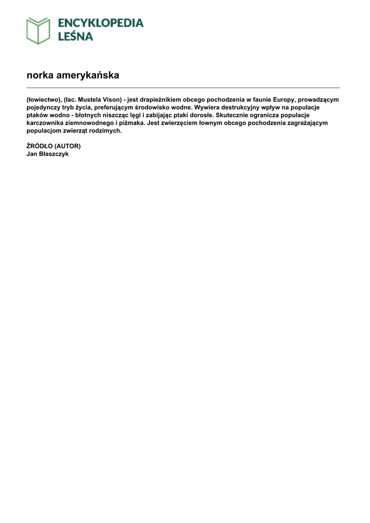 norka amerykańska (łowiectwo), (łac. Mustela Vison) - jest drapieżnikiem obcego pochodzenia w faunie Europy, prowadzącym pojedynczy tryb życia, preferującym środowisko wodne. Wywiera destrukcyjny wpływ na populacje ptaków wodno - błotnych niszcząc lęgi i zabijając ptaki dorosłe. Skutecznie ogranicza populacje karczownika ziemnowodnego i piżmaka. Jest zwierzęciem łownym obcego pochodzenia zagrażającym populacjom zwierząt rodzimych. ŹRÓDŁO (AUTOR) Jan Błaszczyk
