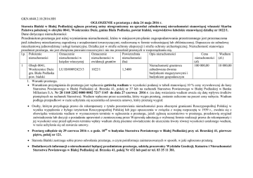 GKN.6840.2.10.2016.HH OGŁOSZENIE o przetargu z dnia 24 maja 2016 r. Starosta Bialski w Białej Podlaskiej ogłasza przetarg ustny nieograniczony na sprzedaż zabudowanej nieruchomości stanowiącej własność Skarbu Państwa położonej w obrębie 0041, Woskrzenice Duże, gmina Biała Podlaska, powiat bialski, województwo lubelskie stanowiącej działkę nr 1022/1. Dane dotyczące nieruchomości: Przedmiotem przetargu jest niżej wymieniona nieruchomość, która w miejscowym planie zagospodarowania przestrzennego jest przeznaczona pod zabudowę mieszkaniową zagrodową z urządzeniami towarzyszącymi, realizowaną w formie wolnostojącej lub zbliźniaczonej. Dopuszcza sie zabudowę mieszkaniową jednorodzinną i usługi komercyjne. Działka jest w strefie ochrony ekspozycji i strefie ochrony archeologicznej. Nieruchomość stanowiąca przedmiot przetargu, nie jest obciążona prawami rzeczowymi i nie ma przeszkód prawnych w rozporządzaniu nią. l.p. Położenie Oznaczenie Oznaczenie Powierzchnia Opis nieruchomości Cena Wadium nieruchomości nieruchomości w nieruchomości w nieruchomości nieruchomości (zł.) księdze wieczystej ewidencji gruntów (ha) (zł) 1 Obręb 0041, Nieruchomość gruntowa 100 000,00 10 000,00 Woskrzenice Duże LU1B/00092423/3 1022/1 1,3400 zabudowana dwoma gm. Biała Podlaska budynkami magazynowymi i pow. bialski budynkiem gospodarczym 1. Warunki przetargu. Warunkiem przystąpienia do przetargu jest wpłacenie gotówką wadium w wysokości podanej w tabeli stanowiącej 10 % ceny wywoławczej do kasy Starostwa Powiatowego w Białej Podlaskiej ul. Brzeska 41, pokój nr 37 lub na rachunek Starostwa Powiatowego w Białej Podlaskiej w Banku Millenium S.A. Nr 28 1160 2202 0000 0002 7217 1145 do dnia 27 czerwca 2016 r. (za datę wniesienia wadium uważa się datę wpływu środków pieniężnych na rachunek Starostwa). Wadium wpłacone przez uczestnika, który wygra przetarg, zostanie zaliczone na poczet ceny nabycia. Wadium podlega przepadkowi w razie uchylenia się uczestnika od zawarcia umowy, który przetarg wygrał. Osoby, którym przysługuje prawo do rekompensaty z tytułu pozostawienia nieruchomości poza obecnymi granicami Rzeczypospolitej Polskiej w wyniku wypędzenia z byłego terytorium Rzeczypospolitej Polskiej lub jego opuszczenia w związku z wojną rozpoczętą w 1939 r., zwalnia się z obowiązku wniesienia wadium w wyznaczonym terminie w ogłoszeniu o przetargu, jeżeli zgłoszą uczestnictwo w przetargu, przedstawią oryginał zaświadczenia lub decyzji o posiadaniu uprawnień z zamieszczoną przez Wojewodę adnotacją o wybranej formie realizacji prawa do rekompensaty i jej wysokości oraz przed upływem terminu wpłaty wadium złożą pisemne oświadczenie do uiszczenia kwoty równej wysokości ustalonego wadium, w razie uchylenia się od zawarcia umowy. Przetarg odbędzie się 29 czerwca 2016 r. o godz. 1000 w budynku Starostwa Powiatowego w Białej Podlaskiej przy ul. Brzeskiej 41, pierwsze piętro, pokój nr 121. Starosta Bialski zastrzega sobie prawo odwołania przetargu, o czym poinformuje zainteresowanych w sposób, w jaki ogłoszono przetarg. Dodatkowych informacji o nieruchomości będącej przedmiotem przetargu, udzielą pracownicy Wydziału Geodezji, Katastru i Nieruchomości Starostwa Powiatowego w Białej Podlaskiej ul. Brzeska 41, pokój Nr 432 lub pod nr tel. 83 35 11 381.