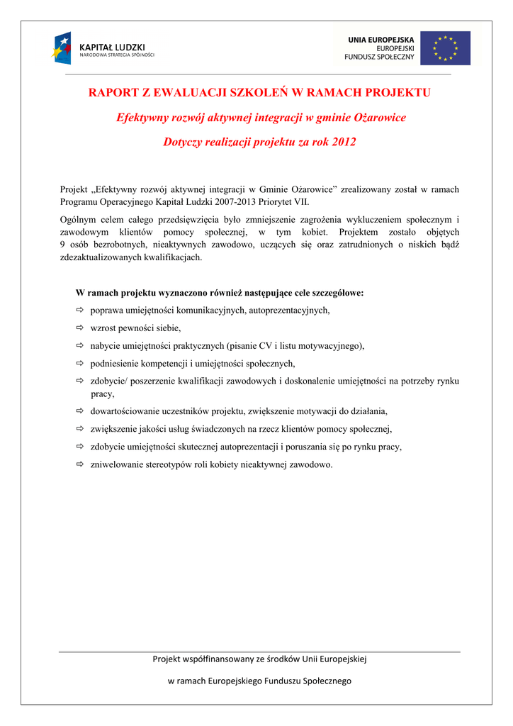 RAPORT Z EWALUACJI SZKOLEŃ W RAMACH PROJEKTU Efektywny rozwój aktywnej integracji w gminie Ożarowice Dotyczy realizacji projektu za rok 2012 Projekt „Efektywny rozwój aktywnej integracji w Gminie Ożarowice” zrealizowany został w ramach Programu Operacyjnego Kapitał Ludzki 2007-2013 Priorytet VII. Ogólnym celem całego przedsięwzięcia było zmniejszenie zagrożenia wykluczeniem społecznym i zawodowym klientów pomocy społecznej, w tym kobiet. Projektem zostało objętych 9 osób bezrobotnych, nieaktywnych zawodowo, uczących się oraz zatrudnionych o niskich bądź zdezaktualizowanych kwalifikacjach. W ramach projektu wyznaczono również następujące cele szczegółowe: poprawa umiejętności komunikacyjnych, autoprezentacyjnych, wzrost pewności siebie, nabycie umiejętności praktycznych (pisanie CV i listu motywacyjnego), podniesienie kompetencji i umiejętności społecznych, zdobycie/ poszerzenie kwalifikacji zawodowych i doskonalenie umiejętności na potrzeby rynku pracy, dowartościowanie uczestników projektu, zwiększenie motywacji do działania, zwiększenie jakości usług świadczonych na rzecz klientów pomocy społecznej, zdobycie umiejętności skutecznej autoprezentacji i poruszania się po rynku pracy, zniwelowanie stereotypów roli kobiety nieaktywnej zawodowo. Projekt współfinansowany ze środków Unii Europejskiej w ramach Europejskiego Funduszu Społecznego W ramach I etapu szkoleń przeprowadzono następujące szkolenia: 1) Szkolenie: Warsztaty aktywizacyjno- psychologiczne w liczbie 50 godzin lekcyjnych, 2) Szkolenie: Trening budowania samooceny w liczbie 10 godzin lekcyjnych, 3) Szkolenie: Trening motywacji i aktywności w liczbie 10 godzin lekcyjnych, 4) Doradztwo: Konsultacje specjalistyczne doradcze i psychologiczne z wypracowaniem Indywidualnego Planu Działania i Diagnozy Doradczej dla każdego uczestnika w liczbie 45 godzin lekcyjnych (po 5 godzin lekcyjnych na każdego uczestnika), 5) Szkolenie: z zakresu wizerunku osobistego w liczbie 15 godzin lekcyjnych, 6) Szkolenie: z zakresu równości szans kobiet i mężczyzn w liczbie 5 godzin lekcyjnych. Dla: Ośrodka Pomocy Społecznej w Ożarowicach, ul. Dworcowa 15 Organizator: ILLUSTRO Szkolenia Doradztwo Grzegorz Rippel ul. Cygana 4, 45-131 Opole Miejsce warsztatów: Ludowy Klub Sportowy PIAST w Ożarowicach, ul. Sportowa 1 Prowadzący zajęcia / trener: 1) Szkolenie Warsztaty aktywizacyjno - psychologiczne – Anna Skuza Adamczyk 2) Szkolenie Trening budowania samooceny - Anna Skuza Adamczyk 3) Szkolenie Trening motywacji i aktywności – Rafał Adamowski, Anna Skuza Adamczyk 4) Szkolnie Konsultacje specjalistyczne, doradcze i psychologiczne z Indywidualnego Planu Działania i Diagnozy Doradczej – Rafał Adamowski wypracowaniem 1) Szkolenie z zakresu wizerunku osobistego – Anna Skuza Adamczyk 2) Szkolenie z zakresu równości szans kobiet i mężczyzn – Anna Skuza Adamczyk Projekt współfinansowany ze środków Unii Europejskiej w ramach Europejskiego Funduszu Społecznego Frekwencja: 1) Szkolenie Warsztaty aktywizacyjno - psychologiczne – 100%, 2) Szkolenie Trening budowania samooceny – 100%, 3) Szkolenie Trening motywacji i aktywności – 100%, 4) Szkolnie Konsultacje specjalistyczne, doradcze i psychologiczne Indywidualnego Planu Działania i Diagnozy Doradczej – 100%, z wypracowaniem 5) Szkolenie z zakresu wizerunku osobistego – 100%, 6) Szkolenie z zakresu równości szans kobiet i mężczyzn – 100%. Opis przebiegu szkoleń w ramach I etapu: Firma ILLUSTRO Szkolenia Doradztwo Grzegorz Rippel z siedzibą w Opolu przy ul. Cygana 4, zorganizowała i przeprowadziła cykl szkoleń w ramach projektu „EFEKTYWNY ROZWÓJ AKTYWNEJ INTEGRACJI W GMINIE OŻAROWICE” zgodnie z harmonogramem ustalonym z Zamawiającym. Wszystkie szkolenia odbywały się zgodnie z przyjętym harmonogramem, w następujących godzinach odpowiednio dla każdego szkolenia: 1) Szkolenie Warsztaty aktywizacyjno - psychologiczne –w dniach: 18,19,20,21,25.26.06.2012 r. od 8:00 do 15:00, natomiast ostatniego dnia szkolenia, tj. 26.06.2012 r. od godziny 8:00 do 11:45. 2) Szkolenie Trening budowania samooceny – zajęcia rozpoczęły się w dniu 26.06.2012 r. od 12:00 do 15:15, drugi dzień szkolenia 27.06.2012 r. od 8:00 do 13:00. 3) Szkolenie Trening motywacji i aktywności – zajęcia rozpoczęły się w dniu 27.06.2012 r. od 13:00 do 15:15, drugi dzień szkolenia 28.06.2012 r. od 8:00 do 13:15. 4) Szkolenie Konsultacje specjalistyczne, doradcze i psychologiczne z wypracowaniem Indywidualnego Planu Działania i Diagnozy Doradczej zajęcia w dniach 04,05,06,09,10.07.2012 r. w godzinach od 8:00 do 16:00 podzielonych na spotkania indywidualne, codziennie po 4 osoby (każda osoba miała przeznaczone 5 godzin konsultacji). 5) Szkolenie z zakresu wizerunku osobistego – zajęcia rozpoczęły się w dniu 02.07.2012 r. od 8:00 do 15:15, drugi dzień szkolenia 03.07.2012 r. od 8:00 do 13:00. 6) Szkolenie z zakresu równości szans kobiet i mężczyzn – zajęcia rozpoczęły się w dniu 28.06.2012 r. od 13:00 do 15:15, drugi dzień szkolenia 3.07.2012 r. od 13:00 do 15:15. Początek każdego ze szkoleń wymagał wprowadzenia uczestników w zakres poruszanych zagadnień oraz nawiązania wzajemnych relacji. Po zakończeniu każdego ze szkoleń za wyjątkiem konsultacji indywidualnych uczestnicy wypełniali formularz oceny szkolenia. W indywidualnych anonimowych formularzach oceniano sposób prowadzenia zajęć, ocenę merytoryczną, sposób prowadzenia zajęć, materiały szkoleniowe, pracę trenera. Ankietowani mieli ocenić jakość zrealizowanego warsztatu w skali Projekt współfinansowany ze środków Unii Europejskiej w ramach Europejskiego Funduszu Społecznego od 1 do 5 poprzez zakreślenie odpowiedniej oceny, gdzie 1 oznacza ocenę najsłabszą, a 5 ocenę najwyższą. Ankiety pozwalały również na określenie najciekawszych bądź najmniej ciekawych zagadnień szkoleniowych oraz przeprowadzonych 