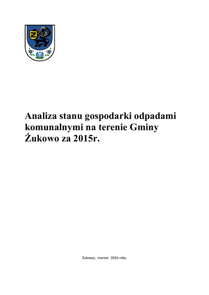 Analiza stanu gospodarki odpadami komunalnymi na terenie Gminy Żukowo za 2015r. Żukowo, marzec 2016 roku I. WSTĘP Zgodnie z art. 9tb ust. 1 ustawy z dnia 13 września 1996r. o utrzymaniu czystości i porządku w gminach,(t.j. Dz. U. z dnia 29.02.2016 r. poz. 250) jednym z zadań Gminy jest na podstawie sprawozdań złożonych przez podmioty odbierające odpady komunalne od właścicieli nieruchomości, podmioty prowadzące punkty selektywnego zbierania odpadów komunalnych oraz rocznego sprawozdania z realizacji zadań z zakresu gospodarowania odpadami komunalnymi oraz innych dostępnych danych wpływających na koszty systemu gospodarowania odpadami komunalnymi, dokonanie corocznej analizy stanu gospodarki odpadami komunalnymi, celem weryfikacji możliwości technicznych i organizacyjnych Gminy w zakresie gospodarowania odpadami komunalnymi. II. Zagadnienia ogólne. 1.Gmina Żukowo po wejściu w życie nowych przepisów w zakresie tzw. „ustawy śmieciowej” od 01. lipca 2013 r. skorzystała z ustawowej możliwości odbierania odpadów komunalnych z nieruchomości zamieszkałych. Rada Miejska Gminy Żukowo nie podjęła uchwały co do objęcia systemem zbiorowego odbioru odpadów komunalnych przez firmy świadczące usługę na zlecenie gminy z nieruchomości niezamieszkałych ( firmy, przedsiębiorstwa, podmioty działalności gospodarczej, posesje letniskowe). Odpady komunalne z tych nieruchomości nadal są odbierane przez firmy posiadające wpis do Rejestru Działalności Regulowanej na terenie gminy Żukowo, po uprzednim podpisaniu umowy pomiędzy firmą a właścicielem takiej nieruchomości. Zadanie realizowane było przez: 1) SITA Północ Sp. z o. o. ul. Trakt św. Wojciecha 43/45 tel. 58 309 00 31, fax 58 309 49 53 2) Remondis Sp. z o. o. 81-061 Gdynia ul. Hutnicza 42, z siedzibą w Warszawie, ul. Zawodzie 16 tel. 58 782 28 50 3) ELWOZ Sp. z o. o., Miechucino, Oddział Sierakowice 83-334 Miechucino, ul. Szklana 44, 83-340 Sierakowice, ul. Słupska 2, Tel. 58 681 93 97, 58 684 71 24 4) P. R. S. P.„Sanipor" Sp. z o. o. 81-300 Gdynia, ul. Sportowa 8 tel. 58 660 96 00, 58 622 14 51 5) PHU SANIKO Andrzej Koszałka ul. Ceynowy 8/1, 83-300 Kartuzy, tel. 58 685 41 66, 58 685 41 67 6) Przedsiębiorstwo Usługowe Clean-Bud Sp. j. J. Romanowski, H. Romanowska 81-601 Gdynia, ul. Halicka 10 tel./fax 58 621 47 21, 58 557 55 88 7) P. P. U. „METALPOL" Z. Kazub, R. Peta Sp. j. 84-230 Rumia, ul. Tatrzańska 11 tel./fax 58 671 52 25, 58 671 93 91 8) Spółka Komunalna ŻUKOWO Sp. z o. o. ul. 3-go Maja 5, 83-330 Żukowo, tel. 58 586 75 86 9) Firma Transportowo-Usługowa „POD SKARPĄ" Piotr Pospieszny ul. Chwaszczyńska 206, 81-571 Gdynia, tel. 58 629 93 90 10) Usługi Transportowe Stanisław Staubach ul. Miodowa 10, 77-127 Nakla, tel. 59 82 318 60, 691 866 808 11) Transport - Wywóz Śmieci Marian Flisik ul. Gdańska 24,83-330 Żukowo, tel. 58 681 85 18 12) SAPO Stanisław Klawikowski Sp. j. ul. Leszczynowa 4, 80-175 Gdańsk tel. 58 303 96 94 13) KON-TRA Sp. z o. o. ul. Narwicka 19 B, 80-557 Gdańsk tel. 58 732 22 00, fax 58 732 22 66 14) Przedsiębiorstwo Techniczno-Handlowe „PESTAR", Eugeniusz Piechowski 83-200 Starogard Gdański, ul. Iwaszkiewicza 15 tel./fax 58 562 37 19 15) GREEN-ART ACER PiotrDettlaff, 81-150 Gdynia, ul. Żelazna 16a/49 tel. 501-178-250, fax 58 74-21-610 16) ZAKŁAD OCZYSZCZANIA MIASTA, Zbigniew Strach, 42-274 Konopiska, ul. Korzonek 98. Oddział: Gdynia 81-061, ul. Hutnicza 14, tel. 58 623 12 84, 510 220 333 17) P.H.U. „JUREX" Jerzy Smoleń, ul. Goszyńska 9, 80-174 Gdańsk tel. 607-150-071, 322-14-24, 320-72-68 18) Przedsiębiorstwo Komunalne „DARPOL" Korzonek 98, 42-274 Konopiska tel. 34 366-89-83 19) „DiF" s.c. P. U. H. ul. Rzemieślnicza 2-4, 81-855 Sopot tel. 58 550-25-89 20) P. U. H. „UNIPOL" s.c. ul. Jednorożca 28C, 80-299 Gdańsk tel. 58 552-96-63 21) „IMAR" Sp. z o. o. ul. Reymonta 50, 80-290 Gdańsk tel. 58 344-60-42 22) Green Service Jolanta Skura ul. Kopernika 5, 81-846 Sopot tel.: 504-447-845, 789-353-541 23) Firma Prywatna Wielobranżowa, STACHTRANS” Stanisław Mielewczyk ul. Oliwska 48, 84-208 Kielno tel. 58 676-08-54 24) STENA Recykling Sp. z o.o Oddział Gdynia ul. Chwaszczyńska 129-149 81-571 Gdynia tel.: 58 667-01 01 25) Firma Handlowa Mazur Hanna ul. Adama Mickiewicza 37 A, 83-300 Żukowo tel.: 603-329-327 26) ALTVATER Piła Sp. z o.o w Pile Ul. Łączna 4a, 64-920 Piła, tel.: 67 212-43-52 27) Przedsiębiorstwo Usług Komunalnych Sp. z o.o Ul. Dębogórska 148, 84-230 RUMIA, tel.: 58 671-03-98 2. W okresie od 01.01.2015 roku do 31.12.2015 r. , zgodnie z ustawą o utrzymaniu czystości i porządku w gminach odbiór odpadów komunalnych i ich zagospodarowanie od właścicieli nieruchomości zamieszkałych realizowane było na podstawie umów zawartych w 2014r. , których okres obowiązywania był do dnia 01.01.2015 do 31.12.2015 r., przez firmy wyłonione w drodze przetargu nieograniczonego przeprowadzonego w 2014 roku. Uchwałą z dnia 31 stycznia 2013 r. nr XXIX/306/2013 r. Rada Miejska w Żukowie zdecydowała o podziale gminy na dwa sektory, w celu zorganizowania odbioru odpadów komunalnych od właścicieli nieruchomości. Sektor I „Północny”, obejmujący sołectwa : Leźno, Pępowo, Małkowo, Miszewo, Banino, Rębiechowo, Tuchom, Nowy Świat i Chwaszczyno. Sektor II „Południowy”, obejmujący miasto Żukowo i sołectwa: Żukowo, Borkowo, Rutki, Glincz, Babi Dół, Skrzeszewo, Łapino, Widlino, Sulmin, Niestępowo, Przyjaźń i Otomino. W drodze przetargu zostały wybrane dwie firmy , które od 1 stycznia do 31 grudnia 2015 r. obsługiwały gminę Żukowo w zakresie odbieraniu odpadów komunalnych od mieszkańców. Sektor I „Północny” zgodnie z umową nr ZP-579/71/2014 z dnia 22.12.2014 r. obsługiwało Przedsiębiorstwo Robót Sanitarno-Porządkowych SANIPOR z siedzibą w Gdyni, ul. Sportowa 8. Natomiast Sektor II „Południowy” zgodnie z umowa nr ZP- 584/71/2014 z dnia 30.12.2014 r. był obsługiwany pr