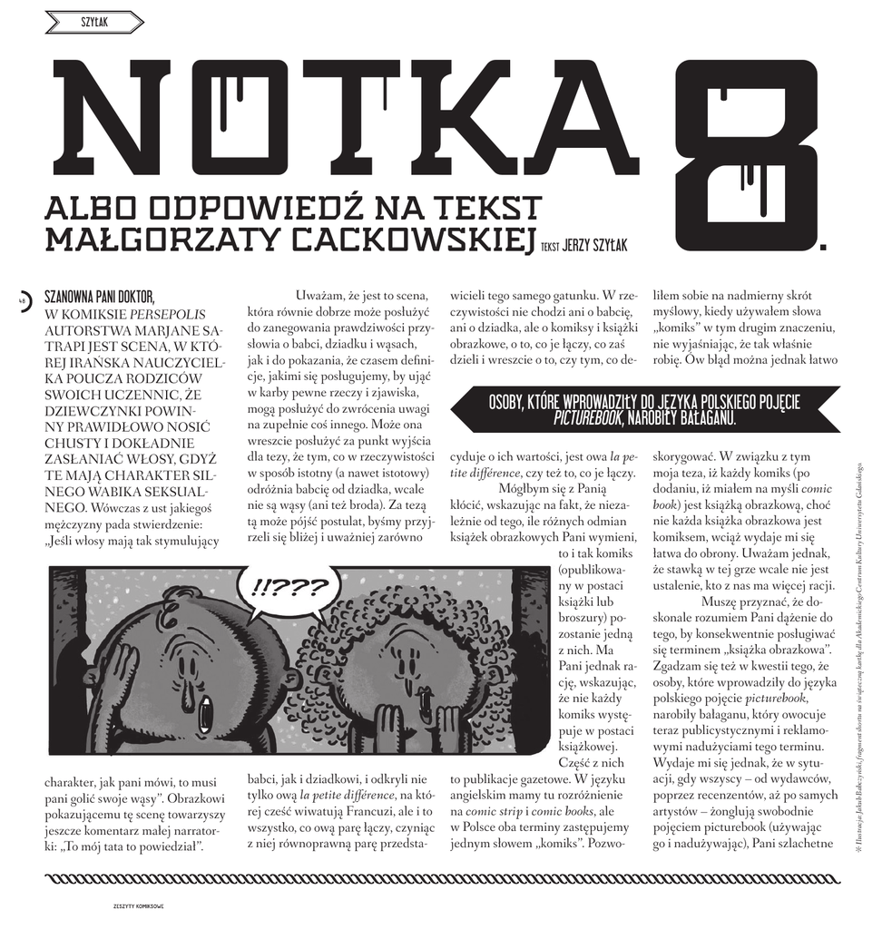 szyłak Notka albo odpowiedź na tekst Małgorzaty Cackowskiej tekst Jerzy Szyłak W komiksie Persepolis autorstwa Marjane Sa trapi jest scena, w któ rej irańska nauczyciel ka poucza rodziców swoich uczennic, że dziewczynki powin ny prawidłowo nosić chusty i dokładnie zasłaniać włosy, gdyż te mają charakter sil nego wabika seksual nego. Wówczas z ust jakiegoś mężczyzny pada stwierdzenie: „Jeśli włosy mają tak stymulujący Uważam, że jest to scena, która równie dobrze może posłużyć do zanegowania prawdziwości przysłowia o babci, dziadku i wąsach, jak i do pokazania, że czasem definicje, jakimi się posługujemy, by ująć w karby pewne rzeczy i zjawiska, mogą posłużyć do zwrócenia uwagi na zupełnie coś innego. Może ona wreszcie posłużyć za punkt wyjścia dla tezy, że tym, co w rzeczywistości w sposób istotny (a nawet istotowy) odróżnia babcię od dziadka, wcale nie są wąsy (ani też broda). Za tezą tą może pójść postulat, byśmy przyjrzeli się bliżej i uważniej zarówno charakter, jak pani mówi, to musi pani golić swoje wąsy”. Obrazkowi pokazującemu tę scenę towarzyszy jeszcze komentarz małej narratorki: „To mój tata to powiedział”. babci, jak i dziadkowi, i odkryli nie tylko ową la petite différence, na której cześć wiwatują Francuzi, ale i to wszystko, co ową parę łączy, czyniąc z niej równoprawną parę przedsta- Szanowna Pani Doktor, wicieli tego samego gatunku. W rzeczywistości nie chodzi ani o babcię, ani o dziadka, ale o komiksy i książki obrazkowe, o to, co je łączy, co zaś dzieli i wreszcie o to, czy tym, co de- . liłem sobie na nadmierny skrót myślowy, kiedy używałem słowa „komiks” w tym drugim znaczeniu, nie wyjaśniając, że tak właśnie robię. Ów błąd można jednak łatwo Osoby, które wprowadziły do języka polskiego pojęcie picturebook, narobiły bałaganu. cyduje o ich wartości, jest owa la petite différence, czy też to, co je łączy. Mógłbym się z Panią kłócić, wskazując na fakt, że niezależnie od tego, ile różnych odmian książek obrazkowych Pani wymieni, to i tak komiks (opublikowany w postaci książki lub broszury) pozostanie jedną z nich. Ma Pani jednak rację, wskazując, że nie każdy komiks występuje w postaci książkowej. Część z nich to publikacje gazetowe. W języku angielskim mamy tu rozróżnienie na comic strip i comic books, ale w Polsce oba terminy zastępujemy jednym słowem „komiks”. Pozwo- skorygować. W związku z tym moja teza, iż każdy komiks (po dodaniu, iż miałem na myśli comic book) jest książką obrazkową, choć nie każda książka obrazkowa jest komiksem, wciąż wydaje mi się łatwa do obrony. Uważam jednak, że stawką w tej grze wcale nie jest ustalenie, kto z nas ma więcej racji. Muszę przyznać, że doskonale rozumiem Pani dążenie do tego, by konsekwentnie posługiwać się terminem „książka obrazkowa”. Zgadzam się też w kwestii tego, że osoby, które wprowadziły do języka polskiego pojęcie picturebook, narobiły bałaganu, który owocuje teraz publicystycznymi i reklamowymi nadużyciami tego terminu. Wydaje mi się jednak, że w sytuacji, gdy wszyscy – od wydawców, poprzez recenzentów, aż po samych artystów – żonglują swobodnie pojęciem picturebook (używając go i nadużywając), Pani szlachetne Ilustracja: Jakub Babczyński, fragment shortu na świąteczną kartkę dla Akademickiego Centrum Kultury Uniwersytetu Gdańskiego. 48 8 szyłak Wszyscy żonglują swobodnie pojęciem picturebook. wystąpienie w obronie czystości języka polskiego może przypominać walkę z wiatrakami. Niezależnie jednak od tego, czy będziemy książki obrazkowe nazywać ich polską nazwą, czy też jej angielskim odpowiednikiem, wrzucenie do jednego worka różnych ich odmian nie przyniesie dobrego efektu. W swoim tekście z Rymsa proponowała Pani zastosowanie jednych rozróżnień, teraz proponuje Pani nieco inne (nie wykluczające jednak tych poprzednich), wśród nich zaś takie, dla którego podstawą jest – zaproponowane przez Jerome’a Brunera przeciwstawienie sobie myślenia logiczno-naukowego i narracyjnego. Ujmę to w ten sposób, w jednych książkach obrazkowych (na przykład w Majn Alef faktu, że i jedne, i drugie są książkami obrazkowymi. Niemniej owa różnica istnieje. Tam, gdzie mamy do czynienia z myśleniem narracyjnym, zasady regulujące połączenia obrazów i tekstu lub też łączenia obrazów w sekwencję narracyjną (na przykład w Gdzie jest tort? czy w Przybyszu Shauna Tana nie mamy tekstów, ale mamy do czynienia z narracją, której nośnikiem jest sekwencja obrazów). Fakt, że w książkach z jednej grupy mamy do czynienia z innymi zasadami tworzenia przekazu niż w książkach z grupy drugiej, nie powoduje wyłączenia ich ze zbioru określanego mianem „książki obrazkowe”. Dlaczego miałby zatem spowodować wyłączenie z tego zbioru komiksów, które są książkami, są obrazkowe i są Porozmawiajmy o książkach i o tym, jak objawiają się w nich prawda, piękno i dobro. Bejs – zastrzegam, że znam tę książkę tylko z Pani opisu) mamy do czynienia z myśleniem logiczno-naukowym, w innych (na przykład w Słonecznym jaju Elsy Beskow czy w książeczce Wernera Holzwartha i Wolfa Erlbrucha O małym krecie, który chciał wiedzieć, kto mu narobił na głowę) z myśleniem narracyjnym. Różnica ta nie zmienia utworami, w których obowiązują zasady tworzenia przekazu zgodnie z myśleniem narracyjnym? Notka 9., będąca dalszym ciągiem odpowiedzi na tekst Małgorzaty Cackowskiej Fakt, że dąży Pani do obalenia mojej tezy, posługując się przykładem książki Gdzie jest tort?, publikacja jest (przepraszam za wyrażenie) picturebookiem czy komiksem, ale nie róbmy z tej kwestii zasadniczego problemu. Po prostu porozmawiajmy o książkach i o tym, jak objawiają się w nich prawda, piękno i dobro. Myślę, że nikt z nas na takiej