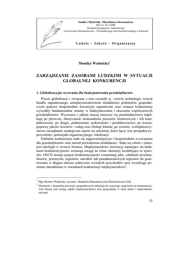 Studia i Materiały. Miscellanea Oeconomicae Rok 13, Nr 2/2009 Wydział Zarządzania i Administracji Uniwersytetu Humanistyczno – Przyrodniczego Jana Kochanowskiego w Kielcach Ludzie – Jakość – Organizacja Monika Wodnicka1 ZARZĄDZANIE ZASOBAMI LUDZKIMI W SYTUACJI GLOBALNEJ KONKURENCJI 1. Globalizacyjne wyzwania dla funkcjonowania przedsiębiorstw Proces globalizacji i związane z nim czynniki tj.: rozwój technologii, rozwój handlu zagranicznego, umiędzynarodowienie działalności podmiotów gospodarczych poprzez bezpośrednie inwestycje zagraniczne oraz rosnąca konkurencja wywołały fundamentalne zmiany w funkcjonowaniu i otoczeniu współczesnych przedsiębiorstw. Wyzwania z jakimi muszą zmierzyć się przedsiębiorstwa implikują po pierwsze, elastyczność doskonalenia procesów biznesowych i ich kompleksowość; po drugie, podniesienie zyskowności i produktywności; po trzecie, poprawę jakości towarów i usług oraz obsługi klienta; po czwarte, wielopłaszczyznowe zarządzanie strategiczne oparte na załoŜeniu, które łączy trzy perspektywy: przyszłości, potencjału organizacyjnego, lokalizacji. Globalna konkurencja stała się najpowaŜniejszym i bezpośrednim wyzwaniem dla przedsiębiorstw oraz metod prowadzenia działalności. Stała się celem i rodzajem ideologii w świecie biznesu. Międzynarodowe instytucje zajmujące się badaniem konkurencyjności zwracają uwagę na róŜne elementy kształtujące to zjawisko. OECD stosuje pojęcie konkurencyjności rozumianej jako „zdolność przedsiębiorstw, przemysłu, regionów, narodów lub ponadnarodowych regionów do generowania w długim okresie relatywnie wysokich przychodów oraz wysokiego poziomu zatrudnienia w warunkach konkurencji międzynarodowe2. 1 2 Mgr Monika Wodnicka, asystent, Akademia Humanistyczno-Ekonomiczna Łódź. ZłoŜoność i dynamika procesów gospodarczych skłaniają do szerszego spojrzenia na konkurencyjność biorąc pod uwagę aspekt międzynarodowy oraz gospodarkę w skali mikro i makroekonomicznej. 33 Analizując czynniki decydujące o konkurencyjności przedsiębiorstw zauwaŜamy, Ŝe pierwsza grupa czynników tzw. zewnętrznych wynika z polityki państwa i wykorzystywanych instrumentów, otoczenia instytucjonalnego i konkurencyjnego. Druga grupa czynników, tzw. wewnętrznych, związana jest ze sferą produkcji i zasięgiem dystrybucji, potencjałem intelektualnym zasobów ludzkich, systemem i jakością zarządzania, sferą finansowania, moŜliwościami inwestycyjnymi oraz otwartością na zmiany w celu wdraŜania nowych rozwiązań biznesowych. O konkurencyjności w coraz większym stopniu decydują jakościowe determinanty obejmujące postęp technologiczny, strategie zarządzania, elastyczność w dostosowywaniu się, czy korzyści skali. Przedsiębiorstwa chcąc dostosować się do wymogów globalizacji i globalnej konkurencji wykorzystują róŜne koncepcje (inteligentne, wirtualne, zwinne itp.)3, kierunki i elementy składowe procesów dostosowawczych w zakresie zarządzania przedsiębiorstwem i zarządzania zasobami ludzkimi. W związku z tym wyłoniło się wiele modeli przedsiębiorstw (tabela 1.). Dla przykładu jednym z nich jest Elastyczne przedsiębiorstwo promowane przez OECD jako model przedsiębiorstwa w gospodarce opartej na wiedzy. Tabela 1. Koncepcja elastycznego przedsiębiorstwa Tradycyjna firma - pojedyncze centrum zarządzania → Nowy model przedsiębiorstwa - wiele centrów zarządzania - samowystarczalne - zorientowane na doświadczenie - nacisk na skuteczność - zdywersyfikowana struktura - integracja pionowa - nacisk na elastyczność - zunifikowana struktura - niezaleŜne jednostki organizacyjne Źródło: H. Bahrami, The Empowering Flexible Organization, OECD, 1996, s. 18. W tym miejscu naleŜy podkreślić, Ŝe nie zawsze tworzenie modelowych rozwiązań sprawdza się w praktyce. Powodem moŜe być proces zarządzania przedsiębiorstwem, który często jest zbiorem procesów, róŜne strategie w tym strategia w obszarze zasobów ludzkich oraz struktury organizacyjne. Proces dostosowawczy do warunków globalizacji powinien być elastyczną kombinacją wielu elemen- 3 Szerzej w: I. Hejduk, W. Grudzewski, Przedsiębiorstwo przyszłości, Difin, Warszawa 2000. 34 tów4 wykorzystanych przy tworzeniu strategii biznesowej przedsiębiorstwa na rynku międzynarodowym (tabela 2.). Tabela 2. Elementy składowe procesów dostosowawczych w zakresie zarządzania przedsiębiorstwem. Kierunki dostosowań Wirtualizacja struktur Uelastycznienie systemów pracy Kreowanie wiedzy organizacji Wprowadzanie e-biznesu Odpowiedzialność społeczna przedsiębiorstwa Sposoby dostosowań - outsourcing/ offshoring - kontraktowanie - tworzenie sieci - alianse - kontrakty - telepraca - elastyczne systemy motywacyjne - pakietowe wynagradzanie - kafeteryjne wynagradzanie - uczenie się zmian - zarządzanie wiedzą - nabywanie nowych umiejętności - rezygnacja z niektórych tradycyjnych funkcji zarządzania - jakość - etyka - nadzór korporacyjny Źródło: opracowanie własne na podstawie G. Gierszewska, B. Wawrzyniak, Globalizacja. Wyzwania dla zarządzania strategicznego, Poltex, Warszawa 2001, s. 80. Strategia biznesowa przedsiębiorstwa wyznacza kierunek tworzenia strategii funkcjonalnych, w tym takŜe strategii zarządzania zasobami ludzkimi i powinna być odpowiedzią na wyzwania związane z nasilającą się konkurencją i zmiennością otoczenia. Przedsiębiorstwa, którym udało się w procesie zarządzania uczynić z działań personalnych skuteczne narzędzie wspierania realizacji strategii odnoszą sukcesy rynkowe5. Biorąc pod uwagę, Ŝe kapitał ludzki to najwaŜniejszy element kapitału intelektualnego organizacji i jest on głównym motorem sukcesu, innowacji i zmian w firmie6 wiele przedsiębiorstw pozyskuje pracowników o wysokich kwalifikacjach poprzez umiędzynarodowienie swojej działalności, np. poprzez offshoring. 4 5 6 G.S. Yip, Strategia globalna