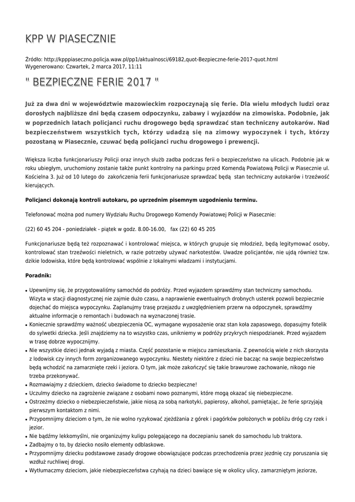 KPP W PIASECZNIE Źródło: http://kpppiaseczno.policja.waw.pl/pp1/aktualnosci/69182,quot-Bezpieczne-ferie-2017-quot.html Wygenerowano: Czwartek, 2 marca 2017, 11:11 " BEZPIECZNE FERIE 2017 " Już za dwa dni w województwie mazowieckim rozpoczynają się ferie. Dla wielu młodych ludzi oraz dorosłych najbliższe dni będą czasem odpoczynku, zabawy i wyjazdów na zimowiska. Podobnie, jak w poprzednich latach policjanci ruchu drogowego będą sprawdzać stan techniczny autokarów. Nad bezpieczeństwem wszystkich tych, którzy udadzą się na zimowy wypoczynek i tych, którzy pozostaną w Piasecznie, czuwać będą policjanci ruchu drogowego i prewencji. Większa liczba funkcjonariuszy Policji oraz innych służb zadba podczas ferii o bezpieczeństwo na ulicach. Podobnie jak w roku ubiegłym, uruchomiony zostanie także punkt kontrolny na parkingu przed Komendą Powiatową Policji w Piasecznie ul. Kościelna 3. Już od 10 lutego do zakończenia ferii funkcjonariusze sprawdzać będą stan techniczny autokarów i trzeźwość kierujących. Policjanci dokonają kontroli autokaru, po uprzednim pisemnym uzgodnieniu terminu. Telefonować można pod numery Wydziału Ruchu Drogowego Komendy Powiatowej Policji w Piasecznie: (22) 60 45 204 - poniedziałek - piątek w godz. 8.00-16.00, fax (22) 60 45 205 Funkcjonariusze będą też rozpoznawać i kontrolować miejsca, w których grupuje się młodzież, będą legitymować osoby, kontrolować stan trzeźwości nieletnich, w razie potrzeby używać narkotestów. Uwadze policjantów, nie ujdą również tzw. dzikie lodowiska, które będą kontrolować wspólnie z lokalnymi władzami i instytucjami. Poradnik: ● Upewnijmy się, że przygotowaliśmy samochód do podróży. Przed wyjazdem sprawdźmy stan techniczny samochodu. Wizyta w stacji diagnostycznej nie zajmie dużo czasu, a naprawienie ewentualnych drobnych usterek pozwoli bezpiecznie dojechać do miejsca wypoczynku. Zaplanujmy trasę przejazdu z uwzględnieniem przerw na odpoczynek, sprawdźmy aktualne informacje o remontach i budowach na wyznaczonej trasie. ● Koniecznie sprawdźmy ważność ubezpieczenia OC, wymagane wyposażenie oraz stan koła zapasowego, dopasujmy fotelik do sylwetki dziecka. Jeśli znajdziemy na to wszystko czas, unikniemy w podróży przykrych niespodzianek. Przed wyjazdem w trasę dobrze wypocznijmy. ● Nie wszystkie dzieci jednak wyjadą z miasta. Część pozostanie w miejscu zamieszkania. Z pewnością wiele z nich skorzysta z lodowisk czy innych form zorganizowanego wypoczynku. Niestety niektóre z dzieci nie bacząc na swoje bezpieczeństwo będą wchodzić na zamarznięte rzeki i jeziora. O tym, jak może zakończyć się takie brawurowe zachowanie, nikogo nie trzeba przekonywać. ● Rozmawiajmy z dzieckiem, dziecko świadome to dziecko bezpieczne! ● Uczulmy dziecko na zagrożenie związane z osobami nowo poznanymi, które mogą okazać się niebezpieczne. ● Ostrzeżmy dziecko o niebezpieczeństwie, jakie niosą za sobą narkotyki, papierosy, alkohol, pamiętając, że ferie sprzyjają pierwszym kontaktom z nimi. ● Przypomnijmy dzieciom o tym, że nie wolno ryzykować zjeżdżania z górek i pagórków położonych w pobliżu dróg czy rzek i jezior. ● Nie bądźmy lekkomyślni, nie organizujmy kuligu polegającego na doczepianiu sanek do samochodu lub traktora. ● Zadbajmy o to, by dziecko nosiło elementy odblaskowe. ● Przypomnijmy dziecku podstawowe zasady drogowe obowiązujące podczas przechodzenia przez jezdnię czy poruszania się wzdłuż ruchliwej drogi. ● Wytłumaczmy dzieciom, jakie niebezpieczeństwa czyhają na dzieci bawiące się w okolicy ulicy, zamarzniętym jeziorze, rzece. Rady dla najmłodszych: ● Do zjeżdżania i ślizgania wybieraj tylko miejsca do tego przeznaczone, usytuowane z dala od ulicy, stawów i rzek. ● Nigdy nie ślizgaj się po zamarzniętej rzece, jeziorze - nie wiesz, jak gruba jest warstwa lodu. ● Nie wbiegaj na lód, który już się pod kimś załamał. Gdyby lód zaczął pękać, połóż się na nim, w celu rozłożenia ciężaru ciała. W przypadku, gdy lód się załamie: ● Nie wpadaj w panikę, ● Nie wykonuj zbędnych ruchów, ● Działaj szybko i zdecydowanie, ● Złap się krawędzi lodu, wykonuj nogami ruchy pływackie do czasu, aż ciało przyjmie pozycję poziomą, ● Staraj się wypełznąć na lód, ● Trzymaj się mocno podanego lub rzuconego sprzętu. ● Zawsze informuj rodziców i opiekunów o trasie dojścia i powrotu z miejsca spędzania wolnego czasu. Pamiętaj, że dzięki elementom odblaskowym będziesz lepiej widoczny dla uczestników ruchu drogowego i bezpieczniejszy. POMOCY SZUKAJ POD NUMERAMI TELEFONÓW ALARMOWYCH 997 - Policja 998 - Państwowa Straż Pożarna 999 - Pogotowie Ratunkowe 112 - numer alarmowy z telefonu komórkowego mb / wyk.mat.KSP Ocena: 0/5 (0) Tweetnij