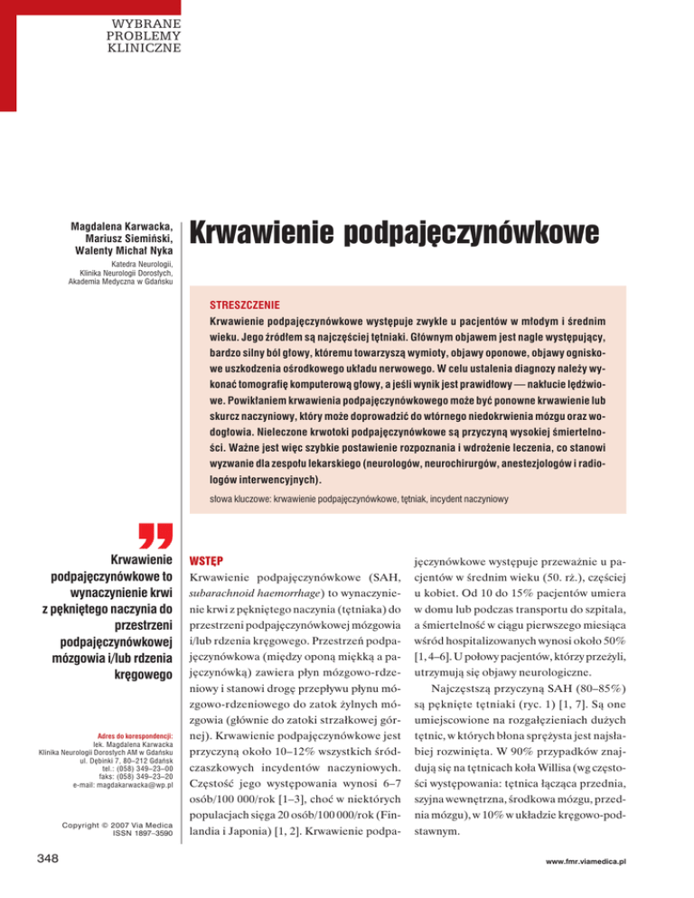 WYBRANE PROBLEMY KLINICZNE Magdalena Karwacka, Mariusz Siemiński, Walenty Michał Nyka Krwawienie podpajęczynówkowe Katedra Neurologii, Klinika Neurologii Dorosłych, Akademia Medyczna w Gdańsku STRESZCZENIE Krwawienie podpajęczynówkowe występuje zwykle u pacjentów w młodym i średnim wieku. Jego źródłem są najczęściej tętniaki. Głównym objawem jest nagle występujący, bardzo silny ból głowy, któremu towarzyszą wymioty, objawy oponowe, objawy ogniskowe uszkodzenia ośrodkowego układu nerwowego. W celu ustalenia diagnozy należy wykonać tomografię komputerową głowy, a jeśli wynik jest prawidłowy — nakłucie lędźwiowe. Powikłaniem krwawienia podpajęczynówkowego może być ponowne krwawienie lub skurcz naczyniowy, który może doprowadzić do wtórnego niedokrwienia mózgu oraz wodogłowia. Nieleczone krwotoki podpajęczynówkowe są przyczyną wysokiej śmiertelności. Ważne jest więc szybkie postawienie rozpoznania i wdrożenie leczenia, co stanowi wyzwanie dla zespołu lekarskiego (neurologów, neurochirurgów, anestezjologów i radiologów interwencyjnych). słowa kluczowe: krwawienie podpajęczynówkowe, tętniak, incydent naczyniowy Krwawienie podpajęczynówkowe to wynaczynienie krwi z pękniętego naczynia do przestrzeni podpajęczynówkowej mózgowia i/lub rdzenia kręgowego Adres do korespondencji: lek. Magdalena Karwacka Klinika Neurologii Dorosłych AM w Gdańsku ul. Dębinki 7, 80–212 Gdańsk tel.: (058) 349–23–00 faks: (058) 349–23–20 e-mail: [email protected] Copyright © 2007 Via Medica ISSN 1897–3590 348 WSTĘP jęczynówkowe występuje przeważnie u pa- Krwawienie podpajęczynówkowe (SAH, cjentów w średnim wieku (50. rż.), częściej subarachnoid haemorrhage) to wynaczynie- u kobiet. Od 10 do 15% pacjentów umiera nie krwi z pękniętego naczynia (tętniaka) do w domu lub podczas transportu do szpitala, przestrzeni podpajęczynówkowej mózgowia a śmiertelność w ciągu pierwszego miesiąca i/lub rdzenia kręgowego. Przestrzeń podpa- wśród hospitalizowanych wynosi około 50% jęczynówkowa (między oponą miękką a pa- [1, 4–6]. U połowy pacjentów, którzy przeżyli, jęczynówką) zawiera płyn mózgowo-rdze- utrzymują się objawy neurologiczne. niowy i stanowi drogę przepływu płynu mó- Najczęstszą przyczyną SAH (80–85%) zgowo-rdzeniowego do zatok żylnych mó- są pęknięte tętniaki (ryc. 1) [1, 7]. Są one zgowia (głównie do zatoki strzałkowej gór- umiejscowione na rozgałęzieniach dużych nej). Krwawienie podpajęczynówkowe jest tętnic, w których błona sprężysta jest najsła- przyczyną około 10–12% wszystkich śród- biej rozwinięta. W 90% przypadków znaj- czaszkowych incydentów naczyniowych. dują się na tętnicach koła Willisa (wg często- Częstość jego występowania wynosi 6–7 ści występowania: tętnica łącząca przednia, osób/100 000/rok [1–3], choć w niektórych szyjna wewnętrzna, środkowa mózgu, przed- populacjach sięga 20 osób/100 000/rok (Fin- nia mózgu), w 10% w układzie kręgowo-pod- landia i Japonia) [1, 2]. Krwawienie podpa- stawnym. www.fmr.viamedica.pl Magdalena Karwacka, Mariusz Siemiński, Walenty Michał Nyka Krwawienie podpajęczynówkowe Tabela 1 Przyczyny krwawienia podpajęczynówkowego [1, 11–13] Zapalne uszkodzenie tętnic mózgu t tętniaki grzybicze t borelioza t choroba Behçeta t pierwotne zapalenie naczyń Z badań autopsyjnych wynika, że 3–4% populacji jest nosicielem tętniaka t zapalenie wielotętnicze guzkowe t zespół Churga-Straussa t ziarniniak Wegenera Niezapalne uszkodzenia tętnic mózgu t rozwarstwienie ściany tętnicy t anomalie tętniczo-żylne Rycina 1. Pękający tętniak t tętniaki wrzecionowate t mózgowe przetoki tętniczo-żylne t naczyniak jamisty Z badań autopsyjnych wynika, że 3–4% populacji jest nosicielem tętniaka (8–10 mln osób w Stanach Zjednoczonych). Dla porów- t zakrzepica zatok żylnych t angiopatia amyloidowa t choroba moya-moya Anemia sierpowata, koagulopatie nania — częstość krwotoku podpajęczynówkowego w Stanach Zjednoczonych wynosi tylko 25 000–30 000 rocznie. Krwawienie z tętniaków workowatych Guzy: t krwotok do przysadki t przerzuty do mózgu śluzaka serca t glejak złośliwy wiąże się ze współwystępowaniem czynników t nerwiak nerwu słuchowego ryzyka: nadciśnienia tętniczego, palenia tyto- t naczyniakotłuszczak niu, nadużywania alkoholu [8]. Czynniki te są t oponiak odpowiedzialne za 2/3 krwawień, natomiast t haemangioblastoma czynniki genetyczne za 1/10. Tętniaki wystę- t czerniak ogona końskiego pujące rodzinnie często towarzyszą innym schorzeniom: wielotorbielowatości nerek (tętniaki u 10% chorych) [9], zespołowi Eh- Leki i narkotyki: t kokaina t leki przeciwkrzepliwe lersa-Danlosa, zespołowi Marfana, dysplazji włóknistej mięśni. Genami odpowiedzialnymi są geny kodujące elementy macierzy ze- miejscowy lub rozlany, najczęściej w oko- wnątrzkomórkowej. Do pęknięcia tętniaka licy potylicznej. Ból ten pacjenci określają może doprowadzić nagły wzrost ciśnienia jako bardzo silny, jakiego nigdy w życiu nie tętniczego, który występuje w trakcie dźwiga- doświadczyli. U 30% pacjentów ból jest nia ciężaru, defekacji, stosunku płciowego jednostronny. U 1/3 pacjentów jest to jedy- czy urazu głowy [10]. ny objaw choroby. Spośród pacjentów zgła- Inne, rzadsze przyczyny SAH wymieniono w tabeli 1. Najbardziej charakterystycznym objawem SAH jest nagły, bardzo silny ból głowy, miejscowy lub rozlany, najczęściej w okolicy potylicznej szających się z bólem głowy do lekarza krwawienie podpajęczynówkowe występuje u co dziesiątej osoby. Najbardziej zna- OBJAWY mienne jest jednak nagłe wystąpienie bólu Najbardziej charakterystycznym objawem o znacznym natężeniu. Bólowi głowy może SAH jest nagły, bardzo silny ból głowy, towarzyszyć światłowstręt. U 50% pacjen- Forum Medycyny Rodzinnej 2007, tom 1,