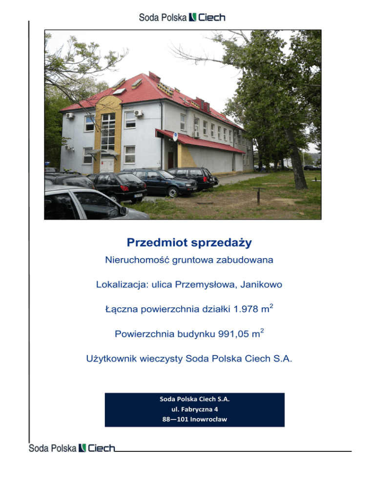 Przedmiot sprzedaży Nieruchomość gruntowa zabudowana Lokalizacja: ulica Przemysłowa, Janikowo Łączna powierzchnia działki 1.978 m2 Powierzchnia budynku 991,05 m2 Użytkownik wieczysty Soda Polska Ciech S.A. Soda Polska Ciech S.A. ul. Fabryczna 4 88—101 Inowrocław Nieruchomość zabudowana przy ul. Przemysłowej w Janikowie Nieruchomość położona w pobliżu siedziby Soda Polska Ciech S.A. powierzchnia działki 1.978 m 2 b u d y n e k w o l n o s t o j ą c y, t r z y k o n d y g n a c y j n y, w d o b r y m stanie technicznym o powierzchni 991,05 m 2 2 2 2 ( 151,63m piwnica, 389,3m parter oraz 450,12m I piętro) w pełni przystosowany do prowadzenia działalności gastronomicznej przyległy parking otoczenie—wysokie drzewa 2 Nieruchomość zabudowana przy ul. Przemysłowej w Janikowie Lokalizacja Oferowana nieruchomość znajduje się w Janikowie, w przemysłowej części miasta, położona jest bezpośrednio przy ul. Przemysłowej. Nieruchomość znajduje się przy asfaltowej drodze, w otoczeniu wysokich drzew, w pobliżu budynków biurowych Soda Polska Ciech S.A oraz głównego wejścia do zakładów w Janikowie. Obok budynku znajdują się również parkingi samochodowe. W nieruchomości prowadzona jest obecnie działalność gastronomiczna (restauracja/ stołówka), a działający obok zakład przemysłowy oznacza bezpośrednie sąsiedztwo potencjalnych klientów. Ta atrakcyjna nieruchomość posiada również bezpośredni dostęp do drogi asfaltowej. 3 Nieruchomość zabudowana przy ul. Przemysłowej w Janikowie Nieruchomość Nieruchomość jest przedmiotem użytkowania wieczystego, a jej łączna powierzchnia wynosi 1978 m2. Nieruchomość uregulowana w 1 księdze wieczystej prowadzonej przez Sąd Rejonowy w Inowrocławiu V Wydział Ksiąg Wieczystych. Działka nr Obręb Powierzchnia Nr KW Janikowo 8 [0008] (m2 ) 1.666 m2 BY1I/00001397/0 1/52 Janikowo 8 [0008] 252 m2 BY1I/00001397/0 1/54 Janikowo 8 [0008] 60 m2 BY1I/00001397/0 1/37 Nieruchomość położona na terenie objętym Studium Uwarunkowań i Kierunków Zagospodarowania Przestrzennego Miasta Janikowa—Uchwała nr VII-50/2003 Rady Miejskiej w Janikowie z dnia 27 czerwca 2003 roku. Zgodnie z wypisem z rejestru gruntów (oznaczenia klas i użytków) położona jest na terenach oznaczonych /Ba–Tereny przemysłowe, BI Inne tereny zabudowane. 4