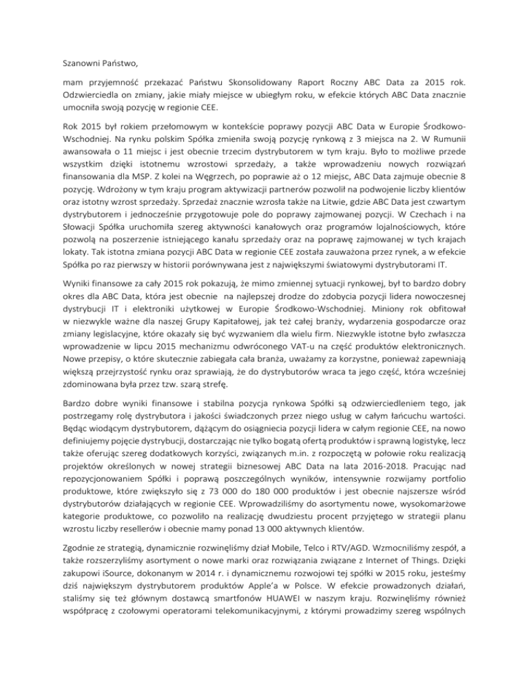 Szanowni Państwo, mam przyjemność przekazać Państwu Skonsolidowany Raport Roczny ABC Data za 2015 rok. Odzwierciedla on zmiany, jakie miały miejsce w ubiegłym roku, w efekcie których ABC Data znacznie umocniła swoją pozycję w regionie CEE. Rok 2015 był rokiem przełomowym w kontekście poprawy pozycji ABC Data w Europie ŚrodkowoWschodniej. Na rynku polskim Spółka zmieniła swoją pozycję rynkową z 3 miejsca na 2. W Rumunii awansowała o 11 miejsc i jest obecnie trzecim dystrybutorem w tym kraju. Było to możliwe przede wszystkim dzięki istotnemu wzrostowi sprzedaży, a także wprowadzeniu nowych rozwiązań finansowania dla MSP. Z kolei na Węgrzech, po poprawie aż o 12 miejsc, ABC Data zajmuje obecnie 8 pozycję. Wdrożony w tym kraju program aktywizacji partnerów pozwolił na podwojenie liczby klientów oraz istotny wzrost sprzedaży. Sprzedaż znacznie wzrosła także na Litwie, gdzie ABC Data jest czwartym dystrybutorem i jednocześnie przygotowuje pole do poprawy zajmowanej pozycji. W Czechach i na Słowacji Spółka uruchomiła szereg aktywności kanałowych oraz programów lojalnościowych, które pozwolą na poszerzenie istniejącego kanału sprzedaży oraz na poprawę zajmowanej w tych krajach lokaty. Tak istotna zmiana pozycji ABC Data w regionie CEE została zauważona przez rynek, a w efekcie Spółka po raz pierwszy w historii porównywana jest z największymi światowymi dystrybutorami IT. Wyniki finansowe za cały 2015 rok pokazują, że mimo zmiennej sytuacji rynkowej, był to bardzo dobry okres dla ABC Data, która jest obecnie na najlepszej drodze do zdobycia pozycji lidera nowoczesnej dystrybucji IT i elektroniki użytkowej w Europie Środkowo-Wschodniej. Miniony rok obfitował w niezwykle ważne dla naszej Grupy Kapitałowej, jak też całej branży, wydarzenia gospodarcze oraz zmiany legislacyjne, które okazały się być wyzwaniem dla wielu firm. Niezwykle istotne było zwłaszcza wprowadzenie w lipcu 2015 mechanizmu odwróconego VAT-u na część produktów elektronicznych. Nowe przepisy, o które skutecznie zabiegała cała branża, uważamy za korzystne, ponieważ zapewniają większą przejrzystość rynku oraz sprawiają, że do dystrybutorów wraca ta jego część, która wcześniej zdominowana była przez tzw. szarą strefę. Bardzo dobre wyniki finansowe i stabilna pozycja rynkowa Spółki są odzwierciedleniem tego, jak postrzegamy rolę dystrybutora i jakości świadczonych przez niego usług w całym łańcuchu wartości. Będąc wiodącym dystrybutorem, dążącym do osiągniecia pozycji lidera w całym regionie CEE, na nowo definiujemy pojęcie dystrybucji, dostarczając nie tylko bogatą ofertą produktów i sprawną logistykę, lecz także oferując szereg dodatkowych korzyści, związanych m.in. z rozpoczętą w połowie roku realizacją projektów określonych w nowej strategii biznesowej ABC Data na lata 2016-2018. Pracując nad repozycjonowaniem Spółki i poprawą poszczególnych wyników, intensywnie rozwijamy portfolio produktowe, które zwiększyło się z 73 000 do 180 000 produktów i jest obecnie najszersze wśród dystrybutorów działających w regionie CEE. Wprowadziliśmy do asortymentu nowe, wysokomarżowe kategorie produktowe, co pozwoliło na realizację dwudziestu procent przyjętego w strategii planu wzrostu liczby resellerów i obecnie mamy ponad 13 000 aktywnych klientów. Zgodnie ze strategią, dynamicznie rozwinęliśmy dział Mobile, Telco i RTV/AGD. Wzmocniliśmy zespół, a także rozszerzyliśmy asortyment o nowe marki oraz rozwiązania związane z Internet of Things. Dzięki zakupowi iSource, dokonanym w 2014 r. i dynamicznemu rozwojowi tej spółki w 2015 roku, jesteśmy dziś największym dystrybutorem produktów Apple’a w Polsce. W efekcie prowadzonych działań, staliśmy się też głównym dostawcą smartfonów HUAWEI w naszym kraju. Rozwinęliśmy również współpracę z czołowymi operatorami telekomunikacyjnymi, z którymi prowadzimy szereg wspólnych projektów. Nasze działania w tym obszarze docenia rynek, czego najlepszym dowodem są przyznany spółce tytuł „Dystrybutora Roku 2015 w obszarze Mobility” oraz tytuł „Człowieka roku 2015 w obszarze Mobility”, którym wyróżniono moją osobę. Do kluczowych inicjatyw ABC Data należy intensywny rozwój działu zawansowanych usług z wartością dodaną. Rozszerzamy posiadaną ofertę rozwiązań i usług z zakresu cloud computingu. To jeden z najbardziej perspektywicznych obszarów na rynku IT – jego wartość w Polsce ma zwiększyć się z ok. 160 mln dolarów w ubiegłym roku, do 450 mln dolarów w 2019 roku. Nasza Spółka nieustannie rozwija swoją ofertę, kompetencje i narzędzia, aby być wiodącym dystrybutorem systemów i usług dostarczanych w chmurze. Z powodzeniem rozbudowujemy także nasze platformy e-commerce. Już od lat są one wiodącymi rozwiązaniami B2B na rynku dystrybucji IT. Obecnie koncentrujemy się na ich optymalizacji i rozbudowie o funkcjonalności wspierające aktywną sprzedaż oferty ABC Data przez resellerów. Powiększamy też portfolio rozwiązań umożliwiających dotarcie do szerszego grona klientów biznesowych, np. nowoczesne platformy mobilne czy lekkie platformy marketplace’owe. Pracując nad rozwojem oferowanych usług i posiadanych narzędzi, zdobywamy kolejne kontrakty w regionie, zarówno nawiązując współpracę z nowymi, uznanymi producentami, jak też rozszerzając na kolejne kraje dotychczasowe umowy. Rynek zauważa i docenia korzyści ze współpracy z dużym regionalnym dystrybutorem. Dla producenta skala działania dystrybutora, z którym współpracuje, ma kluczowe znaczenie, ponieważ znacznie zwiększa ona potencjał dotarcia do nowych klientów oraz wspólnej ekspansji na nowe rynki. ABC Data ma w tym względzie szczególnie wiele do zaoferowania, ponieważ jako jedyny polski dystrybutor IT jest obecna na ośmiu rynkach Europy Środkowo-Wschodniej. Posiadamy w oferci
