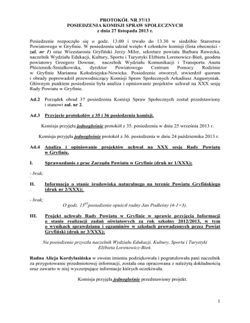 PROTOKÓŁ NR 37/13 POSIEDZENIA KOMISJI SPRAW SPOŁECZNYCH z dnia 27 listopada 2013 r. Posiedzenie rozpoczęło się o godz. 13.00 i trwało do 13.30 w siedzibie Starostwa Powiatowego w Gryfinie. W posiedzeniu udział wzięło 4 członków komisji (lista obecności zał. nr 1) oraz Wicestarosta Gryfiński Jerzy Miler, sekretarz powiatu Barbara Rawecka, naczelnik Wydziału Edukacji, Kultury, Sportu i Turystyki Elżbieta Lorenowicz-Bień, geodeta powiatowy Grzegorz Downar, naczelnik Wydziału Komunikacji i Transportu Aneta Płóciennik-Śmiałkowska, dyrektor Powiatowego Centrum Pomocy Rodzinie w Gryfinie Marianna Kołodziejska-Nowicka. Posiedzenie otworzył, stwierdził quorum i obrady poprowadził przewodniczący Komisji Spraw Społecznych Arkadiusz Augustyniak. Głównym punktem posiedzenia była analiza i opiniowanie projektów uchwał na XXX sesję Rady Powiatu w Gryfinie. Ad.2 Porządek obrad 37 posiedzenia Komisji Spraw Społecznych został przedstawiony i stanowi zał. nr 2. Ad.3 Przyjęcie protokołów z 35 i 36 posiedzenia komisji. Komisja przyjęła jednogłośnie protokół z 35. posiedzenia w dniu 25 września 2013 r. Komisja przyjęła jednogłośnie protokół z 36. posiedzenia w dniu 24 października 2013 r. Ad.4 Analiza i opiniowanie projektów uchwał na XXX sesję Rady Powiatu w Gryfinie. I. Sprawozdanie z prac Zarządu Powiatu w Gryfinie (druk nr 1/XXX); - brak; Informacja o stanie środowiska naturalnego na terenie Powiatu Gryfińskiego (druk nr 2/XXX); II. - brak; O godz. 1505posiedzenie opuścił radny Jan Podleśny (4-1=3). III. Projekt uchwały Rady Powiatu w Gryfinie w sprawie przyjęcia Informacji o stanie realizacji zadań oświatowych za rok szkolny 2012/2013, w tym o wynikach sprawdzianu i egzaminów w szkołach prowadzonych przez Powiat Gryfiński (druk nr 3/XXX); Na posiedzenie przyszła naczelnik Wydziału Edukacji, Kultury, Sportu i Turystyki Elżbieta Lorenowicz-Bień. Radna Alicja Kordylasińska w swoim imieniu podziękowała i pogratulowała pani naczelnik za przygotowanie przedmiotowej informacji, została ona opracowana z należytą dokładnością oraz zawarto w niej wyczerpujące informacje których oczekiwała. Komisja przyjęła jednogłośnie przedstawiony projekt. 1 IV. Projekt uchwały Rady Powiatu w Gryfinie w sprawie przyjęcia Programu współpracy Powiatu Gryfińskiego z organizacjami pozarządowymi oraz podmiotami prowadzącymi działalność pożytku publicznego na 2014 rok (druk nr 4/XXX); Komisja przyjęła jednogłośnie przedstawiony projekt. Posiedzenie opuściła naczelnik Wydziału Edukacji, Kultury, Sportu i Turystyki Elżbieta Lorenowicz-Bień. V. Projekt uchwały Rady Powiatu w Gryfinie w sprawie uczestniczenia Powiatu Gryfińskiego w realizacji projektu "ZSIN – Budowa Zintegrowanego Systemu Informacji o Nieruchomościach – Faza I" (druk nr 5/XXX); Na posiedzenie przyszedł geodeta powiatowy Grzegorz Downar. Komisja przyjęła jednogłośnie przedstawiony projekt. VI. Projekt uchwały Rady Powiatu w Gryfinie w sprawie wyrażenia opinii do koncepcji zmiany granic administracyjnych pomiędzy Gminą Stare Czarnowo a Gminą Miasto Szczecin, stanowiących jednocześnie granicę Powiatu Gryfińskiego (druk nr 6/XXX); Radna Alicja Kordylasińska powiedziała, że po zapoznaniu się z projektem uchwały oraz z uzasadnieniem pojawiają się pewne wątpliwości. Mieszkańcy są za, gmina Stare Czarnowo opowiedziała się pozytywnie w tej sprawie, zapytała jak to się ma do zmian, które się z tym wiążą oraz do dokumentacji powiatu. Geodeta powiatowy Grzegorz Downar powiedział, że powiat nie ponosi z tego tytułu żadnych kosztów, ponieważ wszystkie sprawy administracyjne leżą po stronie miasta Szczecin. Miasto poniesie koszty związane bezpośrednio z dostosowaniem ewidencji, ustaleniem nowej granicy oraz stabilizacją. Być może będzie to miało znaczenie w odniesieniu do różnego rodzaju dotacji przedmiotowych jakie są liczone od ilości mieszkańców (część mieszkańców przeniesie się do innej jednostki organizacyjnej). Z drugiej strony powiat posiada nie tylko profity z ilości mieszkańców, ale również ponosi koszty z tego tytułu, być może te koszty, które są ponoszone, są większe niż te ewentualne dotacje, które na ten cel są przeznaczane. Te dwie osady są skomunikowane ze Szczecinem, a nie ze Starym Czarnowem, dlatego też z różnego rodzaju względów ekonomicznych bardziej korzystne będzie dla tych mieszkańców jeżeli będą oni „należeli” do Szczecina, a nie do Starego Czarnowa. Radna Alicja Kordylasińska zwróciła się z zapytaniem, o jakiej liczbie ludności jest mowa w tym przypadku. Geodeta powiatowy Grzegorz Downar odpowiedział, że według informacji, która została uzyskana z gminy Stare Czarnowo, jest tam zameldowanych 90 osób. Jest to jednak informacja dotycząca zameldowania w dwóch osadach, które mają być przyłączone tj. w Mazurkowie i w Sosnkowie. Miała miejsce wizja lokalna, gdzie stwierdzono, że nie wszystkie zabudowania z tych dwóch osad znajdują się w granicach gminy Stare Czarnowo. Liczba zameldowanych tam osób została podana być może na wyrost, w samych konsultacjach wzięło udział 30 osób. 2 Radna Alicja Kordylasińska zapytała, czy są znane jakieś plany miasta Szczecin co do inwestowania na tych terenach, albo w ich pobliżu. Geodeta powiatowy Grzegorz Downar odpowiedział, że osobiście tych planów nie zna, jednak z tego co można zaobserwować (analizując mapę), to w tamtym rejonie, od strony Szczecina są wydzielane bardzo cenne działki pod zabudowę. Powstaje na tym terenie aktualnie „zabudowa pałacowa”, być może część tego obszaru zostanie wykorzystana właśnie na ten cel. Należy zaznaczyć, że na ten teren nie ma planu zagospodarowania przestrzennego, taki plan powinna stworzyć gmina Stare Czarnowo, a nie miasto Szczecin. Być może w przyszłości coś tam powstanie, jednak jest to bardzo wątpliwe z tego wzglę