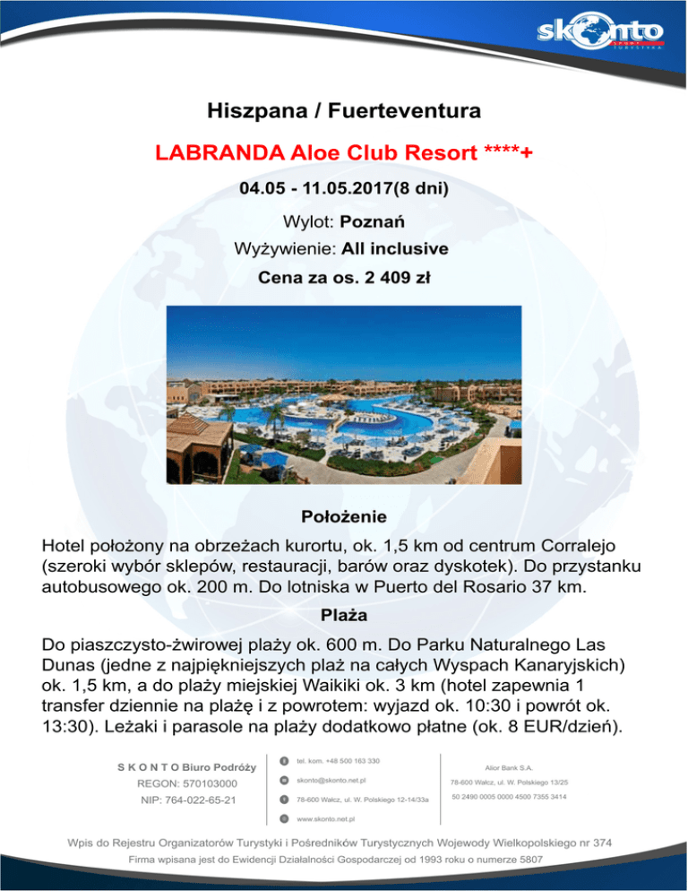 Hiszpana / Fuerteventura LABRANDA Aloe Club Resort ****+ 04.05 - 11.05.2017(8 dni) Wylot: Poznań Wyżywienie: All inclusive Cena za os. 2 409 zł Położenie Hotel położony na obrzeżach kurortu, ok. 1,5 km od centrum Corralejo (szeroki wybór sklepów, restauracji, barów oraz dyskotek). Do przystanku autobusowego ok. 200 m. Do lotniska w Puerto del Rosario 37 km. Plaża Do piaszczysto-żwirowej plaży ok. 600 m. Do Parku Naturalnego Las Dunas (jedne z najpiękniejszych plaż na całych Wyspach Kanaryjskich) ok. 1,5 km, a do plaży miejskiej Waikiki ok. 3 km (hotel zapewnia 1 transfer dziennie na plażę i z powrotem: wyjazd ok. 10:30 i powrót ok. 13:30). Leżaki i parasole na plaży dodatkowo płatne (ok. 8 EUR/dzień). Hotel zapewnia ręczniki plażowe (depozyt ok. 10 EUR/os, wymiana płatna). Do dyspozycji gości Hotel wybudowany został w 2005 r.Recepcja z lobby, restauracja, snack bar, bar przy basenie, taras słoneczny w ogrodzie palmowym, 4 baseny w tym 2 brodziki (w basenach słodka woda, 1 basen podgrzewany zimą), mini klub i plac zabaw dla dzieci, pralnia (płatna), wypożyczalnia samochodów. Istnieje możliwość dopłaty do strefy Premium (ok. 20 Eur/os dziennie): taras słoneczny z 2 basenami przeznaczonymi tylko dla Klientów, którzy dopłacili do strefy Premium (jeden z basenów podgrzewany zimą), bar witaminowy z naturalnymi sokami, 1 x na tydzień wstęp do strefy wellness (jacuzzi, sauna, bicze wodne), 1 lunch lub kolacja w restauracji włoskiej - konieczna wcześniejsza rezerwacja. Pokoje W hotelu znajduje się 180 pokoi rożnego typu. Wszystkie przestronne, wygodne i funkcjonalnie wyposażone, klimatyzowane, z łazienką (suszarka do włosów do wypożyczenia w recepcji - depozyt ok. 10 EUR, ilość suszarek limitowana), telefonem, TV-sat, sejfem (płatny ok.15 EUR/tydzień + 10 EUR depozyt), balkonem lub tarasem. Łóżeczko dla dziecka do 2 lat - płatne (ok. 16 EUR/tydzień + depozyt 30 EUR). Apartament z 1 sypialnią - dla max. 4 osób, osobna sypialnia, pokój dzienny z rozkładaną sofą, aneks kuchenny (sprzęt kuchenny płatny dodatkowo: czajnik (ok. 8 EUR/tydzień + depozyt 20 EUR), ekspres do kawy (ok. 10 EUR/tydzień + depozyt 20 EUR). Możliwość dopłaty do widoku na basen. Wyżywienie All Inclusive: śniadania (8:00-10:00), obiady (13:00-14:30), obiadokolacje tematyczne (19:00-21:00) serwowane w formie bufetu. W ciągu dnia w wyznaczonych barach serwowane przekąski oraz lokalne napoje alkoholowe i bezalkoholowe (10:30-23:00). Program sportowy i animacyjny Bogaty dzienny program animacyjny dla dzieci i dorosłych, wieczorne show. Bezpłatnie: ping-pong, aerobik, boisko multisportowe, rzutki, niewielka siłownia. Zabiegi na twarz i ciało w hotelowym Spa oraz strefa wellness płatne dodatkowo. Internet Na terenie całego hotelu Wi-Fi bezpłatne.