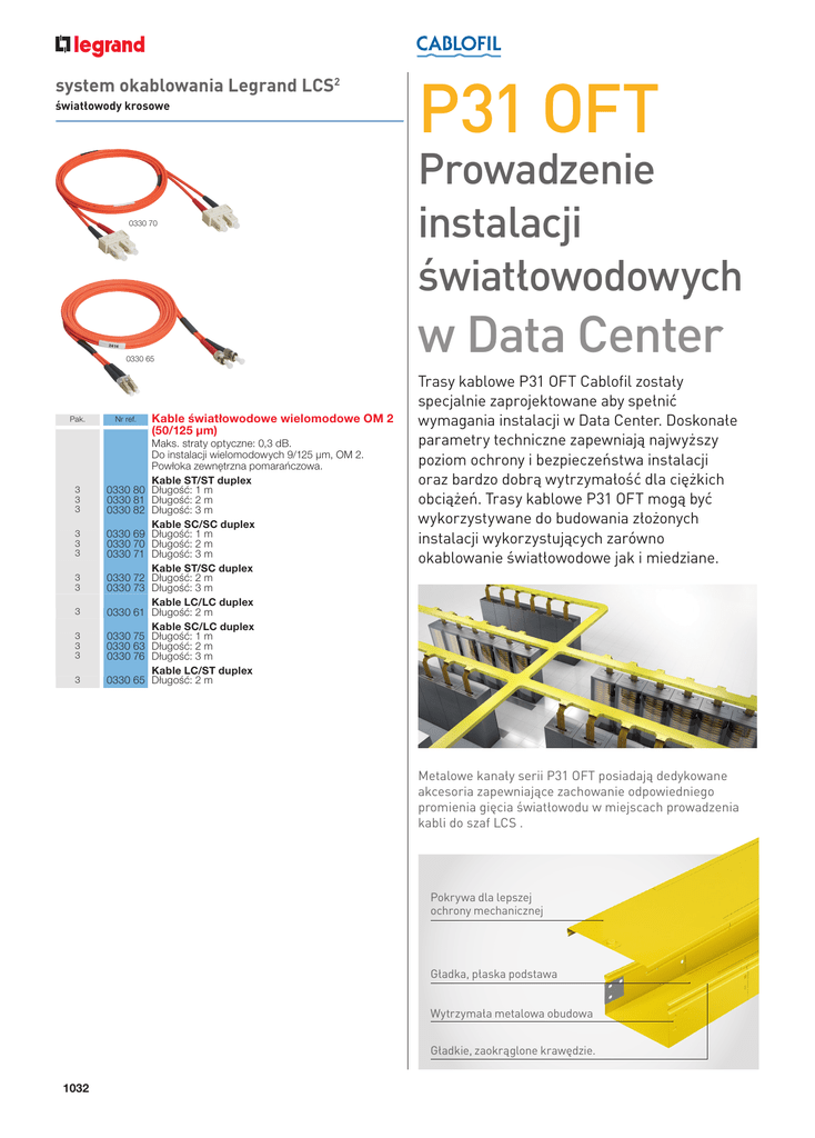 system okablowania Legrand LCS2 światłowody krosowe 0330 70 0330 65 Pak. Nr ref. 3 3 3 0330 80 0330 81 0330 82 3 3 3 0330 69 0330 70 0330 71 3 3 0330 72 0330 73 3 0330 61 3 3 3 0330 75 0330 63 0330 76 3 0330 65 Kable światłowodowe wielomodowe OM 2 (50/125 µm) Maks. straty optyczne: 0,3 dB. Do instalacji wielomodowych 9/125 µm, OM 2. Powłoka zewnętrzna pomarańczowa. Kable ST/ST duplex Długość: 1 m Długość: 2 m Długość: 3 m Kable SC/SC duplex Długość: 1 m Długość: 2 m Długość: 3 m Kable ST/SC duplex Długość: 2 m Długość: 3 m Kable LC/LC duplex Długość: 2 m Kable SC/LC duplex Długość: 1 m Długość: 2 m Długość: 3 m Kable LC/ST duplex Długość: 2 m P31 OFT Prowadzenie instalacji światłowodowych w Data Center Trasy kablowe P31 OFT Cablofil zostały specjalnie zaprojektowane aby spełnić wymagania instalacji w Data Center. Doskonałe parametry techniczne zapewniają najwyższy poziom ochrony i bezpieczeństwa instalacji oraz bardzo dobrą wytrzymałość dla ciężkich obciążeń. Trasy kablowe P31 OFT mogą być wykorzystywane do budowania złożonych instalacji wykorzystujących zarówno okablowanie światłowodowe jak i miedziane. Metalowe kanały serii P31 OFT posiadają dedykowane akcesoria zapewniające zachowanie odpowiedniego promienia gięcia światłowodu w miejscach prowadzenia kabli do szaf LCS . Pokrywa dla lepszej ochrony mechanicznej Gładka, płaska podstawa Wytrzymała metalowa obudowa Gładkie, zaokrąglone krawędzie. 1032