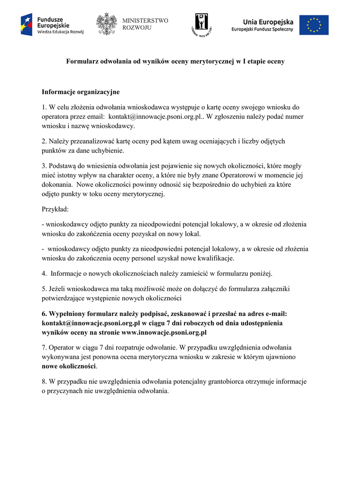 Formularz odwołania od wyników oceny merytorycznej w I etapie oceny Informacje organizacyjne 1. W celu złożenia odwołania wnioskodawca występuje o kartę oceny swojego wniosku do operatora przez email: [email protected].. W zgłoszeniu należy podać numer wniosku i nazwę wnioskodawcy. 2. Należy przeanalizować kartę oceny pod kątem uwag oceniających i liczby odjętych punktów za dane uchybienie. 3. Podstawą do wniesienia odwołania jest pojawienie się nowych okoliczności, które mogły mieć istotny wpływ na charakter oceny, a które nie były znane Operatorowi w momencie jej dokonania. Nowe okoliczności powinny odnosić się bezpośrednio do uchybień za które odjęto punkty w toku oceny merytorycznej. Przykład: - wnioskodawcy odjęto punkty za nieodpowiedni potencjał lokalowy, a w okresie od złożenia wniosku do zakońćzenia oceny pozyskał on nowy lokal. - wnioskodawcy odjęto punkty za nieodpowiedni potencjał lokalowy, a w okresie od złożenia wniosku do zakończenia oceny personel uzyskał nowe kwalifikacje. 4. Informacje o nowych okolicznościach należy zamieścić w formularzu poniżej. 5. Jeżeli wnioskodawca ma taką możliwość może on dołączyć do formularza załączniki potwierdzające występienie nowych okoliczności 6. Wypełniony formularz należy podpisać, zeskanować i przesłać na adres e-mail: [email protected] w ciągu 7 dni roboczych od dnia udostępnienia wyników oceny na stronie www.innowacje.psoni.org.pl 7. Operator w ciągu 7 dni rozpatruje odwołanie. W przypadku uwzględnienia odwołania wykonywana jest ponowna ocena merytoryczna wniosku w zakresie w którym ujawniono nowe okoliczności. 8. W przypadku nie uwzględnienia odwołania potencjalny grantobiorca otrzymuje informacje o przyczynach nie uwzględnienia odwołania. Informacja o wystąpieniu nowych okoliczności 1. Wnioskodawca (imię i nazwisko/nazwa): 2.Tytuł innowacji społecznej: 3. Numer innowacji 4. Informacja o nowych okolicznościach Kryterium oceny Uwagi oceniających, za które odjęto punkty, co do których pojawiły się nowe okoliczności Informacja o charakterze nowych okoliczności Kryterium rzeczywistych potrzeb Kryterium relacji pomysł-możliwość wdrożenia Kryterium efektywności wykorzystania zasobów Kryterium potencjału do działania Kryterium nowatorstwa Załączniki potwierdzające wystąpienie nowych okoliczności (jeżeli dotyczy) 1. 2. 3. Data i podpis wnioskodawcy