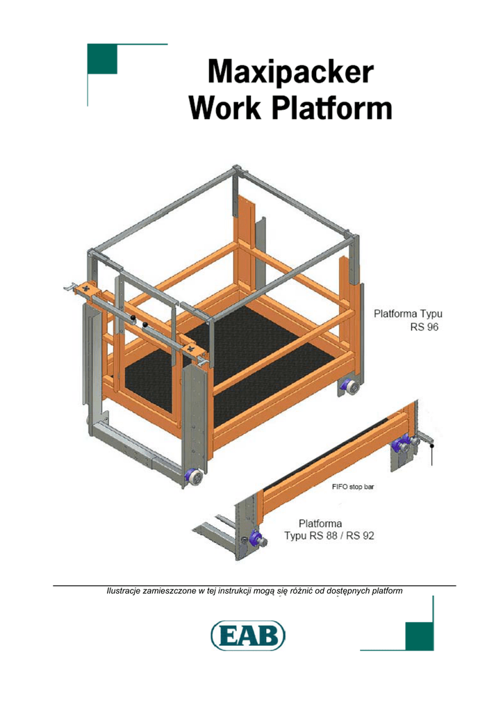 Ilustracje zamieszczone w tej instrukcji mogą się różnić od dostępnych platform Pod żadnym pozorem nie można pozwolić na przebywanie na platformie roboczej podczas transportu oraz MAX. podnoszenia. Kask ochronny, uprząż bezpieczeństwa, OBCIĄŻENIE powinny być używane przez cały czas pracy z platformą. 500 KG Jeżeli platforma będzie używana na najwyższym poziomie regałów należy zachować środki ostrożności. Przepisy bezpieczeństwa Przed przystąpieniem do pracy z platformą, powinny zostać sprawdzone wysokość i rozstaw kół na wypadek, jeśli będą wymagały przystosowania do toru pracy, na którym będzie się poruszała platforma. Wysokość może być regulowana do 600 mm ( 23”). Proszę się odnieść do strony 4 poniższej instrukcji. Jeżeli platforma jest używana podczas montażu regałów, zderzaki końcowe muszą być zamontowane na szynach, na których znajdują się rolki platformy. Przed wejściem do regałów, musi to zostać sprawdzone. Artykuły, palety, czy jakiekolwiek inne elementy, które będą składowane, muszą zostać zabezpieczone. Platforma robocza może być używana tak długo, dopóki nie jest przekraczana jej maksymalna ładowność. Jeśli Maxipacker / Radioshuttle ulegnie awarii pomiędzy regałami, żadna inna maszyna nie może się znajdować w tym kanale podczas naprawy. Jeśli to nie jest możliwe, wszyscy operatorzy powinni zostać poinformowani o miejscu, w którym się znajduje i nie powinni wybierać tego adresu z jakiegokolwiek nadajnika radiowego. Żadna z maszyn nie może być używana na sąsiadujących kanałach. Praca wewnątrz regału może odbywać się jedynie w trybie ręcznym. Użytkowanie na górnych poziomach składowania Jeżeli regały nie są wyposażone w wydłużone kolumny przednie, platforma nie może być używana na najwyższym poziomie. Powód tego jest taki, że nie może być użyta belka bezpieczeństwa w celu uniknięcia przetoczenia się platformy w sekcji podczas wchodzenia do klatki. Jeżeli wymagane wydłużone kolumny przednie są dostępne, wówczas przy ich pomocy można zabezpieczyć ramę. Kiedy praca będzie odbywała się na górnych poziomach, najpierw należy wyregulować platformę do najmniejszej wysokości. Z obu stron należy umocować ją pasami, aby uniemożliwić przesuw. W celu zabezpieczenia przed upadkiem, użytkownik powinien być przymocowany do możliwie najwyższego punktu regałów. Wersja użytkowania w niskich kanałach składowania Jeśli platforma została wyposażona w poręcze boczne o regulowanej wysokości, to ustawianie ich na wysokość najniższą jest możliwe tylko w przypadku, gdy wysokość kanału jest ograniczona. We wszystkich innych przypadkach, w szczególności przy pracy na poziomie najwyższym, boczne poręcze regulowane, powinny być umieszczone na maksymalnej wysokości. OSTRZEŻENIE podczas używania platformy RS 88 / RS 92 w systemie FIFO Tył platformy RS 88 / RS 92 jest wyposażony w rygiel bezpieczeństwa, który zapobiega wypadnięciu platformy z sekcji w systemie FIFO, po stronie rozładunku, patrz rysunek na stronie 1. Występuje szereg długości rygla bezpieczeństwa, ale tylko dla standardowych wsporników. Jeśli natomiast rama nie jest wyposażona w przedłużone wsporniki, przystosowane do używania rygla bezpieczeństwa, to musi być stosowany rygiel producenta EAB. Użytkowanie platformy Następujące instrukcje powinny być przestrzegane by zapewnić bezpieczeństwo podczas pracy z platformą lub podczas naprawy: 1) Wprowadzić Maxipaker / Radioshuttle jeśli jest taka potrzeba, w MANUAL MODE (TRYB RĘCZNY), przez naciśnięcie przycisku STOP przez 5 sekund. Jeżeli urządzenie porusza się samoistnie, wówczas przemieszcza się bardzo wolno, a trwa to tak długo dopóki zostaje wciśnięty przycisk OUT. Jeżeli urządzenie posiada możliwość zdalnego sterowania, to może ono zostać wyłączone poprzez jednokrotne naciśnięcie przycisku STOP, co najmniej przez 5 sekund, aż do wyłączenia się kontrolki ON. 2) Opróżnić kanał poniżej zablokowanego transportera. Usuwać transportery z przyległych kanałów i wtedy zablokować przyległe sekcje, tak by nie można było umieścić tam transporterów. 3) Sprawdzić czy brama platformy zamyka się i po upewnieniu się, że pozostaję zamknięta: czyścić i smarować w miarę potrzeby. Upewnić się, że podłoga platformy jest wolna od zanieczyszczeń. 4) Włóż pustą platformę do poziomu pod zablokowanym transporterem. Zawsze podnosić platformę, gdy widelce wideł są pod podłogą platformy, nigdy pod osiami kół. 5) Zakładać kask ochronny i uprząż bezpieczeństwa oraz używać klatki do podnoszenia osób w dostania się do platformy roboczej. 6) Pozostając w klatce do podnoszenia zamocować linę uprzęży bezpieczeństwa do regałów. Zluzować, odciągnąć i unieruchomić rygle bezpieczeństwa tak, aby nie dopuścić do wtoczenia się platformy do kanału. 7) Otworzyć bramę i wejść do platformy roboczej. Zamknąć bramę, dociągnąć i unieruchomić rygle bezpieczeństwa, odczepić linę. 8) Zablokować sekcję, w której platforma jest używana. 9) Wepchnąć platformę do kanału pod transporter. Uważać na głowę, jeśli wysokość kanału nie pozwala na pracę w pozycji wyprostowanej. Chwycić odpowiedni uchwyt pionowy z wyciągniętym I zabezpieczonym ryglem bezpieczeństwa. 10) Jeżeli transporter nie został wyłączony za pomocą zdalnie sterowanego wyłącznika, wyłączyć go za pomocą przedniego lub tylnego przycisku OFF. 11) W czasie pracy na platformie dozwolone jest stanie jedynie na jej podłodze. Zawsze mocuj uprząż bezpieczeństwa do regału, nigdy do platformy. 12) W przypadku, gdy nie można ponownie uruchomić transportera, należy wyciągnąć go z kanału zgodnie z poniższą instrukcją. Nigdy nie próbuj przenosić transportera na platformę roboczą. Holowanie przez Maxipacker / Radishuttle Wyłączony transport