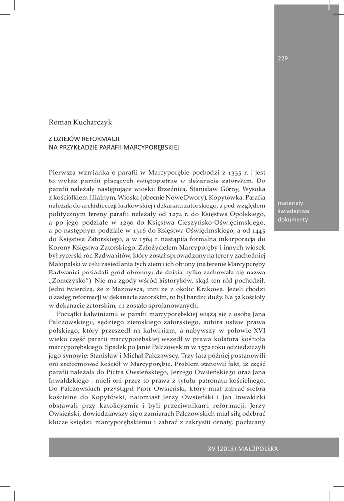 Z dziejów reformacji na przykładzie parafii marcyporębskiej 229 Roman Kucharczyk Z dziejów reformacji na przykładzie parafii marcyporębskiej Pierwsza wzmianka o parafii w Marcyporębie pochodzi z 1335 r. i jest to wykaz parafii płacących świętopietrze w dekanacie zatorskim. Do parafii należały następujące wioski: Brzeźnica, Stanisław Górny, Wysoka z kościółkiem filialnym, Wioska (obecnie Nowe Dwory), Kopytówka. Parafia należała do archidiecezji krakowskiej i dekanatu zatorskiego, a pod względem politycznym tereny parafii należały od 1274 r. do Księstwa Opolskiego, a po jego podziale w 1290 do Księstwa Cieszyńsko-Oświęcimskiego, a po następnym podziale w 1316 do Księstwa Oświęcimskiego, a od 1445 do Księstwa Zatorskiego, a w 1564 r. nastąpiła formalna inkorporacja do Korony Księstwa Zatorskiego. Założycielem Marcyporęby i innych wiosek był rycerski ród Radwanitów, który został sprowadzony na tereny zachodniej Małopolski w celu zasiedlania tych ziem i ich obrony (na terenie Marcyporęby Radwanici posiadali gród obronny; do dzisiaj tylko zachowała się nazwa „Zomczysko”). Nie ma zgody wśród historyków, skąd ten ród pochodził. Jedni twierdzą, że z Mazowsza, inni że z okolic Krakowa. Jeżeli chodzi o zasięg reformacji w dekanacie zatorskim, to był bardzo duży. Na 32 kościoły w dekanacie zatorskim, 11 zostało sprofanowanych. Początki kalwinizmu w parafii marcyporębskiej wiążą się z osobą Jana Palczowskiego, sędziego ziemskiego zatorskiego, autora ustaw prawa polskiego, który przeszedł na kalwinizm, a nabywszy w połowie XVI wieku część parafii marcyporębskiej wszedł w prawa kolatora kościoła marcyporębskiego. Spadek po Janie Palczowskim w 1572 roku odziedziczyli jego synowie: Stanisław i Michał Palczowscy. Trzy lata później postanowili oni zreformować kościół w Marcyporębie. Problem stanowił fakt, iż część parafii należała do Piotra Owsieńskiego, Jerzego Owsieńskiego oraz Jana Inwałdzkiego i mieli oni przez to prawa z tytułu patronatu kościelnego. Do Palczowskich przystąpił Piotr Owsieński, który miał zabrać srebra kościelne do Kopytówki, natomiast Jerzy Owsieński i Jan Inwałdzki obstawali przy katolicyzmie i byli przeciwnikami reformacji. Jerzy Owsieński, dowiedziawszy się o zamiarach Palczowskich miał siłą odebrać klucze księdzu marcyporębskiemu i zabrać z zakrystii ornaty, pozłacany materiały świadectwa dokumenty XV (2013) maŁopolska 230 Roman Kucharczyk krucyfiks i inne przybory kościelne, zaś Jan Inwałdzki pozwał do grodu oświęcimskiego Michła Palczowskiego w kwietniu 1576 r., iż ten „nie mając żadnego dozwolenia (...) chcąc sobie przywłaszczać a odmieniać, wiarę nową w Kościele tworzyć, role plebanii gwałtem przez poddane swe ku posiadaniu poorał”. Mimo tego Palczowscy wraz z Piotrem Owsieńskim zamienili kościół marcyporębski w zbór, wystawiając jego akt fundacyjny 24 sierpnia 1576 r., w dzień św. Bartłomieja w Brzeźnicy. Po wcześniejszym omówieniu tego aktu w Oświęcimiu wobec opiekuna kalwinizmu małopolskiego Stanisława Iwana Karnińskiego, Stanisława Witkowskiego, ministra Pawła Gilowskiego, seniorów dystryktu zatorskiego. Ministrem (proboszczem) zboru marcyporębskiego został Jakub Augustyn Philaxen. Pochodził on prwdopodobnie ze Śląska. Był żonaty, miał syna, który ożenił się z córką ministra głębowickiego (ich małżeństwo nie układało się zbyt dobrze), oraz córkę, która wyszła za Krzysztofa zwanego Mikołajem z Krakowa (byłego franciszkanina, pomagającego teściowi w zborze). Ksiądz minister Jakub Philaxen według aktu fundacyjnego „do pustej plebanii wjechał, bo żadnego bydła w niej nie było. Rola też samym owsem była osiana, ale potem on osiewek grad pobił (...) na plebanii nie zastał ksiądz Jakub sprzętów żadnych tylko dwa stoły, jeden w świetlicy, a drugi w piekarni, kur ośmioro, ceber jeden, glinianą miskę i dwie drewniane, pług z żelazy swymi, a w kościele już nie było ani srebra żadnego, ani aparatów bo to było przed jego przyjechaniem uprzątniono”. Uposażenie księdza Philaxena stanowiły: dom plebański z rolą, ogrodem, sadem i stawkami, dodatkowo dziesięcina snopowa z posiadłości Palczowskich i Piotra Owsieńskiego oraz ich poddanych, a także taczmo (danina za udzielanie sakramentów) płacone na św. Marcina. Usuniętemu plebanowi katolickiemu ks. Philaxen musiał płacić roczną pensję, gdyż zmiana proboszcza mogła nastąpić tylko po jego dobrowolnym ustąpieniu lub śmierci. Po ustanowieniu zboru marcyporębskiego Jan Inwałdzki wniósł 28 XII 1576 r. protest do grodu w Oświęcimiu przeciw Stanisławowi Palczowskiemu z Brzeźnicy, gdyż ten nie mając żadnej posiadłości w Marcyporębie „kościół tamże gwałtem dobywszy i do niego wszedłszy, zgwałcił miejsce zachowania Najświętszego Sakramentu, które zowią ciborium, porąbał i podeptał, i piłką krucyfiksowi głowę utarł wyłupawszy, na ołtarzach i indziej postawione posiekł, ołtarze potłukł, rzeczy kościelne i sprzęty tak w kościele i zakrystii, której gwałtem dobył, rozmaitem przezwiskiem nazwane tak w srebrze, w złocie, kielichy, monstrancje, krzyże, pacyfikały i insze aparaty kościelne, ornaty jedwabne, adamaszkowe, a na ostatek od mała do wiela, cokolwiek było w kościele a w zakrystii pobrał, a na wozy włożywszy do Brzeźnicy, wsi swojej zawiózł i ony na wolę swoją obrócił, księdza wedle swej woli postanowił”. Do procesu jednak nie doszło, bowiem w tydzień po wniesieniu skargi Palczowscy spotkali się z Janem Inwałdzkim i zawarli z nim umowę XV (2013) maŁopolska Z dziejów reformacji na przykładzie parafii marcyporębskiej o polubownym załatwieniu sporu, zapewne za odszkodowaniem, gdyż Inwałdzki skargę wycofał. Z powodu powołania ministra kalwińskiego również część pańszczyźnianych chłopów uciekła z par