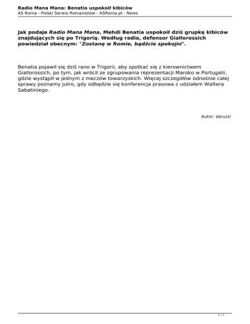 Radio Mana Mana: Benatia uspokoił kibiców AS Roma - Polski Serwis Romanistów - ASRoma.pl - News Jak podaje Radio Mana Mana, Mehdi Benatia uspokoił dziś grupkę kibiców znajdujących się po Trigorią. Według radia, defensor Giallorossich powiedział obecnym: "Zostanę w Romie, bądźcie spokojni". Benatia pojawił się dziś rano w Trigorii, aby spotkać się z kierownictwem Giallorossich, po tym, jak wrócił ze zgrupowania reprezentacji Maroko w Portugalii, gdzie wystąpił w jednym z meczów towarzyskich. Więcej szczegółów odnośnie całej sprawy poznamy jutro, gdy odbędzie się konferencja prasowa z udziałem Waltera Sabatiniego. Autor: abruzzi 1/1 Powered by TCPDF (www.tcpdf.org)