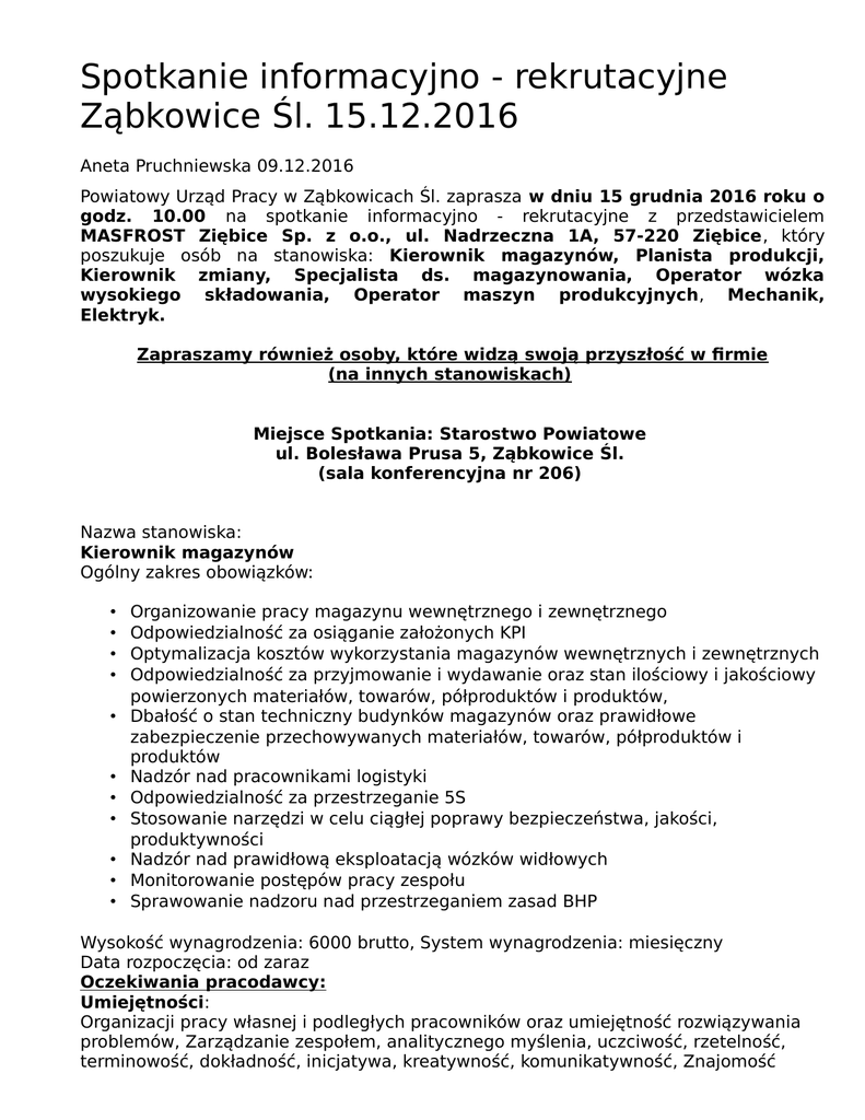 Spotkanie informacyjno - rekrutacyjne Ząbkowice Śl. 15.12.2016 Aneta Pruchniewska 09.12.2016 Powiatowy Urząd Pracy w Ząbkowicach Śl. zaprasza w dniu 15 grudnia 2016 roku o godz. 10.00 na spotkanie informacyjno - rekrutacyjne z przedstawicielem MASFROST Ziębice Sp. z o.o., ul. Nadrzeczna 1A, 57-220 Ziębice, który poszukuje osób na stanowiska: Kierownik magazynów, Planista produkcji, Kierownik zmiany, Specjalista ds. magazynowania, Operator wózka wysokiego składowania, Operator maszyn produkcyjnych, Mechanik, Elektryk. Zapraszamy również osoby, które widzą swoją przyszłość w firmie (na innych stanowiskach) Miejsce Spotkania: Starostwo Powiatowe ul. Bolesława Prusa 5, Ząbkowice Śl. (sala konferencyjna nr 206) Nazwa stanowiska: Kierownik magazynów Ogólny zakres obowiązków: • • • • • • • • • • • Organizowanie pracy magazynu wewnętrznego i zewnętrznego Odpowiedzialność za osiąganie założonych KPI Optymalizacja kosztów wykorzystania magazynów wewnętrznych i zewnętrznych Odpowiedzialność za przyjmowanie i wydawanie oraz stan ilościowy i jakościowy powierzonych materiałów, towarów, półproduktów i produktów, Dbałość o stan techniczny budynków magazynów oraz prawidłowe zabezpieczenie przechowywanych materiałów, towarów, półproduktów i produktów Nadzór nad pracownikami logistyki Odpowiedzialność za przestrzeganie 5S Stosowanie narzędzi w celu ciągłej poprawy bezpieczeństwa, jakości, produktywności Nadzór nad prawidłową eksploatacją wózków widłowych Monitorowanie postępów pracy zespołu Sprawowanie nadzoru nad przestrzeganiem zasad BHP Wysokość wynagrodzenia: 6000 brutto, System wynagrodzenia: miesięczny Data rozpoczęcia: od zaraz Oczekiwania pracodawcy: Umiejętności: Organizacji pracy własnej i podległych pracowników oraz umiejętność rozwiązywania problemów, Zarządzanie zespołem, analitycznego myślenia, uczciwość, rzetelność, terminowość, dokładność, inicjatywa, kreatywność, komunikatywność, Znajomość (teoretyczna i praktyczna) nowoczesnych technik zarządzania; Lean Manufacturing, Znajomość obsługi Pakietu MS Office oraz systemów gospodarki magazynowej, Znajomość języka angielskiego w stopniu komunikatywnym (B2) Uprawnienia: Prawo jazdy kat. B, aktualna książeczka do celów sanitarno – epidemiologicznych lub chęć jej wyrobienia Doświadczenie zawodowe: Min 3 lata pracy na podobnym stanowisku, w obsłudze programów ERP doświadczenie w kierowaniu zespołem, w optymalizacji procesów logistycznych, w wykorzystaniu narzędzi Lean Manufacturing Wykształcenie: wyższe (logistyczne, ekonomiczne lub pokrewne) Rodzaj umowy: umowa na okres próbny, czas określony i nieokreślony zgodnie z Kodeksem Pracy Wymiar czasu pracy: Pełny System i rozkład czasu pracy: 1 zmianowy / zadaniowy Nazwa stanowiska: Planista produkcji Ogólny zakres obowiązków: • • • • • • • • Planowanie krótko i długoterminowe Kontrola terminowości realizacji zleceń produkcyjnych Koordynacja produkcji i zamówień klientów Bieżąca kontrola stanów magazynowych Aktualizacja danych planistycznych w systemie ERP Analiza wskaźników produkcji Tworzenie raportów produkcyjnych Współpraca z pozostałymi działami firmy Wysokość wynagrodzenia: 4500,System wynagrodzenia: miesięczny Data rozpoczęcia: od zaraz Oczekiwania pracodawcy: Umiejętności: Bardzo dobra znajomość obsługi Pakietu MS Office ze szczególnym uwzględnieniem Excel, Znajomość języka angielskiego w stopniu komunikatywnym (B2), Znajomość narzędzi Lean Manufacturing, Proaktywność, elastyczność, odpowiedzialność, zaangażowanie, podejmowanie inicjatywy, Dużym atutem będzie umiejętność obsługi programu ERP Uprawnienia: prawo jazdy kat. B, aktualna książeczka do celów sanitarno – epidemiologicznych lub chęć jej wyrobienia Doświadczenie zawodowe: Min 3 lata pracy w planowaniu produkcji – najlepiej w firmie branży spożywczej, Wykształcenie: preferowane wyższe (inżynieria produkcji, logistyka lub pokrewne) Rodzaj umowy: umowa na okres próbny, czas określony i nieokreślony zgodnie z Kodeksem Pracy Wymiar czasu pracy: Pełny System i rozkład czasu pracy: 1 zmianowy / zadaniowy Nazwa stanowiska: Kierownik zmiany Ogólny zakres obowiązków: • Nadzór nad realizacją planów produkcyjnych z zachowaniem norm bezpieczeństwa żywności, pracy i jakości z zachowaniem procedur – IFS BRC; • Optymalne wykorzystanie dostępnych środków do realizacji założeń produkcyjnych i rozwojowych, • Sprawowanie bezpośredniego nadzoru nad właściwym zorganizowaniem i prowadzeniem procesu produkcji oraz zamrażania, • Optymalizację procesów produkcyjno-logistycznych w podległym obszarze, Wysokość wynagrodzenia: 3200 brutto, System wynagrodzenia: miesięczny Data rozpoczęcia: od zaraz Oczekiwania pracodawcy: Umiejętności: Zarządzanie zespołem produkcyjnym, pracy w zespole, analitycznego myślenia, otwartość na zmiany, komunikatywność, Znajomość (teoretyczna i praktyczna) nowoczesnych technik zarządzania; Lean Manufacturing Uprawnienia: Umiejętność obsługi komputera (Excel, Word), Doświadczenie w obsłudze programów MRP, ERP oraz prawo jazdy kat. B, aktualna książeczka do celów sanitarno – epidemiologicznych lub chęć jej wyrobienia Doświadczenie zawodowe: Praca na podobnym stanowisku w zakładzie produkcyjnym min. 3 lata, doświadczenie w kierowaniu zespołem produkcyjnym (min. 20 osób), Doświadczenie w optymalizacji procesów produkcyjno – logistycznych Rodzaj umowy: umowa na okres próbny, czas określony i nieokreślony zgodnie z Kodeksem Pracy Wymiar czasu pracy: Pełny System i rozkład czasu pracy: 3 zmianowy / czterobrygadowy Praca w godzinach: 06:00 -14:00, 14:00 – 22:00, 22:00 – 06:00 Nazwa stanowiska: Specjalista ds. magazynowania Ogólny zakres obowiązków: • Obsługa ruchu towaru pomiędzy Produkcją i Magazynem, • Dokument