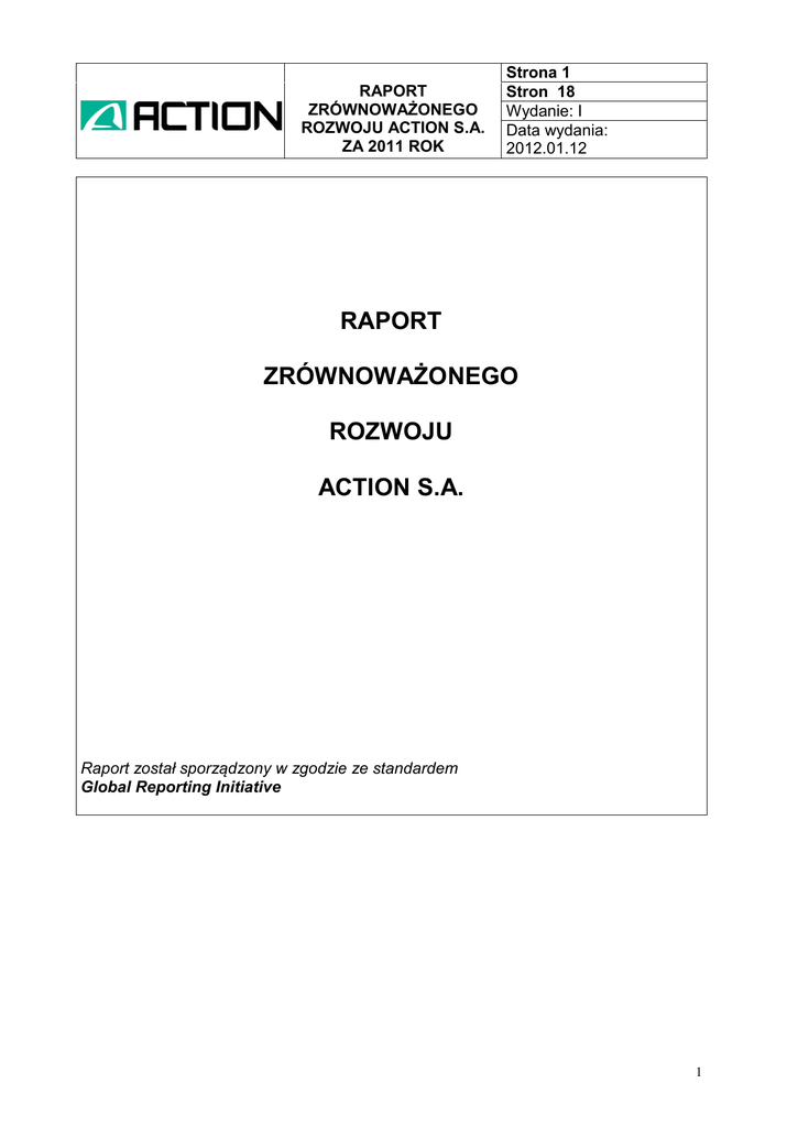RAPORT ZRÓWNOWAŻONEGO ROZWOJU ACTION S.A. ZA 2011 ROK Strona 1 Stron 18 Wydanie: I Data wydania: 2012.01.12 RAPORT ZRÓWNOWAŻONEGO ROZWOJU ACTION S.A. Raport został sporządzony w zgodzie ze standardem Global Reporting Initiative 1 RAPORT ZRÓWNOWAŻONEGO ROZWOJU ACTION S.A. ZA 2011 ROK Strona 2 Stron 18 Wydanie: I Data wydania: 2012.01.12 SPIS TREŚCI 1. CEL RAPORTU .................................................................................................... 3 2. HISTORIA I PROFIL DZIAŁALNOŚCI FIRMY ACTION S.A. .............................. 4 2.1. Historia Firmy........................................................................................... 4 2.2. Profil Firmy ............................................................................................... 4 3. STRATEGIA ROZWOJU...................................................................................... 8 3.1. MISJA........................................................................................................ 8 3.2. WIZJA ....................................................................................................... 8 3.3. Nasze wartości ....................................................................................... 10 4. SPOŁECZNOŚCI LOKALNE ............................................................................. 10 4.1. ACTION S.A. wspiera lokalną społeczność ......................................... 11 4.2. Patronat .................................................................................................. 11 4.3. Sponsoring ............................................................................................. 12 4.4. Nagrody i Wyróżnienia .......................................................................... 14 5. IDEA ZRÓWNOWAŻONEGO ROZWOJU ......................................................... 15 5.1. Relacje firmy z klientami i partnerami biznesowymi .......................... 15 5.2. Ochrona środowiska ............................................................................. 16 5.3. Współpraca z podwykonawcami i dostawcami................................... 17 6. CELE, REZULTATY I WSKAŹNIKI.................................................................... 18 6.1. Cele ......................................................................................................... 19 7. PODSUMOWANIE ............................................................................................. 23 2 RAPORT ZRÓWNOWAŻONEGO ROZWOJU ACTION S.A. ZA 2011 ROK Strona 3 Stron 18 Wydanie: I Data wydania: 2012.01.12 1. Cel raportu Głównym celem niniejszego raportu jest przedstawienie założeń oraz wyników polityki realizowanej przez firmę w zakresie z równoważonego rozwoju, pod kątem zagadnień związanych z wyborem produktów przyjaznych dla środowiska zgodnie ze standardami GRI. Nasza koncepcja, to dobrowolne uwzględnienia interesów społecznych i ochrony środowiska w strategii i działaniach firmy. Spółka dąży do ciągłego doskonalenia swoich produktów mających wpływ na środowisko jak również na wydajność. Dokładamy starań, aby nasze produkty komputerowe zawierały obniżony poziomu kadmu, ołowiu i rtęci w celu lepszej ochrony zdrowia ludzkiego i środowiska. Mamy świadomość, iż takie produkty są bardziej energooszczędne, co oszczędza pieniądze i zmniejsza emisję gazów cieplarnianych, a co za tym idzie są również łatwiejsze w aktualizacji i recyklingu. Nasza odpowiedzialność biznesowa to również inwestycja w zasoby ludzkie i w ochronę Środowiska, dobry kontakt z otoczeniem, w tym z interesariuszami. Tworzenie raportu z równoważonego rozwoju jest częścią szeregu procesów tworzenia strategii organizacji, naszych planów i oceny wyników. Raport przede wszystkim pozwala na zaangażowanie się naszych interesariuszy i pozyskiwanie od nich ich cennego wkładu w funkcjonowanie procesów organizacyjnych. Prezes Zarządu Piotr Bieliński 3 RAPORT ZRÓWNOWAŻONEGO ROZWOJU ACTION S.A. ZA 2011 ROK Strona 4 Stron 18 Wydanie: I Data wydania: 2012.01.12 2. HISTORIA I PROFIL DZIAŁALNOŚCI FIRMY ACTION S.A. 2.1. Historia Firmy Początki firmy ACTION sięgają przełomu lat 80-tych i 90-tych i warszawskiej giełdy komputerowej przy ulicy Batorego. Trzech znajomych, zajmujących się handlem komponentami i grami komputerowymi, założyło w 1991 r. spółkę ACTION (byli to Piotr Bieliński, Olgierd Matyka i Wojciech Wietrzykowski - do dziś menedżerowie firmy i jedni z jej głównych akcjonariuszy). Kroki milowe 1991 Początek działalności firmy w Warszawie 1996 Pierwszy miliard zł przychodów 2000 Włączenie do dystrybucji marek własnych 2004 Otwarcie centrum biurowo-dystrybucyjnego w Zamieniu 2004 Wdrożenie systemu zamówień on-line 2006 Debiut giełdowy 2007 Rozbudowa centrum dystrybucyjnego o kolejny Magazyn 2009 Rozwój projektów e-commerce 2009 Wdrożenie najnowocześniejszych rozwiązań logistycznych w Zamieniu 2.2. Profil Firmy Grupa Kapitałowa ACTION skupia firmy działające w obszarze handlu i produkcji urządzeń IT, RTV/AGD, sprzętu biurowego oraz materiałów eksploatacyjnych. W ostatnim czasie realizuje również projekty e-commerce. Powiązania biznesowe między spółkami w ramach Grupy Kapitałowej bazują na wspólnym rozwoju i wykorzystaniu know-how w zakresie logistyki i dystrybucji. ACTION prognozuje wyniki na 2011 roku na wzrost przychodów do poziomu 2 426 482 tys. zł i zysku netto do 34 082 tys. zł. Wyniki te mają zostać osiągnięte dzięki dalszemu 4 RAPORT ZRÓWNOWAŻONEGO ROZWOJU ACTION S.A. ZA 2011 ROK Strona 5 Stron 18 Wydanie: I Data wydania: 2012.01.12 zwiększaniu aktywności w każdym z kanałów dystrybucji, realizacji planów sprzedaży oraz zachowaniu dyscypliny kosztowej. Dominującą spółką w Grupie jest ACTION S.A. - jeden z największych dystrybutorów sprzętu IT i RTV/AGD. Spółka ta odpowiada za cały proces zakupu towarów od producentów.