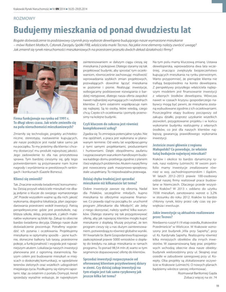 Krakowski Rynek Nieruchomości n Nr 09/2014 n 16.05–29.05.2014 ROZMOWY Budujemy mieszkania od ponad dwudziestu lat Bogate doświadczenie to podstawowy czynnik przy wyborze dewelopera budującego nasze wymarzone mieszkanie – mówi Robert Motłoch, Członek Zarządu Spółki FRB, właściciela marki Tecnos. Na jakie inne elementy należy zwrócić uwagę? Jak zmienił się rynek nieruchomości mieszkaniowych na przestrzeni przeszło dwóch dekad działalności firmy? zainteresowaniem w dalszym ciągu cieszą się mieszkania 2-pokojowe. Dlatego staramy się tak projektować budynki, aby sprostać tym oczekiwaniom, równocześnie zachowując możliwość wprowadzania szybkich zmian projektowych, pozwalających dowolnie łączyć mieszkania w poziomie i pionie. Realizując inwestycje, wzbogacamy podstawowe rozwiązania o bardziej nietypowe, dlatego nasza oferta zaspokoi nawet najbardziej wymagających i wybrednych klientów. Z tymi ostatnimi współpracuje nam się najlepiej. Są to osoby, które wiedzą, czego chcą. Często ich oczekiwania i pomysły przenosimy na kolejne budynki. Firma funkcjonuje na rynku od 1991 r. To długi okres czasu. Jak wiele zmieniło się na polu nieruchomości mieszkaniowych? Czyli kluczem do sukcesu jest również kompleksowość usług? Zmieniły się technologie, projekty architektoniczne, stereotypy, nastawienie kupujących, ale nasze podejście jest nadal takie samo jak na początku. To my jesteśmy dla klienta i chcemy dostarczyć mu produkt najwyższej jakości. Jego zadowolenie to dla nas priorytetowa sprawa. Tym bardziej cieszymy się, gdy tego potwierdzeniem są przyznawane nam liczne nagrody i wyróżnienia w prestiżowych rankingach i konkursach (Gazele Biznesu). Zgadza się. To zmniejsza potencjalne ryzyko. Nie ma opóźnień, a praca jest wykonana w planowanym terminie. Od wielu lat współpracujemy z tymi samymi projektantami, producentami i hurtowniami. Dzięki obopólnemu zaufaniu i wypracowanym warunkom handlowym budowa każdego domu przebiega zgodnie z planem i bez większych problemów. Atutem naszej firmy jest nowoczesny park maszynowo-sprzętowy; stale uzupełniany. To niepodważalna przewaga. Klienci się zmienili? Dzisiaj chyba trudniej jest sprzedać mieszkanie niż kilkanaście lat temu? Tak. Znacznie wzrosła świadomość konsumencka. Dzisiaj przyszli właściciele mieszkań nie dbają jedynie o klucze do swojego wymarzonego „M”. Przede wszystkim ważne są dla nich: jakość wykonania, dogodna lokalizacja, plan zagospodarowania przestrzeni wokół inwestycji. Patrzą perspektywicznie: gdzie jest przedszkole, najbliższa szkoła, sklep, przystanek, z jakich materiałów wykonane są bloki itp. Zakup to obecnie bardzo świadoma decyzja. Dlatego nasze duże doświadczenie procentuje. Potrafimy wyprzedzić ich pytania i oczekiwania. Projektujemy mieszkania w optymalny sposób – jasne kuchnie, słoneczne balkony lub tarasy, przestronne pokoje, a funkcjonalność i wygoda jest najważniejszym atutem. Lokalizacja naszych inwestycji planowana jest z ogromną starannością. Naszym celem jest budowanie mieszkań w miejscach o doskonałej komunikacji, w sąsiedztwie terenów zielonych oraz wszelkich udogodnień miejskiego życia. Posiłkujemy się różnymi raportami. Idąc za ostatnim z portalu Domy.pl, trend sprzedaży wyraźnie wskazuje, że największym Dobre inwestycje zawsze się obronią. Nadal dla Polaków, szczególnie młodych, kupno mieszkania to olbrzymie wyzwanie finansowe. Co prawda rząd na początku br. uruchomił program „Mieszkanie dla Młodych”, ale żeby z niego skorzystać, należy spełnić kilka warunków. Dlatego staramy się tak przygotowywać ofertę, aby jak najwięcej klientów mogło kupić mieszkanie z dopłatą. Muszę przyznać, że ten program cieszy się u nas dużym zainteresowaniem, potwierdzają to również globalne wyniki. W I kwartale br. Bank Gospodarstwa Krajowego zaakceptował prawie 5000 wniosków o dopłatę do kredytu na zakup mieszkania w ramach programu. To ponad 98,54 mln zł; warto w tym segmencie dopasowywać ofertę do klientów. Sprzedaż inwestycji rozpoczynacie od oferowanej klientom przysłowiowej dziury w ziemi. Czy dzisiaj zakup inwestycji na tym etapie jest tak samo ryzykowny jak jeszcze kilka lat temu? Na tym polu mamy kluczową zmianę. Ustawa deweloperska, wprowadzona dwa lata wcześniej, znacząco zwiększyła bezpieczeństwo kupujących mieszkania na rynku pierwotnym. Warto przypomnieć, że pieniądze klienta nie trafiają bezpośrednio na konto dewelopera. Z perspektywy przyszłego właściciela najlepszym modelem jest finansowanie inwestycji z własnych środków dewelopera. Wówczas nawet w czasach kryzysu gospodarczego nabywcy mogą być pewni, że mieszkania zostaną wybudowane zgodnie z ich oczekiwaniami. Poszczególne etapy budowy począwszy od zakupu działki, poprzez uzyskanie wszelkich zezwoleń, przygotowanie projektu i w końcu wykonanie budynku realizujemy z własnych środków, co jest dla naszych klientów najlepszą gwarancją prawidłowego wykonania inwestycji. Jesteście znani głównie z regionu Małopolski? Co powoduje, że właśnie tutaj budujecie najwięcej mieszkań? Kraków i okolice to bardzo dynamiczny rynek, nasz rodzimy (uśmiech). W swoim portfolio mamy inwestycje zrealizowane również w woj. zachodniopomorskim i śląskim. W latach 2012–2013 prawie 100-osobowy odział naszej firmy realizował prace budowlane w Niemczech. Dlaczego przede wszystkim Kraków? W 2013 r. oddano do użytku 7038 mieszkań, zanotowano wzrost o 3,2% w stosunku do roku 2012. Kraków to bardzo chłonny rynek, który przez cały czas się powiększa i ewoluuje. Jakie inwestycje są aktualnie realizowane przez Tecnos? Niedawno ruszył II i III etap osiedla „Krakowskie Przedmieście” w Wieliczce. W Krakowie wznoszony jest budynek „Villa przy Sapiehy”, przy ul. Ks. Kardynała Sapiehy. Realizujemy również kilka mniejszych obiektów dla innych inwestorów. W