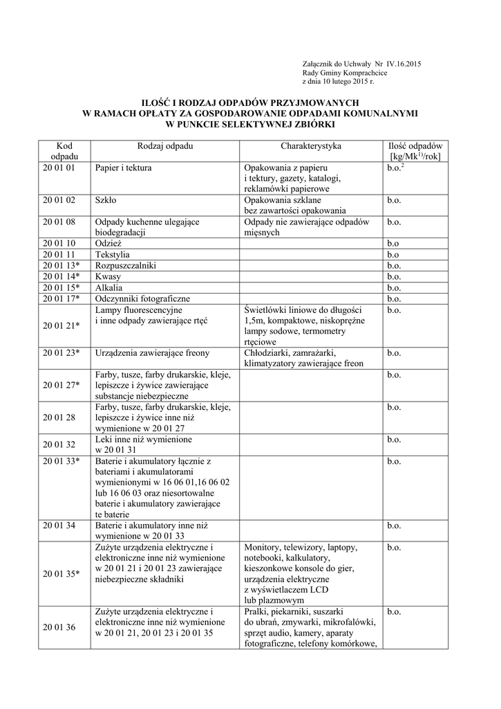 Załącznik do Uchwały Nr IV.16.2015 Rady Gminy Komprachcice z dnia 10 lutego 2015 r. ILOŚĆ I RODZAJ ODPADÓW PRZYJMOWANYCH W RAMACH OPŁATY ZA GOSPODAROWANIE ODPADAMI KOMUNALNYMI W PUNKCIE SELEKTYWNEJ ZBIÓRKI Kod odpadu 20 01 01 Papier i tektura 20 01 02 Szkło 20 01 08 Odpady kuchenne ulegające biodegradacji Odzież Tekstylia Rozpuszczalniki Kwasy Alkalia Odczynniki fotograficzne Lampy fluorescencyjne i inne odpady zawierające rtęć 20 01 10 20 01 11 20 01 13* 20 01 14* 20 01 15* 20 01 17* 20 01 21* 20 01 23* 20 01 27* 20 01 28 20 01 32 20 01 33* 20 01 34 20 01 35* 20 01 36 Rodzaj odpadu Urządzenia zawierające freony Farby, tusze, farby drukarskie, kleje, lepiszcze i żywice zawierające substancje niebezpieczne Farby, tusze, farby drukarskie, kleje, lepiszcze i żywice inne niż wymienione w 20 01 27 Leki inne niż wymienione w 20 01 31 Baterie i akumulatory łącznie z bateriami i akumulatorami wymienionymi w 16 06 01,16 06 02 lub 16 06 03 oraz niesortowalne baterie i akumulatory zawierające te baterie Baterie i akumulatory inne niż wymienione w 20 01 33 Zużyte urządzenia elektryczne i elektroniczne inne niż wymienione w 20 01 21 i 20 01 23 zawierające niebezpieczne składniki Zużyte urządzenia elektryczne i elektroniczne inne niż wymienione w 20 01 21, 20 01 23 i 20 01 35 Charakterystyka Opakowania z papieru i tektury, gazety, katalogi, reklamówki papierowe Opakowania szklane bez zawartości opakowania Odpady nie zawierające odpadów mięsnych Świetlówki liniowe do długości 1,5m, kompaktowe, niskoprężne lampy sodowe, termometry rtęciowe Chłodziarki, zamrażarki, klimatyzatory zawierające freon Ilość odpadów [kg/Mk1)/rok] b.o.2 b.o. b.o. b.o b.o b.o. b.o. b.o. b.o. b.o. b.o. b.o. b.o. b.o. b.o. b.o. Monitory, telewizory, laptopy, notebooki, kalkulatory, kieszonkowe konsole do gier, urządzenia elektryczne z wyświetlaczem LCD lub plazmowym Pralki, piekarniki, suszarki do ubrań, zmywarki, mikrofalówki, sprzęt audio, kamery, aparaty fotograficzne, telefony komórkowe, b.o. b.o. 20 01 38 Drewno inne niż wymienione w 20 01 37 20 01 39 Tworzywa sztuczne 20 01 40 20 02 02 Metale Odpady ulegające biodegradacji z ogrodów i parków Gleba i ziemia, w tym kamienie 20 03 07 Wielkogabarytowe - meble 20 03 07 Wielkogabarytowe z metalu 16 01 03 Opony 20 02 01 17 01 07 16 80 01 13 02 08* 15 01 10* 08 03 18 17 06 04 Zmieszane odpady z betonu, gruzu ceglanego, odpadowych materiałów ceramicznych i elementów wyposażenia inne niż wymienione w 17 01 06 Magnetyczne i optyczne nośniki informacji Inne oleje silnikowe, przekładniowe i smarowe Opakowania zawierające pozostałości substancji niebezpiecznych lub nimi zanieczyszczone (np. środkami ochrony roślin I i II klasy toksyczności - bardzo toksyczne i toksyczne) Odpadowy toner drukarski inny niż wymienione w 08 03 17 Materiały izolacyjne in. niż wymienione w 17 06 01 i 17 06 03 Mk - mieszkańca b.o. oznacza bez ograniczeń * odpady niebezpieczne 1) 2) telefony stacjonarne, maszyny do szycia, opiekacze, tostery, komputery, drukarki, maszyny do pisania, wentylatory elektryczne, grzejniki elektryczne, termostaty, chłodziarki, zamrażarki, klimatyzatory nie zawierające freonu, odkurzacze, żelazka, inne urządzenia kuchenne, inne urządzenia elektryczne nie zawierające substancji niebezpiecznych Drewno niemalowane, niezanieczyszczone Tworzywa sztuczne niezanieczyszczone, nie zawierające ceramiki, szkła, metalu, gumy Części roślin z ogrodów i parków Gleba i ziemia niezanieczyszczone Meble. meble tapicerowane, okna, wanny, brodziki z tworzyw sztucznych Grzejniki, felgi, wanny żeliwne Opony samochodowe o średnicy nie przekraczającej 56 cm Odpady mineralne niezanieczyszczone b.o. b.o. b.o. b.o. b.o. b.o. b.o. b.o. 100 Płytki CD, DVD 1 Oleje hydrauliczne, przekładniowe, smarowe mineralne i syntetyczne Opakowania po substancjach niebezpiecznych 1 b.o. b.o. Styropian i wełna mineralna 0,5m3/ gospodarstwo/rok