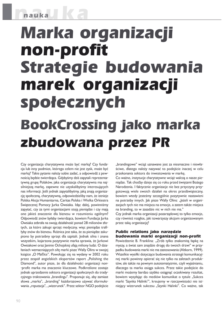 nauka nauka Marka organizacji non-profit Strategie budowania marek organizacji społecznych BookCrossing jako marka zbudowana przez PR .ed Z]RLYTeLNUL NSL]d_L_dbYL XZŇP MdÛ XL]VÙ* .ed Q`YOL NULW`MTYYd[ZOXTZ_V_Ç]PRZNPWPXYTPUP^_ed^VXZŇPMdÛ XL]VÙ*?LVTP[d_LYTPYLWPŇd^ZMTPeLOLÛLZO[ZbTPOŅe[Pb YZĦNTÙMíOeTP_bTP]OeÙNL2OdMdĦXdOeTĦeL[d_LWT]P[]PePY_L _dbYÙR]`[í;ZWLVÇbULVLZ]RLYTeLNULNSL]d_L_dbYLXLYLU ^TWYTPU^eÙ XL]Ví eL[PbYP YTP `ed^VLWTMdĦXd TY_P]P^`UÙNdNS YL^TYQZ]XLNUT5PĦWTUPOYLVeL[d_LWTMdĦXdULVÙeYLUÙZ]RLYTeL NUí^[ZčPNeYÙNSL]d_L_dbYÙZO[ZbTPOeTPWTMdYLXŇPT^_YTPUP ;ZW^VL,VNUL3`XLYT_L]YL.L]T_L^;ZW^VLTBTPWVL:]VTP^_]L ĥbTÙ_PNeYPU ;ZXZNd 5`]VL :b^TLVL 4OÙN OLWPU [ZbTYYTĦXd eL[d_LÛ Ned eL _dXT Z]RLYTeLNULXT ^_ZUÙ [TPYTÙOeP T Ned XLUÙ ZYP ULVTPĦ eYLNePYTP OWL MTeYP^` b ]Ze`XTPYT` ZRÇWYdX* :O[ZbTPOŅeYÇbMdčLMd_bTP]OeÙNLMZbTPX1`YOLNUL5`]VL :b^TLVLePM]LčLYL^bZUÙOeTLčLWYZĦÛ[ZYLO#XTWTZYÇbečZ _dNS eL V_Ç]P eLV`[T ^[]eí_ XPOdNeYd bTíN [TPYTÙOeP _]LQT čdMdeYÇbOZMTeYP^`=ÇŇYTNLUP^__LVLŇPeL[TPYTÙOePeLV` [TZYZ Md [Z_]ePMYd ^[]eí_ OWL ^e[T_LWT 5POYLV ^TWYL T eYLYL b^ed^_VTXVZUL]eZYL[Zed_dbYTPXL]VL^[]LbTLŇP5`]VZbT :b^TLVZbTZ]Le5LYTYTP:NSZU^VTPU`QLUÙXTWTZYdW`OeT:OeTL čLYTLNSbeXLNYTLUÙNdNS^TčíXL]VT[T^ePBLWWd:WTY^b^bZUPU V^TÙŇNP k: 8LNPu ;ZbZč`UÙN ^Tí YL bdOLYd b ]ZV` []ePe eP^[Çč LYRTPW^VTNS PV^[P]_Çb ]L[Z]_ k;ZWT^STYR _SP /TLXZYOu L`_Z] [T^eP ŇP OWL OeTLčLWYZĦNT Z]RLYTeLNUT YZY []ZQT_ XL]VL XL eYLNePYTP VW`NeZbP ;ZOV]PĦWZYP eZ^_LUP UPOYLV`[]ePOePYTP^PV_Z]LZ]RLYTeLNUT^[ZčPNeYdNSOZ_]LOd NdUYPRZ_]LV_ZbLYTLkM]LYOTYR`u;]Z[ZY`UP^TíLMdeLXTL^_ ^čZbL kXL]VLu kM]LYOTYRu VLŇOZ]LeZbZ `ŇdbLÛ ^QZ]X`čZ bLYTLk]P[`_LNULukbTeP]`YPVu;]ePe^PV_Z]92:[ZOPUĦNTP $ kM]LYOTYRZbPu bNTÙŇ `eYLbLYP UP^_ eL YTP^XLNeYP T YTPbčL ĦNTbP OWL_PRZ YLWPŇd YLedbLÛ _Z [ZOPUĦNTP TYLNePU b NPW` []ePVZYLYTL^PV_Z]LOZ TYbP^_ZbLYTLbXL]Ví .ZbLŇYPTY^_d_`NUPNSL]d_L_dbYPbNTÙŇbLWNeÙZYL^eP[TP YTÙOeP?LVNSZÛMdOeTPUP^TíNZ]ZV`[]ePOĦbTí_LXT-ZŇPRZ 9L]ZOePYTL4QLV_dNeYTPZ]RLYTeLNUPYTPMPe[]edNedYd[]ed RZ_Zb`UÙ bTPWP ^bZTNS OeTLčLď YL ZV]P^ []ePOĦbTÙ_PNeYd MZbTPX b_POd UP^_PĦXd ^eNePRÇWYTP [Zed_dbYTP YL^_LbTPYT YL [Z_]ePMd TYYdNS 5LV [T^eP BLWWd :WTY^% k5PŇPWT b Z]RLYT eLNULNS_dNSYTPXLXTPU^NLYLPXZNUPLeL_PX_LVŇPXTPU^NL YLM]LYOTYR _Zb eL^LOeTP YTN bYTNS YTPXLu .edUPOYLVXL]VLZ]RLYTeLNUT[ZeL]eÙOZbPU_Z_dWVZPXZNUP Ned]ÇbYTPŇ]ZeRčZ^ULVT_ZbL]ed^edLVNUZXZ]RLYTeZbLYdX []ePe_LVÙZ]RLYTeLNUí* Public relations jako narzędzie budowania marki organizacji non-profit ;ZbTPOePYTP - 1]LYVWTYL% kE]ÇM _dWVZ eYLVZXT_Ù čL[Ví YL Xd^edLĦbTL_^LXeYLUOeTPO]ZRíOZ_bZTNSO]ebTub[]ed [LOV`M`OZbLYTLXL]VTYTPXLeL^_Z^ZbLYTL,W_VZ]Y$$$ B^ePWVTPbd^TčVTOZ_dNeÙNPM`OZbLYTL^_]L_PRTTVZX`YTVLNdU YPU XL]VT [ZbTYYd Z[TP]LÛ ^Tí YTP _dWVZ YL eLWP_LNS []ZO`V _ÇbLWP_LVŇPYL[PbYdXL`_Z_PXL_deXTPNedWTbdULĦYTLYT` OWLNePRZ _L XL]VL Z^TÙRL ^`VNP^ ;]ePe _LVTP [ZOPUĦNTP OZ XL]VTXZŇPXdML]OeZ^edMVZZ^TÙRYÙÛZNePVTbLYd]Pe`W_L_ MZbTPX bd^dčLUÙN OZ XPOTÇb VZX`YTVL_ Z _d_`WP k>`VNP^ XL]VT n>edYVL 3LWTYVTvu V]P`UPXd b ]ePNedbT^_ZĦNT YTP T^_ YTPUÙNd bTeP]`YPV ^`VNP^` k>edYVT 3LWTYVTu .Z bLŇYP _LV nauka ^LXZ ULV b ]PVWLXTP ]ÇbYTPŇ b [`MWTN ]PWL_TZY^ M`O`UÙNdX XL]Ví YLWPŇd bdVZ]ed^_dbLÛ ^eP]ZVZ ]Ze`XTLYP T Q`YVNUZ Y`UÙNP ^[ZčPNeYP XT_d B^bZUPUYLUYZb^ePUV^TÙŇNP,WT7L`]L=TP^`OZbLO YTLUÙŇP]PVWLXLYTPWTNed^TíU`ŇbĦbTPNTPVZX`YTVLNUTeVZY ^`XPY_PX 4^_Z_Yd ^_LUP ^Tí VZX`YTVL_ []ePVLedbLYd OeTíVT OeTLčLYTZX [`MWTN ]PWL_TZY^ 5PĦWT eLĦ bPŅXTPXd [ZO `bLRí OeTLčLWYZĦÛYZY[]ZQT_M`OZbLYTPXL]VT[]ePe]PVWLXíMdčZMd NLčVZbT_dXYTP[Z]Ze`XTPYTPX:TWPUPOPYe[ZO]ZeOeTLčÇb []edbZčLYPU [ZedNUT YZ^T _d_`č% k=PVWLXL UP^_ bTL_]PX ;= UP^_^čZďNPXuZ_dWPbZOYTP^TPYT`OZOeTLčLWYZĦNTYZY[]ZQT_ [ZbTYTPYZYM]eXTPÛ%k/`Ňd]ZeRčZ^UP^_bTL_]PX/PWTVL_Yd ;=UP^_^čZďNPXuBOeTLčLWYZĦNTYZY[]ZQT_YTPXZŇYLeL^_Z ^ZbLÛ[]LbL[ZNSZOeÙNPRZekYTPeXTPYYdNS[]LbM]LY OTYR`uZOYZ^eÙNPRZ^TíOZ[ZO_]edXdbLYTL[]edŇdNT`XL]VT []ePe]PVWLXí9LWPŇd_LVULVb[]ed[LOV`_bZ]ePYTLXL]VT ^e`VLÛ ]ZeRčZ^` []ed NedX ML]OeTPU ZO[ZbTPOYTP MdčZMd _` LYRTPW^VTP^čZbZ\aNXUOU`eZ]LebdVZ]ed^_dbLÛTYYPOZ^_í[YP []Z[ZedNUPOeTLčLď[`MWTN]PWL_TZY^_LVTPULVbdOL]ePYTL^[P NULWYP TX[]Ped V`W_`]LWYP T_O 9LWPŇd_LVŇP[LXTí_LÛŇPVLŇOLXL]VL[Z_]ePM`UPTYOdbTO` LWYPU^_]L_PRTTVZX`YTVLNdUYPUTYLURZ]^eÙ]ePNeÙULVÙXZŇPXd e]ZMTÛ LMd XL]Ví eLMTÛ UP^_ VZ]ed^_LYTP e [ZO]íNeYTVÇb TOeTLčLYTP bPOč`R ^NSPXL_` B _dX XTPU^N` YLWPŇd []ed_ZNedÛ []edVčLO 7TY`cL OL]XZ bPRZ ^d^_PX` Z[P]LNdUYPRZ V_Ç]d ed^VLč ^čLbí _dWVZ OeTíVT \aNXUOU`e MZbTPX YLbP_ YTP UP^_ _Z QT]XL LYT Z]RLYTeLNUL WPNe R]`[L YTP e]eP^eZYdNS TYQZ]XL_dVÇb V_Ç]ed [Z^_LYZbTWT ^[]ePNTbTÛ ^Tí XZYZ [ZWZbT QT]Xd 8TN]Z^ZQ_ , 7 =TP^ /eTĦ XZŇPXd [ZbTPOeTPÛ ŇP UP^_ _Z TYTNUL_dbL YZY[]ZQT_ WPNe ULV ^d_`LNUL _L MíOeTP bdRWÙOLÛ eL VTWVL WL_YTPbTPXd4YYLVbP^_TLYLV_Ç]Ù eb]LNLUÙ `bLRí L`_Z]ed _Z QLV_ ŇP VLŇOL XL]VL [Z_]ePM`UP b]ZRL 4 _LV ZObTPNeYdXb]ZRTPX.ZNL.ZWTUP^_ ;P[^T T_O 1Z_%MZZVN]Z^^TYR[W Reklama a PR w budowaniu wizerunku marki 7[ZRQ^QZOVM [PZU[_ĎM _aWOQ_ c PaņQV YUQ^fQ PfUîWU fMMZSMņ[cMZUa >[NQ^`M 3MYNXQ W`È^e VMW[ cĎMħOUOUQX CePMcZUO`cM 9QPUM >[PfUZM OTî`ZUQ fMMZSM ņ[cMĎ _Uî c \^[Y[OVî ^aOTa N[[WO^[__UZSw[cQS[ VL_ZWTNVTX ULVTX UP^_ ;ZW^VL _Z bd^_L]Ned Md Z^TÙRYÙÛ ^`V NP^ E VZWPT :]VTP^_]L 5`]VL :b^TLVL b NTÙR` UPOYPRZ OYTL eMTP]LYLUbTíNPU[TPYTíOedb;ZW^NPLYRLŇ`UPbLVNUP[ZYLO bZWZY_L]T`^edTULVZLVNULNSL]d_L_dbYLUP^_UPOdYL b ^bZTX ]ZOeLU` ;ZW^VL ,VNUL 3`XLYT_L]YL ;,3 5LYTYd :NSZU^VTPU ULVZ [TP]b^eL Z]RLYTeZbLčL VZYbZUP e [ZXZNÙ S`XLYT_L]YÙ OWL Z^ÇM eLXTP^eV`UÙNdNS _P]PYd ZMUí_P []ePe VZYQWTV_d bZUPYYP ņLOYL e _dNS Z]RLYTeLNUT YTP bdOLčL ečZ _ÇbVT YL ]PVWLXí LYT YL ;= LWP b^ed^_VTP OeTLčLčd RčÇbYTP eL[ZXZNÙ[`MWTN]PWL_TZY^B^PV_Z ]eP 92: YTP eYLUO`UP eL^_Z^ZbLYTL _LVŇPTYYP[]LbZM]LYOTYR`XÇbTÙNP Z _dX ŇP XL]VL [ZbTYYL []ZXZ bLÛ NLčÙ VL_PRZ]Tí E [PbYZĦNTÙ YTP [ZbTYYL L ]LNePU [ZbTYYL _bZ]edÛ TYYÙ YZbÙ VL_PRZ]Tí MZbTPX _dWVZ _P Z]RLYTeLNUP T QT]Xd XLUÙ _P]Le ^eLY^PYL^e