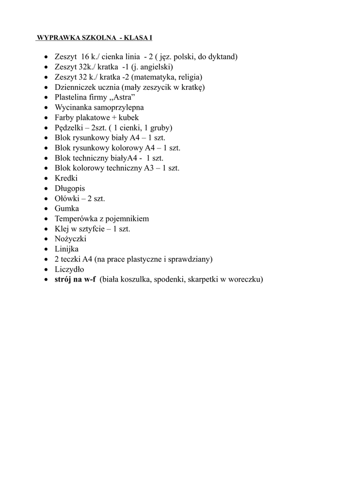 WYPRAWKA SZKOLNA - KLASA I Zeszyt 16 k./ cienka linia - 2 ( jęz. polski, do dyktand) Zeszyt 32k./ kratka -1 (j. angielski) Zeszyt 32 k./ kratka -2 (matematyka, religia) Dzienniczek ucznia (mały zeszycik w kratkę) Plastelina firmy ,,Astra” Wycinanka samoprzylepna Farby plakatowe + kubek Pędzelki – 2szt. ( 1 cienki, 1 gruby) Blok rysunkowy biały A4 – 1 szt. Blok rysunkowy kolorowy A4 – 1 szt. Blok techniczny białyA4 - 1 szt. Blok kolorowy techniczny A3 – 1 szt. Kredki Długopis Ołówki – 2 szt. Gumka Temperówka z pojemnikiem Klej w sztyfcie – 1 szt. Nożyczki Linijka 2 teczki A4 (na prace plastyczne i sprawdziany) Liczydło strój na w-f (biała koszulka, spodenki, skarpetki w woreczku)