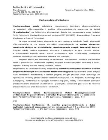 Politechnika Wrocławska Biuro Prasowe tel. 071 320-43-43, 320-43-54 Rzecznik Prasowy kom. 0695 350 432 Wrocław, 5 października 2010r. Fizyka rządzi na Politechnice Międzynarodowa w badaniach szkoła poświęcona półprzewodników i nowoczesnym struktur technikom półprzewodnikowych eksperymentalnym rozpoczyna się dzisiaj (5 października) na Politechnice Wrocławskiej. Szkoła jest organizowana przez Instytut Fizyki Politechniki Wrocławskiej w ramach projektu COST (MP0805) - Europejskiego Programu Współpracy w Nauce i Technologii. W ciągu ostatniej dekady obserwuje się duŜy postęp w dziedzinie fizyki i elektroniki półprzewodników w tym przede wszystkim zapotrzebowanie na ogniwa słoneczne, urządzenia słuŜące do wyświetlania, przechowywania danych, transmisji danych. Program szkoły zawiera najnowsze informacje i osiągnięcia w tym zakresie wiedzy, a prezentowane wykłady oprócz metod pomiarowych będą przedstawiały rozwiązania naukowe, technologiczne i techniczne związane z tą tematyką. Program szkoły jest skierowany do studentów, doktorantów i młodych pracowników nauki – głównie fizyki i elektroniki. Wykłady wygłoszą wybitni specjaliści, naukowcy z Polski, Tajwanu, Wielkiej Brytanii, Francji, Finlandii i Japonii. Bezpośrednio po zakończeniu szkoły odbędzie się konferencja dotycząca szybkich laserów półprzewodnikowych do zastosowań telekomunikacyjnych organizowana przez Instytut Fizyki Politechniki Wrocławskiej w ramach projektu DeLight (Rozwój tanich technologii do wytwarzania wysokiej jakości laserów telekomunikacyjnych ) VII Programu Ramowego Unii Europejskiej. Konferencja ma sprzyjać wymianie poglądów, wiedzy i doświadczeń pomiędzy przedstawicielami środowisk akademickich i przemysłu; skierowana jest takŜe do młodych pracowników nauki oraz doktorantów i studentów. Międzynarodowa Szkoła Zaawansowanych Metod Eksperymentalnych w Badaniach Półprzewodników i Struktur Półprzewodnikowych 5-6 października 2010, Politechnika Wrocławska – s. 241 budynek A1, rozpoczęcie – godz. 8.45 oraz Międzynarodowa konferencja nt. laserów półprzewodnikowych o duŜej szybkości modulacji przeznaczonych do telekomunikacji 7-8 października 2010, Politechnika Wrocławska – s. 241 budynek A1, rozpoczęcie – godz. 9.00 Informacje dla mediów umieszczane są na stronie: http://www.portal.pwr.wroc.pl/komunikaty_prasowe,241.dhtml