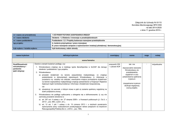 Załącznik do Uchwały Nr 61/15 Komitetu Monitorującego RPO WM na lata 2014-2020 z dnia 11 grudnia 2015 r. nr i nazwa osi priorytetowej 1 OŚ PRIORYTETOWA GOSPODARKA WIEDZY nr i nazwa działania Działanie 1.2 Badania i innowacje w przedsiębiorstwach nr i nazwa poddziałania Poddziałanie 1.2.1 Projekty badawczo-rozwojowe przedsiębiorstw typ projektu A. badania przemysłowe i prace rozwojowe B. prace rozwojowe związane z wytworzeniem instalacji pilotażowej / demonstracyjnej tryb wyboru / ścieżka wyboru tryb konkursowy, nabór otwarty nazwa kryterium definicja kryterium oceniający ocena waga pracownik IOK – członek KOP tak / nie - rodzaj ocena formalna Kwalifikowalność wnioskodawcy i partnerów (jeśli dotyczy) Ocenie w ramach kryterium podlega, czy: 1. Wnioskodawca znajduje się w katalogu typów Beneficjentów w SzOOP dla danego działania / poddziałania / typu projektu, 2. Wnioskodawca: a) prowadzi działalność na terenie województwa małopolskiego, co znajduje potwierdzenie w dokumentach rejestrowych Wnioskodawcy, tj. informacja o posiadaniu np. siedziby lub oddziału, ewentualnie miejsca prowadzenia działalności na terenie województwa małopolskiego znajduje potwierdzenie w Krajowym Rejestrze Sądowym bądź Centralnej Ewidencji i Informacji o Działalności Gospodarczej, lub b) oświadczył, że warunek, o którym mowa w ppkt a) zostanie spełniony najpóźniej na dzień podpisania umowy, 3. Wnioskodawca nie podlega wykluczeniu z ubiegania się o dofinansowanie, tj. czy nie zachodzą przesłanki określone w: a) art. 207 ust. 4 ustawy z dn. 27 sierpnia 2009 r. o finansach publicznych (j.t. Dz.U. z 2013 r., poz. 885, z późn. zm.), b) art. 12 ust. 1 pkt 1 ustawy z dn. 15 czerwca 2012 r. o skutkach powierzania wykonywania pracy cudzoziemcom przebywającym wbrew przepisom na terytorium Rzeczypospolitej Polskiej (Dz.U. z 2012 r., poz. 769), 1 dopuszczalne wezwanie Wnioskodawcy do przedstawienia wyjaśnień w celu potwierdzenia spełnienia kryterium niespełnienie kryterium skutkuje negatywną oceną projektu indywidualne c) art. 9 ust. 1 pkt 2a ustawy z dn. 28 października 2002 r. o odpowiedzialności podmiotów zbiorowych za czyny zabronione pod groźbą kary (j.t. Dz. U. z 2015 r. poz.1212). Ocena w ramach kryterium odbywa się w oparciu o oświadczenia przedstawione przez Wnioskodawcę. Kwalifikowalność projektu Ocenie w ramach kryterium podlega, czy: pracownik IOK – członek KOP 1. projekt jest zgodny z celami danego działania / poddziałania, 2. projekt wpisuje się w typy projektów wskazane dla danego działania / poddziałania, zgodnie z SzOOP i regulaminem konkursu, 3. przedmiot projektu nie dotyczy rodzajów działalności wykluczonych z możliwości uzyskania wsparcia, zgodnie z regulaminem konkursu, 4. projekt jest zgodny z przepisami art. 65 ust. 6 i art. 125 ust. 3 lit. e) i f) Rozporządzenia Parlamentu Europejskiego i Rady (UE) nr 1303/2013 z dn. 17 grudnia 2013 r. tj. Wnioskodawca złożył oświadczenie, że: projekt nie został zakończony w rozumieniu art. 65 ust. 6, nie rozpoczął realizacji projektu przed dniem złożenia wniosku o dofinansowanie albo, że realizując projekt przed dniem złożenia wniosku, przestrzegał obowiązujących przepisów prawa dotyczących danej operacji (art. 125 ust. 3 lit. e), projekt nie obejmuje przedsięwzięć będących częścią operacji, które zostały objęte lub powinny były zostać objęte procedurą odzyskiwania zgodnie z art. 71 (trwałość operacji) w następstwie przeniesienia działalności produkcyjnej poza obszar objęty programem, tak / nie - indywidualne - indywidualne dopuszczalne wezwanie Wnioskodawcy do przedstawienia wyjaśnień w celu potwierdzenia spełnienia kryterium niespełnienie kryterium skutkuje negatywną oceną projektu 5. projekt (lub jego część) nie otrzymał dofinansowania z innych środków, Ocena odbywa się w oparciu o oświadczenia przedstawione przez Wnioskodawcę. 6. projekt będzie realizowany na terenie województwa małopolskiego, tj. wskazane we wniosku miejsce realizacji projektu znajduje się na terenie województwa małopolskiego Warunek uznaje się za spełniony także w przypadku zlecenia przez Wnioskodawcę realizacji części zadań w projekcie – wykonawcy spoza obszaru województwa. 7. okres realizacji projektu jest zgodny z wymaganiami określonymi w regulaminie konkursu. Kompletność oraz poprawność wypełnienia wniosku i załączników Ocenie w ramach kryterium podlega poprawność formalna wniosku o dofinansowanie, tj. prawidłowość wypełniania poszczególnych pól, a także kompletność informacji wymaganych regulaminem konkursu oraz instrukcją wypełniania wniosku o dofinansowanie. Weryfikacji podlega: 1. czy wypełniono prawidłowo wszystkie wymagane pola wniosku, 2. czy zostały przedstawione wszystkie wymagane załączniki, 3. czy załączniki zostały przygotowane zgodnie z instrukcją. 2 pracownik IOK – członek KOP tak / nie dopuszczalne wezwanie Wnioskodawcy do przedstawienia wyjaśnień w celu potwierdzenia spełnienia kryterium niespełnienie kryterium skutkuje negatywną oceną projektu Pomoc publiczna Ocenie w ramach kryterium podlega, czy pomoc publiczna / pomoc de minimis może zostać udzielona na gruncie obowiązujących rozporządzeń oraz Podręcznika kwalifikowania wydatków objętych dofinasowaniem w ramach Regionalnego Programu Operacyjnego Województwa Małopolskiego na lata 2014-2020, w tym: 1. czy okres realizacji projektu jest zgodny z przepisami właściwych rozporządzeń, 2. czy spełniony jest efekt zachęty (jeśli dotyczy), 3. potencjalna kwalifikowalność wydatków planowanych do poniesienia oraz poprawność przypisania poszczególnych wydatków projektu do katalogu kwalifikowalnych zgodnie z właściwym rozporządzeniem oraz zasadami zawartymi w Podręczniku kwalifikowania wydatków objętych dofinasowaniem w ramach Regionalnego Programu Operacyjnego Województwa Małopolskiego na lata 2014-202