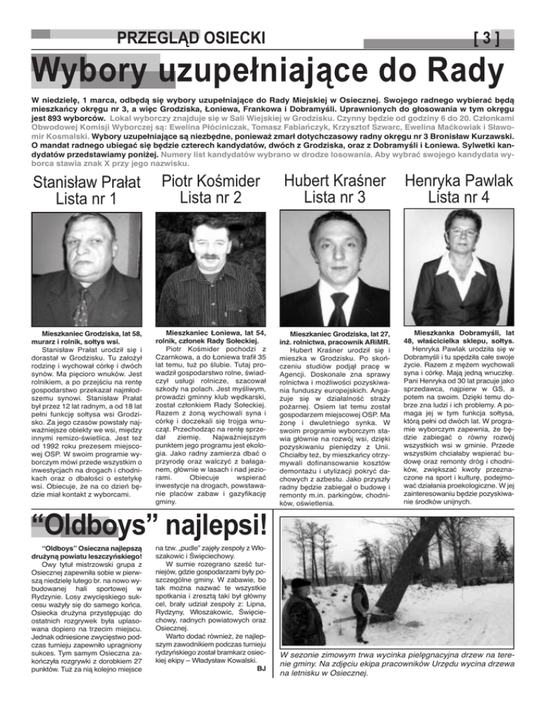 PRZEGLĄD OSIECKI [3] Wybory uzupełniające do Rady W niedzielę, 1 marca, odbędą się wybory uzupełniające do Rady Miejskiej w Osiecznej. Swojego radnego wybierać będą mieszkańcy okręgu nr 3, a więc Grodziska, Łoniewa, Frankowa i Dobramyśli. Uprawnionych do głosowania w tym okręgu jest 893 wyborców. Lokal wyborczy znajduje się w Sali Wiejskiej w Grodzisku. Czynny będzie od godziny 6 do 20. Członkami Obwodowej Komisji Wyborczej są: Ewelina Płóciniczak, Tomasz Fabiańczyk, Krzysztof Szwarc, Ewelina Maćkowiak i Sławomir Kosmalski. Wybory uzupełniające są niezbędne, ponieważ zmarł dotychczasowy radny okręgu nr 3 Bronisław Kurzawski. O mandat radnego ubiegać się będzie czterech kandydatów, dwóch z Grodziska, oraz z Dobramyśli i Łoniewa. Sylwetki kandydatów przedstawiamy poniżej. Numery list kandydatów wybrano w drodze losowania. Aby wybrać swojego kandydata wyborca stawia znak X przy jego nazwisku. Stanisław Prałat Lista nr 1 Piotr Kośmider Lista nr 2 Hubert Kraśner Lista nr 3 Henryka Pawlak Lista nr 4 Mieszkaniec Grodziska, lat 58, murarz i rolnik, sołtys wsi. Stanisław Prałat urodził się i dorastał w Grodzisku. Tu założył rodzinę i wychował córkę i dwóch synów. Ma pięcioro wnuków. Jest rolnikiem, a po przejściu na rentę gospodarstwo przekazał najmłodszemu synowi. Stanisław Prałat był przez 12 lat radnym, a od 18 lat pełni funkcję sołtysa wsi Grodzisko. Za jego czasów powstały najważniejsze obiekty we wsi, między innymi remizo-świetlica. Jest też od 1992 roku prezesem miejscowej OSP. W swoim programie wyborczym mówi przede wszystkim o inwestycjach na drogach i chodnikach oraz o dbałości o estetykę wsi. Obiecuje, że na co dzień będzie miał kontakt z wyborcami. Mieszkaniec Łoniewa, lat 54, rolnik, członek Rady Sołeckiej. Piotr Kośmider pochodzi z Czarnkowa, a do Łoniewa trafił 35 lat temu, tuż po ślubie. Tutaj prowadził gospodarstwo rolne, świadczył usługi rolnicze, szacował szkody na polach. Jest myśliwym, prowadzi gminny klub wędkarski, został członkiem Rady Sołeckiej. Razem z żoną wychowali syna i córkę i doczekali się trojga wnucząt. Przechodząc na rentę sprzedał ziemię. Najważniejszym punktem jego programu jest ekologia. Jako radny zamierza dbać o przyrodę oraz walczyć z bałaganem, głównie w lasach i nad jeziorami. Obiecuje wspierać inwestycje na drogach, powstawanie placów zabaw i gazyfikację gminy. Mieszkaniec Grodziska, lat 27, inż. rolnictwa, pracownik ARiMR. Hubert Kraśner urodził się i mieszka w Grodzisku. Po skończeniu studiów podjął pracę w Agencji. Doskonale zna sprawy rolnictwa i możliwości pozyskiwania funduszy europejskich. Angażuje się w działalność straży pożarnej. Osiem lat temu został gospodarzem miejscowej OSP. Ma żonę i dwuletniego synka. W swoim programie wyborczym stawia głównie na rozwój wsi, dzięki pozyskiwaniu pieniędzy z Unii. Chciałby też, by mieszkańcy otrzymywali dofinansowanie kosztów demontażu i utylizacji pokryć dachowych z azbestu. Jako przyszły radny będzie zabiegał o budowę i remonty m.in. parkingów, chodników, oświetlenia. Mieszkanka Dobramyśli, lat 48, właścicielka sklepu, sołtys. Henryka Pawlak urodziła się w Dobramyśli i tu spędziła całe swoje życie. Razem z mężem wychowali syna i córkę. Mają jedną wnuczkę. Pani Henryka od 30 lat pracuje jako sprzedawca, najpierw w GS, a potem na swoim. Dzięki temu dobrze zna ludzi i ich problemy. A pomaga jej w tym funkcja sołtysa, którą pełni od dwóch lat. W programie wyborczym zapewnia, że będzie zabiegać o równy rozwój wszystkich wsi w gminie. Przede wszystkim chciałaby wspierać budowę oraz remonty dróg i chodników, zwiększać kwoty przeznaczone na sport i kulturę, podejmować działania proekologiczne. W jej zainteresowaniu będzie pozyskiwanie środków unijnych. “Oldboys” Osieczna najlepszą drużyną powiatu leszczyńskiego! Owy tytuł mistrzowski grupa z Osiecznej zapewniła sobie w pierwszą niedzielę lutego br. na nowo wybudowanej hali sportowej w Rydzynie. Losy zwycięskiego sukcesu ważyły się do samego końca. Osiecka drużyna przystępując do ostatnich rozgrywek była uplasowana dopiero na trzecim miejscu. Jednak odniesione zwycięstwo podczas turnieju zapewniło upragniony sukces. Tym samym Osieczna zakończyła rozgrywki z dorobkiem 27 punktów. Tuż za nią kolejno miejsce na tzw. „pudle” zajęły zespoły z Włoszakowic i Święciechowy. W sumie rozegrano sześć turniejów, gdzie gospodarzami były poszczególne gminy. W zabawie, bo tak można nazwać te wszystkie spotkania i zresztą taki był główny cel, brały udział zespoły z: Lipna, Rydzyny, Włoszakowic, Święciechowy, radnych powiatowych oraz Osiecznej. Warto dodać również, że najlepszym zawodnikiem podczas turnieju rydzyńskiego został bramkarz osieckiej ekipy – Władysław Kowalski. BJ “Oldboys” najlepsi! W sezonie zimowym trwa wycinka pielęgnacyjna drzew na terenie gminy. Na zdjęciu ekipa pracowników Urzędu wycina drzewa na letnisku w Osiecznej.