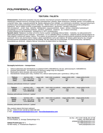 TEKTURA FALISTA Zastosowanie: Znakomicie sprawdza si przy szeroko rozumianych pracach malarskich i budowlanych (remontach), jako rewelacyjny materiał ochronny chroni cy przed uszkodzeniami: parkiety, płytki ceramiczne, terakot , panele i inne podło a lub rozlaniem farby, kleju, rozpuszczalników itp. Bardzo efektywnie tłumi d wi ki, a w odró nieniu od pianek z tworzyw sztucznych, pochłania par wodn pozwalaj c drewnu oddycha . Bardzo dobry do wyrównywania podło a pod panele podłogowe i wykładziny. Jest to idealny produkt uzupełniaj cy, komplementarny asortyment narz dzi malarskich farb emulsyjnych , emalii , bejc , lakierów, impregnatów ,rozpuszczalników , klejów , tynków ,materiałów budowlanych wszystkiego co mo e zaszkodzi podłodze , panelom, parkietowi , terakocie , itp. w trakcie remontów. Produkt bezpieczny dla rodowiska , ekologiczny w 100 % przetwarzalny. Sposób u ycia: Najlepsze rezultaty ochronne mo na uzyska rozkładaj c tektur falista – malarsk na całej powierzchni gdzie b d prowadzone prace malarsko – budowlane z 5 cm zakładk tektury na tektur i sklejenie ta m samoprzylepna na całej długo ci rozło onych pasów tektury. Przy wej ciu do pomieszcze wskazane jest poło nie podwójnej warstwy tektury w granicach 1m2 w celu wzmocnienia miejsca gdzie cz stotliwo ruchu jest wi ksza. W miejscu gdzie ł czymy si z drugim pomieszczeniem przyklejamy tektur do litej podłogi tak aby cało si nie przesuwała. Po sko czonej pracy sprz tamy pozostało ci po remoncie , zwijamy tektur i wrzucamy do pojemników na makulatur . Szczegóły techniczno – transportowe: 1. 2. 3. 4. Tektura pakowana jest standardowo na paletach EUR (1200x800mm) lub tzw. jednorazowych (1200x800mm) Dostawy jednostkowe* s realizowane w obszarze całego kraju do 48 godzin. Realizujemy tak e dostawy cało samochodowe TIR. Standardowe nawoje-patrz ni ej, mo liwe inne, tektura wykonywana jest z gramatury ( 200 gr./m2) Tektura falista 15m2 wymiary rolki (szer. x dł.) [(m)] 1,0 x 15m2/mb waga rolki (kg) 3,0 ilo rolek na palecie ( sztuki) 30 waga palety netto (kg) 90 waga palety brutto (kg) 95 waga rolki (kg) 5,0 ilo rolek na palecie ( sztuki) 22 waga palety netto (kg) 110 waga palety brutto (kg) 115 waga rolki (kg) 7,0 ilo rolek na palecie ( sztuki) 12 waga palety netto (kg) 84 waga palety brutto (kg) 91 Dostawy jednostkowe minimum 1 paleta* Tektura falista 25m2 wymiary rolki (szer. x dł.) [(m)] 1,0 x 25m2/mb Dostawy jednostkowe minimum 1 paleta* Tektura falista 35m2 wymiary rolki (szer. x dł.) [(m)] 1,0 x 35m2/mb Dostawy jednostkowe minimum 1 paleta* Aby uzyska wi cej informacji zadzwo : tel./fax.: 0048 012 641 06 86 lub 0509 095 905 e-mail: [email protected] , [email protected] Biuro Handlowe: 31-619 Kraków, ul. Jerzego Zawieyskiego 4/1a Zakład Produkcyjny nr 1: 42-660 Kalety, ul. Powsta ców l skich 4 tel./fax: +48 12 641 06 86, 641 07 68 mobile +48 0509 095 905 [email protected] [email protected] www.polpaperplus.com