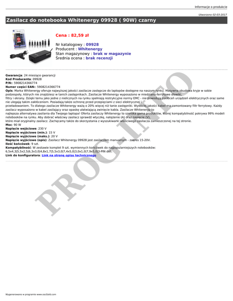Informacje o produkcie Utworzono 02-03-2017 Zasilacz do notebooka Whitenergy 09928 ( 90W) czarny Cena : 82,59 zł Nr katalogowy : 09928 Producent : Whitenergy Stan magazynowy : brak w magazynie Średnia ocena : brak recenzji PR O G -I N FO Gwarancja: 24 miesiące gwarancji Kod Producenta: 09928 P/N:: 5908214366774 Numer części EAN:: 5908214366774 Opis: Marka Whitenergy oferuje najwyższej jakości zasilacze zastępcze do laptopów dostępne na naszym rynku. Masywna obudowa kryje w sobie podzespoły, których nie znajdziesz w tanich zastępnikach. Zasilacze Whitenergy wyposażono w miedziano-ferrytowe dławiki, filtry i ekrany. Dzięki temu jako jedne z nielicznych na rynku spełniają restrykcyjne normy EMC - nie powodują zakłóceń urządzeń elektrycznych oraz same nie ulegają takim zakłóceniom. Posiadają także ochronę przed przepięciami z sieci elektrycznej i przeładowaniem. To dlatego zasilacze Whitenergy ważą o 20% więcej niż tanie zastępniki. Wysokiej jakości kabel ma zamontowany filtr ferrytowy. Każdy zasilacz wyposażono w kabel zasilający oraz opaskę ułatwiającą zwinięcie kabla. Zasilacze Whitenergy to najlepsza alternatywa zasilania dla Twojego laptopa! Oferta zasilaczy Whitenergy to szeroka gama produktów, której kompatybilność pokrywa 99% modeli notebooków na rynku. Aby dobrać właściwy zasilacz sprawdź wtyczkę, natężenie (A) oraz napięcie (V), które miał oryginalny zasilacz. Zachęcamy także do skorzystania z wyszukiwarki właściwego zasilacza zamieszczonej na tej stronie. Moc: 90 W Napięcie wejściowe: 230 V Napięcie wyjściowe (min.): 15 V Napięcie wyjściowe (maks.): 20 V Napięcie wyjściowe (opis): Zasilacz Whitenergy 09928 jest zasilaczem manualnym - zakres 15-20V. Ilość końcówek: 9 szt. Kompatybilność: W zestawie komplet 9 szt. wymiennych końcówek do najpopularniejszych notebooków: 6,5x4,3|5,5x2,5|6,3x3,0|4,8x1,7|5,5x3,0|7,4x5,0|3,0x1,0|7,9x5,0|3-PIN dell. Link do konfiguratora: Link na stronę opisu technicznego Wygenerowano w programie www.oscGold.com