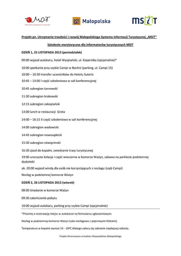 Projekt pn. Utrzymanie trwałości i rozwój Małopolskiego Systemu Informacji Turystycznej „MSIT” Szkolenie merytoryczne dla informatorów turystycznych MSIT DZIEŃ 1, 25 LISTOPADA 2013 (poniedziałek) 09:00 wyjazd autokaru, hotel Wyspiański, ul. Kopernika (opcjonalnie)* 10:00 spotkanie przy szybie Campi w Bochni (parking, ul. Campi 15) 10:00 – 10:30 transfer uczestników do Hotelu Sutoris 10:45 – 13:00 I część szkoleniowa w sali konferencyjnej 10:45 subregion tarnowski 11:30 subregion krakowski 12:15 subregion zakopiański 13:00 lunch w restauracji Grota 14:00 – 16:15 II część szkoleniowa w sali konferencyjnej 14:00 subregion wadowicki 14:45 subregion nowosądecki 15:30 subregion oświęcimski 16:30 zjazd do kopalni, zwiedzanie trasy turystycznej 19:00 uroczysta kolacja i część wieczorna w komorze Ważyn, zabawa na parkiecie podziemnej dyskoteki ok. 20:00 wyjazd windą dla osób nie korzystających z noclegu (szyb Campi) Nocleg w podziemnej komorze Ważyn DZIEŃ 2, 26 LISTOPADA 2013 (wtorek) 08:00 śniadanie w komorze Ważyn 09:30 zakończenie pobytu 10:00 wyjazd autokaru, parking przy szybie Campi (opcjonalnie) *Prosimy o rezerwację miejsc w autokarze na formularzu zgłoszeniowym. Nocleg w podziemnej komorze Ważyn (sala noclegowa z piętrowymi łóżkami). Temperatura w kopalni wynosi 14 - 16ºC dlatego zaleca się zabranie cieplejszej odzieży. Projekt sfinansowany w budżetu Województwa Małopolskiego