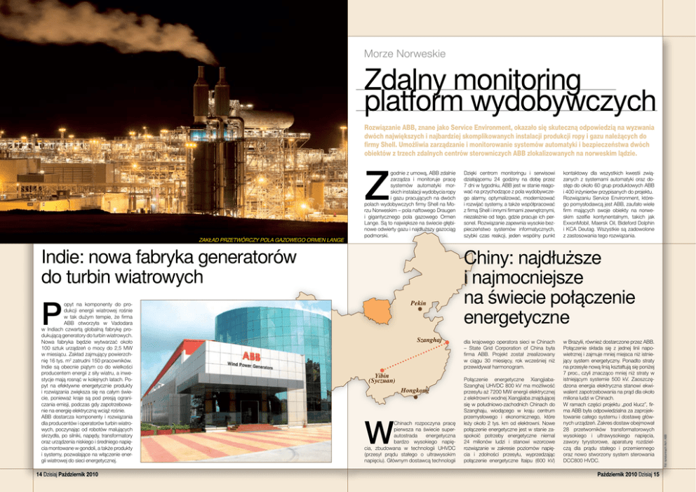 Wydarzenia Morze Norweskie Zdalny monitoring platform wydobywczych Rozwiązanie ABB, znane jako Service Environment, okazało się skuteczną odpowiedzią na wyzwania dwóch największych i najbardziej skomplikowanych instalacji produkcji ropy i gazu należących do firmy Shell. Umożliwia zarządzanie i monitorowanie systemów automatyki i bezpieczeństwa dwóch obiektów z trzech zdalnych centrów sterowniczych ABB zlokalizowanych na norweskim lądzie. zakład przetwórczy pola gazowego ormen lange Indie: nowa fabryka generatorów do turbin wiatrowych P opyt na komponenty do produkcji energii wiatrowej rośnie w tak dużym tempie, że firma ABB otworzyła w Vadodara w Indiach czwartą globalną fabrykę produkującą generatory do turbin wiatrowych. Nowa fabryka będzie wytwarzać około 100 sztuk urządzeń o mocy do 2,5 MW w miesiącu. Zakład zajmujący powierzchnię 16 tys. m2 zatrudni 150 pracowników. Indie są obecnie piątym co do wielkości producentem energii z siły wiatru, a inwestycje mają rosnąć w kolejnych latach. Popyt na efektywne energetycznie produkty i rozwiązania zwiększa się na całym świecie, ponieważ kraje są pod presją ograniczania emisji, podczas gdy zapotrzebowanie na energię elektryczną wciąż rośnie. ABB dostarcza komponenty i rozwiązania dla producentów i operatorów turbin wiatrowych, poczynając od robotów malujących skrzydła, po silniki, napędy, transformatory oraz urządzenia niskiego i średniego napięcia montowane w gondoli, a także produkty i systemy, pozwalające na włączenie energii wiatrowej do sieci energetycznej. 14 Dzisiaj Październik 2010 Pekin Szanghaj Yibin (Syczuan) W Hongkong Chinach rozpoczyna pracę pierwsza na świecie superautostrada energetyczna bardzo wysokiego napięcia, zbudowana w technologii UHVDC (przesył prądu stałego o ultrawysokim napięciu). Głównym dostawcą technologii Dzięki centrom monitoringu i serwisowi działającemu 24 godziny na dobę przez 7 dni w tygodniu, ABB jest w stanie reagować na przychodzące z pola wydobywczego alarmy, optymalizować, modernizować i rozwijać systemy, a także współpracować z firmą Shell i innymi firmami zewnętrznymi, niezależnie od tego, gdzie pracuje ich personel. Rozwiązanie zapewnia wysokie bezpieczeństwo systemów informatycznych, szybki czas reakcji, jeden wspólny punkt kontaktowy dla wszystkich kwestii związanych z systemami automatyki oraz dostęp do około 60 grup produktowych ABB i 400 inżynierów przypisanych do projektu. Rozwiązaniu Service Environment, którego pomysłodawcą jest ABB, zaufało wiele firm mających swoje obiekty na norweskim szelfie kontynentalnym, takich jak ExxonMobil, Maersk Oil, Bideford Dolphin i KCA Deutag. Wszystkie są zadowolone z zastosowania tego rozwiązania. Chiny: najdłuższe i najmocniejsze na świecie połączenie energetyczne dla krajowego operatora sieci w Chinach – State Grid Corporation of China była firma ABB. Projekt został zrealizowany w ciągu 30 miesięcy, rok wcześniej niż przewidywał harmonogram. Połączenie energetyczne XiangjiabaSzanghaj UHVDC 800 kV ma możliwość przesyłu aż 7200 MW energii elektrycznej z elektrowni wodnej Xiangjiaba znajdującej się w południowo-zachodnich Chinach do Szanghaju, wiodącego w kraju centrum przemysłowego i ekonomicznego, które leży około 2 tys. km od elektrowni. Nowe połączenie energetyczne jest w stanie zaspokoić potrzeby energetyczne niemal 24 milionów ludzi i stanowi wzorcowe rozwiązanie w zakresie poziomów napięcia i zdolności przesyłu, wyprzedzając połączenie energetyczne Itaipu (600 kV) w Brazylii, również dostarczone przez ABB. Połączenie składa się z jednej linii napowietrznej i zajmuje mniej miejsca niż istniejący system energetyczny. Ponadto straty na przesyle nową linią kształtują się poniżej 7 proc., czyli znacząco mniej niż straty w istniejącym systemie 500 kV. Zaoszczędzona energia elektryczna stanowi ekwiwalent zapotrzebowania na prąd dla około miliona ludzi w Chinach. W ramach części projektu „pod klucz”, firma ABB była odpowiedzialna za zaprojektowanie całego systemu i dostawę głównych urządzeń. Zakres dostaw obejmował 28 przetworników transformatorowych wysokiego i ultrawysokiego napięcia, zawory tyrystorowe, aparaturę rozdzielczą dla prądu stałego i przemiennego oraz nowo stworzony system sterowania DCC800 HVDC. Październik 2010 Dzisiaj 15 Fot. na kolumnach: Arch. ABB Z godnie z umową, ABB zdalnie zarządza i monitoruje pracę systemów automatyki morskich instalacji wydobycia ropy i gazu pracujących na dwóch polach wydobywczych firmy Shell na Morzu Norweskim – pola naftowego Draugen i gigantycznego pola gazowego Ormen Lange. Są to największe na świecie głębinowe odwierty gazu i najdłuższy gazociąg podmorski.