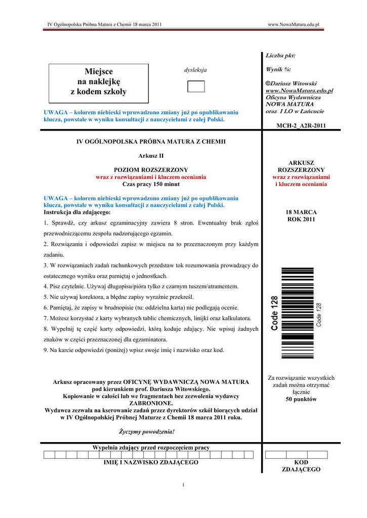 IV Ogólnopolska Próbna Matura z Chemii 18 marca 2011