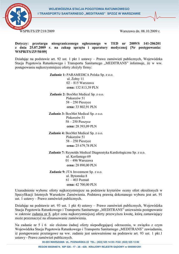 WSPRiTS/ZP/218/2009 Warszawa dn. 08.10.2009 r. Dotyczy: przetargu nieograniczonego ogłoszonego w TED nr 2009/S 141-206201 z dnia 25.07.2009 r. na zakup sprzętu i aparatury medycznej [Nr postępowania: WSPRiTS/ZP/50/09] Działając na podstawie art. 92 ust. 1 pkt 1 ustawy – Prawo zamówień publicznych, Wojewódzka Stacja Pogotowia Ratunkowego i Transportu Sanitarnego „MEDITRANS” informuje, Ŝe w ww. postępowaniu najkorzystniejsze oferty złoŜyły firmy: Zadanie 1: PARAMEDICA Polska Sp. z o.o. ul. śołny 11 02 – 815 Warszawa cena: 132 813,39 PLN Zadanie 2: BoxMet Medical Sp. z o.o. Piskorzów 51 58 – 250 Pieszyce cena: 33 802,91 PLN Zadanie 3: BoxMet Medical Sp. z o.o. Piskorzów 51 58 – 250 Pieszyce cena: 28 393,09 PLN Zadanie 4: BoxMet Medical Sp. z o.o. Piskorzów 51 58 – 250 Pieszyce cena: 25 679,78 PLN Zadanie 7: Reynolds Medical Diagnostyka Kardiologiczna Sp. z o.o. ul. Korfantego 69 01 – 496 Warszawa cena: 28 890,00 PLN Zadanie 9: JTA Investment Sp. z o.o. ul. Bytomska 8 61 – 403 Poznań cena: 42 700,00 PLN Uzasadnienie wyboru: oferty najkorzystniejsze na podstawie kryteriów oceny ofert określonych w Specyfikacji Istotnych Warunków Zamówienia. Podstawą prawną dokonanego wyboru jest art. 91 ust. 1 ustawy – Prawo zamówień publicznych. Działając na podstawie art. 93 ust. 1 pkt 4) ustawy – Prawo zamówień publicznych, Wojewódzka Stacja Pogotowia Ratunkowego i Transportu Sanitarnego „MEDITRANS” uniewaŜnia postępowanie w zakresie zadania nr 8, gdyŜ cena najkorzystniejszej oferty przewyŜsza kwotę, którą zamawiający moŜe przeznaczyć na sfinansowanie zamówienia. Na zadanie nr 5 i 6 nie złoŜono Ŝadnej oferty niepodlegającej odrzuceniu, w związku z czym Wojewódzka Stacja Pogotowia Ratunkowego i Transportu Sanitarnego „MEDITRANS” zawiadamia, iŜ postępowanie przetargowe na ww. zadanie jest uniewaŜnione na podstawie art. 93 ust. 1 pkt.1 ustawy - Prawo zamówień publicznych. Pozostali Wykonawcy, którzy złoŜyli oferty w ww. postępowaniu: Zadanie 1: BoxMet Medical Sp. z o.o. Piskorzów 51 58 – 250 Pieszyce Punktacja w kryterium: cena – 69,69; Łączna punktacja: 69,69 EMERGENCY MEDICAL SYSTEM POLAND Sp. z o.o. ul. Ułanów 7 20 – 554 Lublin Punktacja w kryterium: cena – 83,65; Łączna punktacja: 83,65 Zadanie 2: PARAMEDICA Polska Sp. z o.o. ul. śołny 11 02 – 815 Warszawa Punktacja w kryterium: cena – 54,76; Łączna punktacja: 54,76 Zadanie 3: PARAMEDICA Polska Sp. z o.o. ul. śołny 11 02 – 815 Warszawa Punktacja w kryterium: cena – 81,95; Łączna punktacja: 81,95 EMERGENCY MEDICAL SYSTEM POLAND Sp. z o.o. ul. Ułanów 7 20 – 554 Lublin Punktacja w kryterium: cena – 80,33; Łączna punktacja: 80,33 Zadanie 4: PARAMEDICA Polska Sp. z o.o. ul. śołny 11 02 – 815 Warszawa Punktacja w kryterium: cena – 49,90; Łączna punktacja: 49,90 EMERGENCY MEDICAL SYSTEM POLAND Sp. z o.o. ul. Ułanów 7 20 – 554 Lublin Punktacja w kryterium: cena – 44,43; Łączna punktacja: 44,43 Firmy, która wygrały postępowanie po terminie 10 dni od daty otrzymania niniejszego pisma są zobowiązane do wypełnienia i przesłania umowy, która była załącznikiem do SIWZ, zgodnie z art. 94 ust. 1 ustawy – Prawo zamówień publicznych. Załącznikiem do umowy musi być formularz cenowy złoŜony w ofercie. JeŜeli Wykonawca, którego oferta została wybrana, uchyla się od zawarcia umowy w sprawie zamówienia publicznego, Zamawiający na podstawie art. 94 ust. 2 ustawy – Prawo zamówień publicznych wybiera ofertę najkorzystniejszą spośród pozostałych ofert, bez przeprowadzania ich ponownej oceny lub w przypadku, gdy nie ma Ŝadnych ofert – uniewaŜnia postępowanie. Dyrektor Artur Kamecki