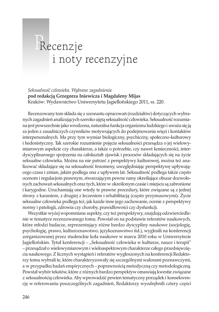 RRecenzje i noty recenzyjne Seksualność człowieka. Wybrane zagadnienia pod redakcją Grzegorza Iniewicza i Magdaleny Mijas Kraków: Wydawnictwo Uniwersytetu Jagiellońskiego 2011, ss. 220. Recenzowany tom składa się z szesnastu opracowań (rozdziałów) dotyczących wybranych zagadnień analizujących szeroko ujętą seksualność człowieka. Seksualność rozumiana jest powszechnie jako wrodzona, naturalna funkcja organizmu ludzkiego i uważa się ją za jeden z zasadniczych czynników motywujących do podejmowania więzi i kontaktów interpersonalnych. Ma przy tym wymiar biologiczny, psychiczny, społeczno-kulturowy i hedonistyczny. Tak szerokie rozumienie pojęcia seksualności przesądza o jej wielowymiarowym aspekcie czy charakterze, a także o potrzebie, czy nawet konieczności, interdyscyplinarnego spojrzenia na całokształt zjawisk i procesów składających się na życie seksualne człowieka. Można na nie patrzeć z perspektywy kulturowej, można też analizować składające się na seksualność fenomeny, uwzględniając perspektywę upływającego czasu i zmian, jakim podlega ona z upływem lat. Seksualność podlega także często ocenom i regulacjom prawnym, stwarzającym pewne ramy określające obszar dozwolonych zachowań seksualnych oraz tych, które w określonym czasie i miejscu są zabronione i karygodne. Uruchamiają one wtedy te prawne procedury, które związane są z jednej strony z karaniem, z drugiej z leczeniem i rehabilitacją (często przymusowymi). Życie seksualne człowieka podlega też, jak każde inne jego zachowanie, ocenie z perspektywy normy i patologii, zdrowia czy choroby, prawidłowości czy dysfunkcji. Wszystkie wyżej wspomniane aspekty, czy też perspektywy, znajdują odzwierciedlenie w tematyce recenzowanego tomu. Powstał on na podstawie referatów naukowych, które młodzi badacze, reprezentujący różne bardzo dyscypliny naukowe (socjologię, psychologię, prawo, kulturoznawstwo, językoznawstwo itd.), wygłosili na konferencji zorganizowanej przez studenckie koła naukowe w marcu 2010 roku w Uniwersytecie Jagiellońskim. Tytuł konferencji – „Seksualność człowieka w kulturze, nauce i terapii” – przesądzał o wielowymiarowym i wieloaspektowym charakterze całego przedsięwzięcia naukowego. Z licznych wystąpień i referatów wygłoszonych na konferencji Redaktorzy tomu wybrali te, które charakteryzowały się szczególnymi walorami poznawczymi, a w przypadku badań empirycznych – poprawnością metodyczną czy metodologiczną. Powstał wybór tekstów, które z różnych bardzo perspektyw omawiają kwestie związane z seksualnością człowieka. Aby wprowadzić pewien tematyczny porządek i konsekwencję w referowaniu poszczególnych zagadnień, Redaktorzy wyodrębnili cztery części 246 7–8/2012 Recenzje i noty recenzyjne książki. Pierwsza z nich nosi tytuł Seksualność z perspektywy kulturowej i składa się z czterech rozdziałów. Pierwszy z nich ma charakter empirycznej analizy socjolingwistycznej. Jest to praca autorstwa Katarzyny Salwy, poświęcona dyskursowi medialnemu w Polsce i Szwecji, dotyczącemu mniejszości homoseksualnych, na przykładzie artykułów z prasy ogólnokrajowej. Podobny empiryczny charakter ma opracowanie Moniki Żaby i Edyty Charzyńskiej na temat opinii polskich i niemieckich studentów dotyczących osób homoseksualnych. Niewątpliwie kulturowy charakter mają dwa kolejne podrozdziały pierwszej części tomu. Pierwszy, którego autorem jest Tomasz Burdzik, dotyczy hentai – tj. seksu w japońskich kreskówkach, kolejny omawia, z perspektywy także historycznej, kwestie związane z traktowaniem seksu w dawnym ZSRR (ZSRR. Seks, którego nie było). Autorką tego rozdziału jest Volga Yerafeyenka. Wszystkie cztery wspomniane wyżej rozdziały są bardzo ciekawe i oryginalne, dobrze napisane, poprawne pod względem metodologicznym, dobrze uzasadnione literaturą przedmiotu. Druga część tomu zatytułowana została Seksualność na przestrzeni czasu i obejmuje trzy rozdziały. Dwa pierwsze mają ewidentnie historyczny wymiar, omawiają bowiem kolejno poglądy Stanisława Kurkiewicza, żyjącego na przełomie XIX i XX w. krakowskiego lekarza, prekursora polskiej seksuologii (autor rozdziału Marcin Czajkowski), a także prezentują przegląd wczesnych polskich koncepcji psychopatologicznych dotyczących seksualności (autorstwa Miry Marcinów). Oba rozdziały oparte są na szerokich danych literaturowych, są doskonale napisane i stanowią ciekawą literaturę dla każdego, kto zainteresowany jest historią polskiej myśli seksuologicznej. Rozdział trzeci, napisany przez Monikę Marczak, jest empirycznym studium przemian, jakim z upływem lat podlegają zachowania seksualne młodzieży. To rzetelnie przeprowadzona analiza, której historyczny charakter ma nieco inny wymiar niż dwie poprzednie prace. Analizie poddane zostały bowiem procesy, mechanizmy i czynniki wpływające na zmianę zachowań seksualnych. Seksualność poza granicami prawa to tytuł trzeciej części książki. Składają się na nią trzy rozdziały. Pierwszy porusza zagadnienie od lat stanowiące temat tabu, a odnoszące się do problematyki wykorzystania seksualnego przez kobiety-sprawczynie. To prawda, że przypadków takich notuje się niewiele, prawdą jest jednak i to, iż niechętnie się o nich pisze i brak jest, zwłaszcza w polskiej literaturze przedmiotu, szerszych, pogłębionych, aktualnych opracowań naukowych na ten temat. Wszystkie te warunki spełnia rozdział Marceliny Westphal pt. Dziewczynki tego nie robią? czyli kobieta jako sprawca wykorzystania seksualnego. Podobnie pozytywnie ocenić należy rozdział prawnika i psychologa Pawła Marcinkiewicza, który na podstawie szerokiej, aktualnej, światowej literatury scharakteryzował psychologiczną sylwetkę (sylwetki?) sprawców seryjnych przestępstw seksualnych. Anna Roszczyk jest autorką trzeciego rozdziału tej części książki, z