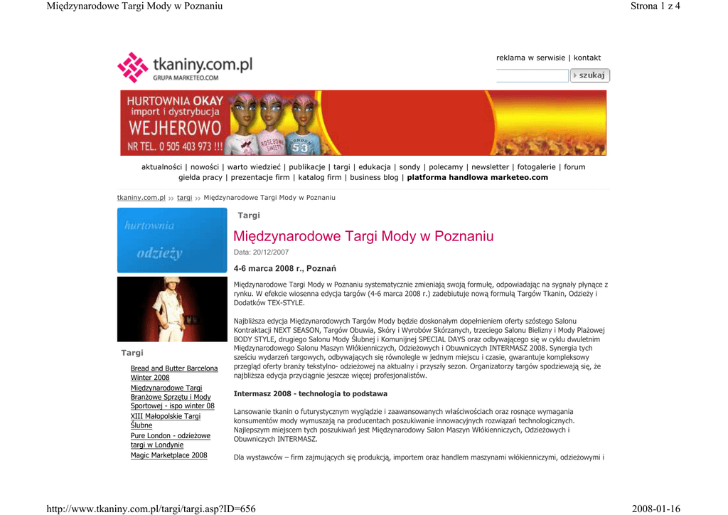 Międzynarodowe Targi Mody w Poznaniu Strona 1 z 4 reklama w serwisie | kontakt aktualności | nowości | warto wiedzieć | publikacje | targi | edukacja | sondy | polecamy | newsletter | fotogalerie | forum giełda pracy | prezentacje firm | katalog firm | business blog | platforma handlowa marketeo.com tkaniny.com.pl targi Międzynarodowe Targi Mody w Poznaniu Targi Międzynarodowe Targi Mody w Poznaniu Data: 20/12/2007 4-6 marca 2008 r., Poznań Międzynarodowe Targi Mody w Poznaniu systematycznie zmieniają swoją formułę, odpowiadając na sygnały płynące z rynku. W efekcie wiosenna edycja targów (4-6 marca 2008 r.) zadebiutuje nową formułą Targów Tkanin, OdzieŜy i Dodatków TEX-STYLE. Targi Bread and Butter Barcelona Winter 2008 Międzynarodowe Targi BranŜowe Sprzętu i Mody Sportowej - ispo winter 08 XIII Małopolskie Targi Ślubne Pure London - odzieŜowe targi w Londynie Magic Marketplace 2008 NajbliŜsza edycja Międzynarodowych Targów Mody będzie doskonałym dopełnieniem oferty szóstego Salonu Kontraktacji NEXT SEASON, Targów Obuwia, Skóry i Wyrobów Skórzanych, trzeciego Salonu Bielizny i Mody PlaŜowej BODY STYLE, drugiego Salonu Mody Ślubnej i Komunijnej SPECIAL DAYS oraz odbywającego się w cyklu dwuletnim Międzynarodowego Salonu Maszyn Włókienniczych, OdzieŜowych i Obuwniczych INTERMASZ 2008. Synergia tych sześciu wydarzeń targowych, odbywających się równolegle w jednym miejscu i czasie, gwarantuje kompleksowy przegląd oferty branŜy tekstylno- odzieŜowej na aktualny i przyszły sezon. Organizatorzy targów spodziewają się, Ŝe najbliŜsza edycja przyciągnie jeszcze więcej profesjonalistów. Intermasz 2008 - technologia to podstawa Lansowanie tkanin o futurystycznym wyglądzie i zaawansowanych właściwościach oraz rosnące wymagania konsumentów mody wymuszają na producentach poszukiwanie innowacyjnych rozwiązań technologicznych. Najlepszym miejscem tych poszukiwań jest Międzynarodowy Salon Maszyn Włókienniczych, OdzieŜowych i Obuwniczych INTERMASZ. Dla wystawców – firm zajmujących się produkcją, importem oraz handlem maszynami włókienniczymi, odzieŜowymi i http://www.tkaniny.com.pl/targi/targi.asp?ID=656 2008-01-16 Międzynarodowe Targi Mody w Poznaniu więcej Aktualności Strona 2 z 4 obuwniczymi – targi są nie tylko miejscem prezentacji technologicznych nowości, ale takŜe okazją do kontaktu z uczestnikami targów odzieŜy i obuwia. Tex-Style - poczuj puls mody Bytom kupi Intermoda Fashion za ponad 9 mln zł Gino Rossi pozyskało nową markę Paprocki i Brzozowski projektują dla Reserved Recykling multiplikacje recyklingowy pokaz mody Przychody Monnari Trade wzrosły o 69,7% r/r do 20,2 mln zł w grudniu więcej Odmienione Targi OdzieŜy, Tkanin i Dodatków TEX-STYLE zapewnią profesjonalistom działającym w branŜy tekstylnej optymalne warunki do realizacji wszelkich działań biznesowych. Targi skierowane są przede wszystkim do producentów i importerów tkanin oraz dodatków krawieckich. Ich mocnym atutem są profesjonalne szkolenia i seminaria dotyczące handlu, marketingu i zarządzania oraz tendencji w modzie. Next Season - elitarne kontraktacje Salon Kontraktacji w Poznaniu, oferujący kolekcje mody damskiej, męskiej i dziecięcej na przyszłe sezony, jest stosunkowo młodą, ale juŜ sprawdzoną formą spotkań biznesowych polskiej branŜy odzieŜowej z odbiorcami z całego świata. Podczas najbliŜszej, wiosennej edycji kontraktowane będą kolekcje na sezon jesień-zima 2008/09. Dla wystawców – producentów i dystrybutorów marek odzieŜy i akcesoriów – Salon Kontraktacji w Poznaniu jest doskonałą okazją do budowania i umacniania wizerunku marki, spotkania ze stałymi partnerami handlowymi oraz pozyskania nowych odbiorców z kraju i zagranicy. Mocnymi atutami Salonu Kontraktacji są widowiskowe pokazy mody i najwyŜszy poziom serwisu targowego. Jakość prezentowanych kolekcji potwierdzają Złote Medale przyznane wystawcom – jesienią 2007 r. nagrodzono aŜ 9 produktów. Body Style - konsolidacja branŜy Kontraktacyjna formuła Salonu Bielizny i Mody PlaŜowej BODY STYLE z kaŜdą edycją zyskuje większe zainteresowanie profesjonalistów – producentów, importerów i handlowców, którzy w uczestnictwie w targach widzą oszczędność czasu i pieniędzy. Prezentacje firm Aspiris Outlet fhu INN Jeans Mazbit Scyntia P.P.H.U MICHAŁ agatex Talia PPUH NATMART ppuh aga Wystawcy podkreślają, Ŝe są to targi, na których po prostu trzeba być z uwagi na optymalne warunki do promowania marki, zasygnalizowanie jej obecności na rynku, uczynienie jej bardziej rozpoznawalną oraz umacnianie kontaktów biznesowych z dotychczasowymi odbiorcami, a takŜe, by pozyskać nowych klientów. Special Days - na wyjątkowe okazje Salon wyznacza nowy, dotychczas nie praktykowany kierunek w handlu modą okazjonalną – kontraktowanie kolekcji do salonów ślubnych. Udany debiut pozwala przypuszczać, Ŝe Salon Mody Ślubnej i Komunijnej SPECIAL DAYS, podobnie jak Next Season czy Body Style, będzie się dynamicznie rozwijał. Wokół skóry więcej Biuletyn Informacje o nowościach wysyłane na Twój e-mail Pełna gama obuwia, galanterii i odzieŜy skórzanej na najbliŜszy sezon oraz skóry i inne materiały dla branŜy skórzanej i obuwniczej złoŜą się na ofertę Targów Obuwia, Skóry i Wyrobów Skórzanych. Więcej informacji: www.fashion.mtp.pl, www.fashioninpoland.mtp.pl http://www.tkaniny.com.pl/targi/targi.asp?ID=656 2008-01-16