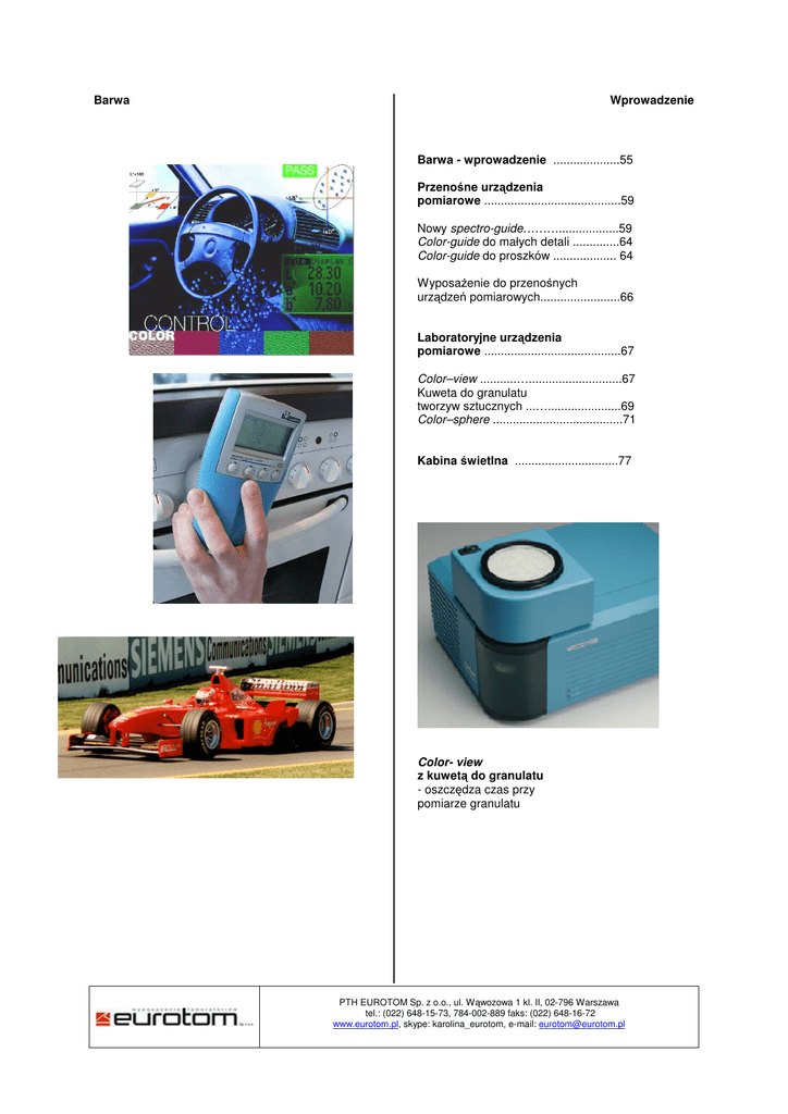 Barwa Wprowadzenie Barwa - wprowadzenie ....................55 Przenośne urządzenia pomiarowe .........................................59 Nowy spectro-guide………..................59 Color-guide do małych detali ..............64 Color-guide do proszków ................... 64 Wyposażenie do przenośnych urządzeń pomiarowych........................66 Laboratoryjne urządzenia pomiarowe .........................................67 Color–view ...........…............................67 Kuweta do granulatu tworzyw sztucznych ...…......................69 Color–sphere .......................................71 Kabina świetlna ...............................77 Color- view z kuwetą do granulatu - oszczędza czas przy pomiarze granulatu PTH EUROTOM Sp. z o.o., ul. Wąwozowa 1 kl. II, 02-796 Warszawa tel.: (022) 648-15-73, 784-002-889 faks: (022) 648-16-72 www.eurotom.pl, skype: karolina_eurotom, e-mail: [email protected] Barwa Wprowadzenie Postrzeganie barwy Dziesięć milionów - tak wiele tonacji barwy może rozróżniać oko ludzkie. Nic więc dziwnego, że nie możemy barwy dokładnie zatrzymać w pamięci, nie mówiąc już o ponownym rozpoznawaniu określonej barwy. Do tego barwa zyskuje coraz większe znaczenie jako kryterium jakości w przemyśle. Jednolity odcień barwy gra dzisiaj dużą rolę w przypadku wielu produktów. Jest to trudne do osiągnięcia już wówczas, gdy poszczególne elementy produkowane są w różnych oddziałach jednej firmy, a będzie się jeszcze bardziej komplikować, gdy będą one pochodzić od różnych dostawców. Ostatecznie jednak barwa musi być identyczna! spectro-guide gloss - pomiar barwy i połysku jednym urządzeniem Wizualna ocena barwy zależy w dużej mierze od zdolności postrzegania barw przez indywidualnego obserwatora, a także jego wieku czy np. aktualnego nastroju. Wpływają też na to czynniki zewnętrzne, jak barwa otoczenia i jasność. Ograniczone są również nasze możliwości precyzyjnego opisywania i dokumentowania barw i ich różnic. Jedynym sensownym rozwiązaniem jest zastosowanie przyrządów do pomiaru barwy, spełniających wymogi i założenia znormalizowanych systemów barw, akceptowanych na forum międzynarodowym. Tylko w ten sposób możemy zapewnić obiektywną ocenę i kontrolę barw. Na postrzeganie barwy wpływ mają następujące trzy podstawowe elementy: • • • źródło światła obserwator próbka software easy-link - przenoszenie danych bezpośrednio do Excela PTH EUROTOM Sp. z o.o., ul. Wąwozowa 1 kl. II, 02-796 Warszawa tel.: (022) 648-15-73, 784-002-889 faks: (022) 648-16-72 www.eurotom.pl, skype: karolina_eurotom, e-mail: [email protected] Wprowadzenie Barwa Źródło światła Postrzeganie barw przez oko ludzkie zależy od oświetlenia, chociaż barwa jako własność fizyczna materiału, jest od oświetlenia niezależna. Z tego względu należy definiować źródło światła. Użyte do pomiaru barwy źródło światła musi wykazywać ciągłość energii w całym paśmie spektralnym widzenia (od 400 do 700 nm). jeden z nich reaguje na światło czerwone, drugi na zielone, a trzeci na światło niebieskie. Ich łączne działanie sprawia, że w mózgu powstaje odczucie barwy. Aby określić stopień czułości receptorów, CIE dokonała w latach 1931-1964 systematycznego testowania ludzkiego wzroku. Na podstawie osiągniętych wyników ustalono dwa normatywne kąty obserwacji: 2° i 10°; odpowiadają one mniejszemu i większemu polu widzenia. Białe światło dzienne rozłożone na barwy widmowe (np. tęcza) CIE (Commission Internationale de I’Eclairage – Międzynarodowa Komisja Oświetleniowa) definiuje źródło światła przez ilość emitowanej energii przy każdej długości fali (względny spektralny rozkład energii). Najważniejszymi światła są: • • • znormalizowanymi rodzajami Przy obserwacji przedmiotu sygnał wizualny z oka jest rezultatem całkowania na dużej powierzchni. Ten fakt odzwierciedla najbardziej sytuacja obserwatora znormalizowanego 10°. Obiekt Źródło światła i obserwator zostali określeni normatywnie przez CIE i ich krzywe spektralne zapamiętane w spektrofotometrach do pomiaru barwy. Jedynymi zmiennymi pozostałymi do określenia są optyczne właściwości przedmiotu. Urządzenia do pomiaru barwy mierzą światło odbite od powierzchni przedmiotu. Zjawisko odbicia dotyczy wszystkich długości fali w całym widmie widzialnym, a uzyskane wyniki pomiarów zwane są danymi spektralnymi reflektancji. Przykładowo, czarny przedmiot nie wykaże odbicia światła w całym paśmie widma widzialnego (0% reflektancji), natomiast powierzchnia idealnie biała odbije całe światło (100% reflektancji). Wszystkie inne barwy odbijają światło tylko w określonych strefach spektrum. Stąd każda barwa ma specyficzną krzywą spektralną porównywalną ze wzorem odcisków palców. światło dzienne D65, C światło żarowe A światło świetlówek F2 , F11 Obserwator Obserwator jest ważnym elementem systemu określania barwy. Światło odbite od barwnego przedmiotu trafia do ludzkiego oka, przechodzi przez soczewkę i pada na siatkówkę. Tam znajdują się trzy różne receptory światłoczułe: PTH EUROTOM Sp. z o.o., ul. Wąwozowa 1 kl. II, 02-796 Warszawa tel.: (022) 648-15-73, 784-002-889 faks: (022) 648-16-72 www.eurotom.pl, skype: karolina_eurotom, e-mail: [email protected] Wprowadzenie Barwa Porównuje się tu i ustala oraz zapisuje różnice barwy a nie ich wartości bezwzględne. Zazwyczaj całkowita odchyłka barwy ∆E* stanowi o zgodności barw. ∆E* = [(∆L*)² + (∆a*)² + (∆b*)²]½ Dwie pary próbek mogą wykazywać te same wartości ∆E*, jednak wizualnie okażą się różne. Porównaj przykład ze strony 57 (prawy górny róg) z katalogu 2005/2006 firmy BYK Gardner. Na ilustracjach pokazano typowe krzywe dla barw: czerwonej, niebieskiej i zielonej. Systemy barw Systemy barw są kombinacją pochodzących od trzech elementó