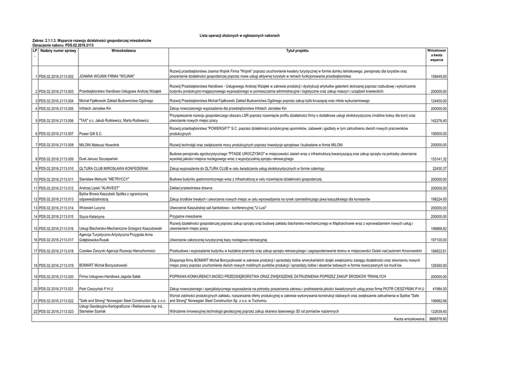 Lista operacji złożonych w ogłoszonych naborach Zakres: 2.1.1.3. Wsparcie rozwoju działalności gospodarczej mieszkańców Oznaczenie naboru: PDS.02.2016.2113 LP Nadany numer sprawy Wnioskodawca . Tytuł projektu Wnioskowan a kwota wsparcia 1 PDS.02.2016.2113.002 JOANNA WOJNIK FIRMA "WOJNIK" Rozwój przedsiębiorstwa Joanna Wojnik Firma "Wojnik" poprzez uruchomienie kwatery turystycznej w formie domku letniskowego, pensjonatu dla turystów oraz poszerzenie działalności gospodarczej poprzez nowe usługi aktywnej turystyki w ramach funkcjonowania przedsiębiorstwa 158449,00 2 PDS.02.2016.2113.003 Przedsiębiorstwo Handlowo Usługowe Andrzej Wziątek Rozwój Przedsiębiorstwa Handlowo - Usługowego Andrzej Wziątek w zakresie produkcji i dystrybucji artykułów galanterii skórzanej poprzez rozbudowę i wykończenie budynku produkcyjno-magazynowego wyposażonego w pomieszczenia administracyjne i logistyczne oraz zakup maszyn i urządzeń krawieckich. 200000,00 3 PDS.02.2016.2113.004 Michał Fijałkowski Zakład Budownictwa Ogólnego Rozwój Przedsiębiorstwa Michał Fijałkowski Zakład Budownictwa Ogólnego poprzez zakup łyżki kruszącej oraz młota wyburzeniowego 124400,00 4 PDS.02.2016.2113.005 Infotech Jarosław Kin Zakup nowoczesnego wyposażenia dla przedsiębiorstwa Infotech Jarosław Kin 200000,00 "TAX" s.c. Jakub Rutkiewicz, Marta Rutkiewicz Przyspieszenie rozwoju gospodarczego obszaru LSR poprzez rozwinięcie profilu działalności firmy o dodatkowe usługi okołoturystyczne (mobilne boksy dla koni) oraz utworzenie nowych miejsc pracy 142276,40 6 PDS.02.2016.2113.007 Power Gift S.C. Rozwój przedsiębiorstwa "POWERGIFT" S.C. poprzez działalności produkcyjnej upominków, zabawek i gadżety w tym zatrudnieniu dwóch nowych pracowników produkcyjnych 195000,00 7 PDS.02.2016.2113.008 MILONI Mateusz Nowotnik Rozwój technolgii oraz zwiększenie mocy produkcyjnych poprzez inwestycje sprzętowe i budowlane w firmie MILONI 200000,00 8 PDS.02.2016.2113.009 Duet Janusz Szczepański Budowa pensjonatu agroturystycznego "PTASIE UROCZYSKO" w miejscowości Jasień wraz z infrastrukturą towarzyszącą oraz zakup sprzętu na potrzeby utworzenia wysokiej jakości miejsca noclegowego wraz z wypożyczalnią sprzętu rekreacyjnego 153141,32 9 PDS.02.2016.2113.010 QLTURA CLUB MIROSŁAWA KONFEDERAK Zakup wyposażenia do QLTURA CLUB w celu świadczenia usług okołoturystycznych w formie cateringu 10 PDS.02.2016.2113.011 Stanisław Metrycki "METRYCCY" Budowa budynku gastronomicznego wraz z infrastrukturą w celu rozwinięcia działalności gospodarczej 200000,00 11 PDS.02.2016.2113.012 Zakład przetwórstwa drewna 200000,00 12 PDS.02.2016.2113.013 Andrzej Lipski "ALINVEST" Bytów Browa Kaszubski Spółka z ograniczoną odpowiedzialnością Zakup środków trwałych i utworzenia nowych miejsc w celu wprowadzenia na rynek rzemieślniczego piwa kaszubksiego dla koneserów 198224,00 13 PDS.02.2016.2113.014 Wrzesień Lucyna Utworzenie Kaszubskiej sali bankietowo - konferencyjnej "U Lusi" 200000,00 14 PDS.02.2016.2113.015 Szyca Katarzyna Przyjazne mieszkanie 200000,00 15 PDS.02.2016.2113.016 Usługi Blacharsko-Mechaniczne Grzegorz Kaszubowski Rozwój działalności gospodarczej poprzez zakup sprzętu oraz budowę zakładu blacharsko-mechanicznego w Mądrzechowie wraz z wprowadzeniem nowych usług i utworzeniem miejsc pracy 199968,82 16 PDS.02.2016.2113.017 Agencja Turystyczno-Artystyczna Przygoda Anna Gołębiowska-Rusak Utworzenie całorocznej turystycznej bazy noclegowo-rekreacyjnej 197100,00 17 PDS.02.2016.2113.018 Czesław Zarzycki Agencja Rozwoju Nieruchomości Przebudowa i wyposażenie budynku w kształcie piramidy oraz zakup sprzętu rekreacyjnego i zagospodarowanie terenu w miejscowości Osieki nad jeziorem Krosnowskim 184622,61 18 PDS.02.2016.2113.019 BOMART Michał Borzyszkowski Ekspansja firmy BOMART Michał Borzyszkowski w zakresie produkcji i sprzedaży lodów amerykańskich dzięki zwiększeniu zasięgu działalności oraz stworzeniu nowych miejsc pracy poprzez uruchomienie dwóch nowych mobilnych punktów produkcji i sprzedaży lodów i deserów lodowych w formie nowoczesnych ice truck'ów. 126360,00 19 PDS.02.2016.2113.020 Firma Usługowo-Handlowa Jagoda Sałak POPRAWA KONKURENCYJNOŚCI PRZEDSIĘBIORSTWA ORAZ ZWIĘKSZENIE ZATRUDNIENIA POPRZEZ ZAKUP ŚRODKÓW TRWAŁYCH 200000,00 20 PDS.02.2016.2113.021 Piotr Cieszyński P.H.U Zakup nowoczesnego i specjalistycznego wyposażenia na potrzeby poszerzenia zakresu i podniesienia jakości świadczonych usług przez firmę PIOTR CIESZYŃSKI P.H.U 5 PDS.02.2016.2113.006 21 PDS.02.2016.2113.022 22 PDS.02.2016.2113.023 22430,37 Wzrost zdolności produkcyjnych zakładu, rozszerzanie oferty produkcyjnej w zakresie wykonywania konstrukcji stalowych oraz zwiększenie zatrudnienia w Spółce "Safe "Safe and Strong" Norwegian Steel Construction Sp. z o.o. and Strong" Norwegian Steel Construction Sp. z o.o. w Tuchomiu Usługi Geodezyjno-Kartograficzne i Reklamowe mgr inż.. Stanisław Szariak Wdrożenie innowacyjnej technologii geodezyjnej poprzez zakup skanera laserowego 3D od pomiarów naziemnych 41984,00 199982,68 122639,40 Kwota wnioskowana: 3666578,60