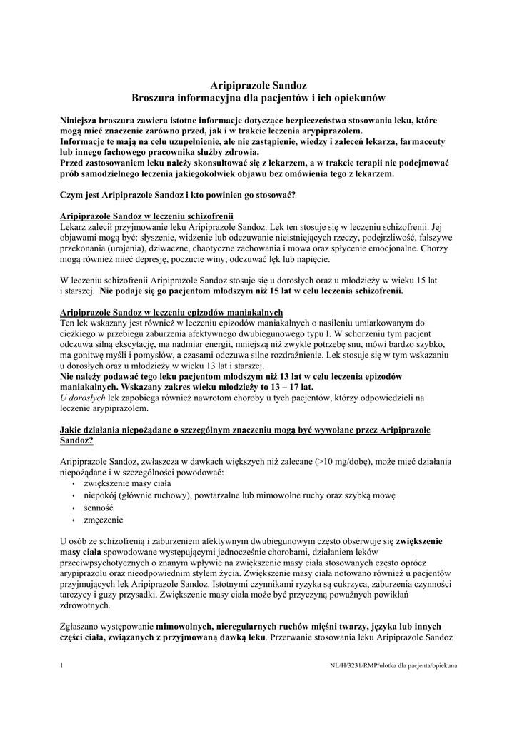 Aripiprazole Sandoz Broszura informacyjna dla pacjentów i ich opiekunów Niniejsza broszura zawiera istotne informacje dotyczące bezpieczeństwa stosowania leku, które mogą mieć znaczenie zarówno przed, jak i w trakcie leczenia arypiprazolem. Informacje te mają na celu uzupełnienie, ale nie zastąpienie, wiedzy i zaleceń lekarza, farmaceuty lub innego fachowego pracownika służby zdrowia. Przed zastosowaniem leku należy skonsultować się z lekarzem, a w trakcie terapii nie podejmować prób samodzielnego leczenia jakiegokolwiek objawu bez omówienia tego z lekarzem. Czym jest Aripiprazole Sandoz i kto powinien go stosować? Aripiprazole Sandoz w leczeniu schizofrenii Lekarz zalecił przyjmowanie leku Aripiprazole Sandoz. Lek ten stosuje się w leczeniu schizofrenii. Jej objawami mogą być: słyszenie, widzenie lub odczuwanie nieistniejących rzeczy, podejrzliwość, fałszywe przekonania (urojenia), dziwaczne, chaotyczne zachowania i mowa oraz spłycenie emocjonalne. Chorzy mogą również mieć depresję, poczucie winy, odczuwać lęk lub napięcie. W leczeniu schizofrenii Aripiprazole Sandoz stosuje się u dorosłych oraz u młodzieży w wieku 15 lat i starszej. Nie podaje się go pacjentom młodszym niż 15 lat w celu leczenia schizofrenii. Aripiprazole Sandoz w leczeniu epizodów maniakalnych Ten lek wskazany jest również w leczeniu epizodów maniakalnych o nasileniu umiarkowanym do ciężkiego w przebiegu zaburzenia afektywnego dwubiegunowego typu I. W schorzeniu tym pacjent odczuwa silną ekscytację, ma nadmiar energii, mniejszą niż zwykle potrzebę snu, mówi bardzo szybko, ma gonitwę myśli i pomysłów, a czasami odczuwa silne rozdrażnienie. Lek stosuje się w tym wskazaniu u dorosłych oraz u młodzieży w wieku 13 lat i starszej. Nie należy podawać tego leku pacjentom młodszym niż 13 lat w celu leczenia epizodów maniakalnych. Wskazany zakres wieku młodzieży to 13 – 17 lat. U dorosłych lek zapobiega również nawrotom choroby u tych pacjentów, którzy odpowiedzieli na leczenie arypiprazolem. Jakie działania niepożądane o szczególnym znaczeniu mogą być wywołane przez Aripiprazole Sandoz? Aripiprazole Sandoz, zwłaszcza w dawkach większych niż zalecane (>10 mg/dobę), może mieć działania niepożądane i w szczególności powodować: zwiększenie masy ciała niepokój (głównie ruchowy), powtarzalne lub mimowolne ruchy oraz szybką mowę senność zmęczenie U osób ze schizofrenią i zaburzeniem afektywnym dwubiegunowym często obserwuje się zwiększenie masy ciała spowodowane występującymi jednocześnie chorobami, działaniem leków przeciwpsychotycznych o znanym wpływie na zwiększenie masy ciała stosowanych często oprócz arypiprazolu oraz nieodpowiednim stylem życia. Zwiększenie masy ciała notowano również u pacjentów przyjmujących lek Aripiprazole Sandoz. Istotnymi czynnikami ryzyka są cukrzyca, zaburzenia czynności tarczycy i guzy przysadki. Zwiększenie masy ciała może być przyczyną poważnych powikłań zdrowotnych. Zgłaszano występowanie mimowolnych, nieregularnych ruchów mięśni twarzy, języka lub innych części ciała, związanych z przyjmowaną dawką leku. Przerwanie stosowania leku Aripiprazole Sandoz 1 NL/H/3231/RMP/ulotka dla pacjenta/opiekuna może spowodować czasowe nasilenie się objawów lub nawet ich wystąpienie. Objawy te mogą zniekształcać wygląd pacjenta i być dla niego kłopotliwe. Pacjent może mieć trudności z utrzymaniem spokoju, mieć zaburzenia rytmu snu, zaburzenia koncentracji lub odczuwać niepokój. Wprawdzie wystąpienie opisanych objawów jest mało prawdopodobne, ale mogą stanowić poważne działanie niepożądane. Ten lek może spowodować zmęczenie i senność. Występują one częściej u młodzieży w wieku od 13 lat niż u dorosłych i obserwowano je częściej u dzieci z zaburzeniem afektywnym dwubiegunowym niż u dzieci ze schizofrenią. W razie zauważenia zwiększenia masy ciała, pojawienia się nietypowych ruchów i (lub) senności, która zaburza codzienne funkcjonowanie, albo jeśli którykolwiek z tych objawów utrzymuje się lub nasila, należy powiedzieć o tym lekarzowi prowadzącemu. Co można zrobić, aby zapobiec wymienionym działaniom niepożądanym lub związanym z nimi powikłaniom? Ważne jest podejmowanie działań w celu zapobiegania wymienionym wyżej objawom lub związanym z nimi powikłaniom. W celu ograniczenia ryzyka należy zastosować pewne środki ostrożności. Przed rozpoczęciem stosowania leku Aripiprazole Sandoz należy poinformować lekarza o wszystkich swoich schorzeniach. Lek należy stosować ostrożnie u osób w podeszłym wieku, gdyż mogą być bardziej wrażliwi na jego działania niepożądane. Możliwość wystąpienia działań niepożądanych jest większa podczas stosowania dawek większych niż 10 mg na dobę. Zwiększenie masy ciała Jeśli pacjent był w przeszłości otyły, należy powiedzieć o tym lekarzowi lub farmaceucie przed rozpoczęciem stosowania tego leku. Lekarz zaleci systematyczne kontrolowanie masy ciała i w razie konieczności rozważy zmniejszenie dawki leku Aripiprazole Sandoz. Niepokój (głównie ruchowy), powtarzalne lub mimowolne ruchy oraz szybka mowa Lekarz będzie uważnie kontrolował, czy u pacjenta nie występują wymienione objawy. Należy niezwłocznie zgłosić lekarzowi pojawienie się niekontrolowanych ruchów mięśni (zwłaszcza twarzy lub języka). Lekarz rozważy, czy konieczne jest w takim wypadku zmniejszenie dawki leku Aripiprazole Sandoz. Senność i (lub) zmęczenie Należy zachować ostrożność podczas wykonywania czynności wymagających skupienia, takich jak prowadzenie pojazdów lub obsługiwanie maszyn. Podczas leczenia należy unikać picia napojów alkoholowych. Dalsze informacje znajdują się w ulotce dla pacjenta dołączonej do opakowania leku. 2 NL/H/3231/RMP/ulotka dla pacjenta/opiekuna