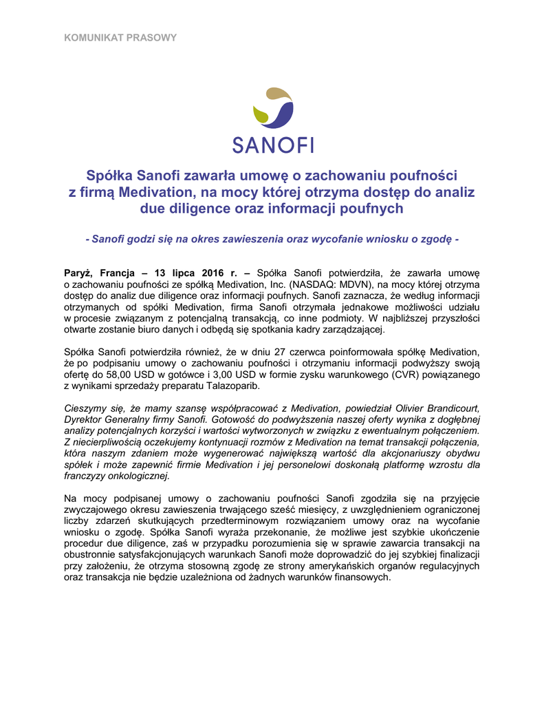 KOMUNIKAT PRASOWY Spółka Sanofi zawarła umowę o zachowaniu poufności z firmą Medivation, na mocy której otrzyma dostęp do analiz due diligence oraz informacji poufnych - Sanofi godzi się na okres zawieszenia oraz wycofanie wniosku o zgodę Paryż, Francja – 13 lipca 2016 r. – Spółka Sanofi potwierdziła, że zawarła umowę o zachowaniu poufności ze spółką Medivation, Inc. (NASDAQ: MDVN), na mocy której otrzyma dostęp do analiz due diligence oraz informacji poufnych. Sanofi zaznacza, że według informacji otrzymanych od spółki Medivation, firma Sanofi otrzymała jednakowe możliwości udziału w procesie związanym z potencjalną transakcją, co inne podmioty. W najbliższej przyszłości otwarte zostanie biuro danych i odbędą się spotkania kadry zarządzającej. Spółka Sanofi potwierdziła również, że w dniu 27 czerwca poinformowała spółkę Medivation, że po podpisaniu umowy o zachowaniu poufności i otrzymaniu informacji podwyższy swoją ofertę do 58,00 USD w gotówce i 3,00 USD w formie zysku warunkowego (CVR) powiązanego z wynikami sprzedaży preparatu Talazoparib. Cieszymy się, że mamy szansę współpracować z Medivation, powiedział Olivier Brandicourt, Dyrektor Generalny firmy Sanofi. Gotowość do podwyższenia naszej oferty wynika z dogłębnej analizy potencjalnych korzyści i wartości wytworzonych w związku z ewentualnym połączeniem. Z niecierpliwością oczekujemy kontynuacji rozmów z Medivation na temat transakcji połączenia, która naszym zdaniem może wygenerować największą wartość dla akcjonariuszy obydwu spółek i może zapewnić firmie Medivation i jej personelowi doskonałą platformę wzrostu dla franczyzy onkologicznej. Na mocy podpisanej umowy o zachowaniu poufności Sanofi zgodziła się na przyjęcie zwyczajowego okresu zawieszenia trwającego sześć miesięcy, z uwzględnieniem ograniczonej liczby zdarzeń skutkujących przedterminowym rozwiązaniem umowy oraz na wycofanie wniosku o zgodę. Spółka Sanofi wyraża przekonanie, że możliwe jest szybkie ukończenie procedur due diligence, zaś w przypadku porozumienia się w sprawie zawarcia transakcji na obustronnie satysfakcjonujących warunkach Sanofi może doprowadzić do jej szybkiej finalizacji przy założeniu, że otrzyma stosowną zgodę ze strony amerykańskich organów regulacyjnych oraz transakcja nie będzie uzależniona od żadnych warunków finansowych. KOMUNIKAT PRASOWY Informacje o firmie Sanofi Firma Sanofi, działający na skalę globalną lider sektora farmaceutycznego, zajmuje się odkrywaniem, opracowywaniem i upowszechnianiem rozwiązań terapeutycznych, które zaspokajają potrzeby pacjentów. Sanofi rozwija pozycję lidera w siedmiu głównych obszarach terapeutycznych: rozwiązania dla cukrzyków, szczepionki dla ludzi, innowacyjne leki, środki ochrony zdrowia, rynki wschodzące, zdrowie zwierząt oraz nowa spółka Genzyme. Firma Sanofi jest notowana na giełdach w Paryżu (EURONEXT: SAN) i Nowym Jorku (NYSE: SNY). Do Grupy Sanofi w Polsce należą: Sanofi-Aventis Sp. z o.o. – producent leków innowacyjnych i OTC (bez recepty), Sanofi Pasteur, największy na świecie producent szczepionek, Zentiva – lider produkcji leków generycznych w Europie Środkowo-Wschodniej, Nepentes Pharma, uznana spółka działająca w branży dermokosmetycznej, Genzyme, producent leków stosowanych w chorobach rzadkich oraz Merial, światowy lider w branży weterynaryjnej. Jedna z 112 fabryk Grupy Sanofi na świecie, jest zlokalizowana w Rzeszowie. Grupa Sanofi w Polsce zatrudnia ponad 1000 pracowników. Według danych IMS Health Polska, Grupa zajmuje jedno z wiodących miejsc w krajowym rankingu największych firm farmaceutycznych. Więcej informacji na: www.sanofi.pl; Stwierdzenia odnoszące się do przyszłości firmy Sanofi Niniejszy komunikat prasowy zawiera stwierdzenia odnoszące się do przyszłości w rozumieniu amerykańskiej ustawy o reformie postępowania sądowego w sprawach związanych z prywatnymi papierami wartościowymi z roku 1995 (Private Securities Litigation Reform Act) w aktualnie obowiązującej wersji. W myśl tej definicji stwierdzenia odnoszące się do przyszłości nie stanowią faktów historycznych. Stwierdzenia te zawierają przewidywania i oszacowania wraz z założeniami będącymi podstawą do ich wysnuwania, a także obejmują stwierdzenia dotyczące planów, celów, zamiarów i oczekiwań związanych z przyszłymi wynikami finansowymi, zdarzeniami, działaniami, usługami, opracowywaniem produktów i możliwości, oraz stwierdzenia dotyczące przyszłych wyników. Stwierdzenia odnoszące się do przyszłości zazwyczaj zawierają czasowniki typu „spodziewać się”, „oczekiwać”, „uważać, że”, „zamierzać”, „szacować”, „planować” oraz różne kombinacje tych i podobnych czasowników. Mimo iż zarząd firmy Sanofi jest przekonany o tym, że oczekiwania zwerbalizowane w owych stwierdzeniach odnoszących się do przyszłości są uzasadnione, inwestorzy powinni zdawać sobie sprawę z tego, że informacje i stwierdzenia odnoszące się do przyszłości uzależnione są od różnych form ryzyka i niepewności, z których wielu nie daje się przewidzieć i z których wiele znajduje się poza kontrolą Sanofi, oraz że owe formy ryzyka i niepewności mogą sprawić, że faktyczne wyniki i rozwój będą w znacznym stopniu odbiegać od tych, które podano, implikowano czy przewidywano w informacjach lub stwierdzeniach odnoszących się do przyszłości. Te czynniki ryzyka i niepewności obejmują między innymi ryzyko, że firma Sanofi ostatecznie nie zawrze transakcji z firmą Medivation lub też firma Medivation odrzuci propozycję zawarcia jakiejkolwiek transakcji z firmą Sanofi; w przypadku negocjacji transakcji między firmami Sanofi i Medivation, ryzyko związane ze zdolnością firmy Sanofi do przeprowadzenia przejęcia na proponowanych warunkach; możliwość, że zostaną złożone 
