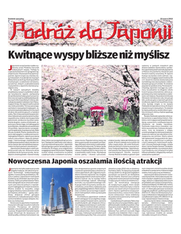Dodatek specjalny 22 marca 2013 Dodatek przygotowany we współpracy z Ambasadą Japonii w Polsce Kwitnącewyspybliższeniżmyślisz aponia to wciąż bardzo rzadko wybierany przez Polaków kierunek wakacyjnych wojaży. Trafiają tu częściej biznesmeni niż spragnieni egzotykituryści.Wpowszechnejopiniiwyjazd do Japonii wiąże się z bardzo dużymikosztami.Awcaletakniemusibyć! Bilety lotnicze doKraju KwitnącejWiśni można kupić, w zależności od sezonu, już od 2 tys. złotych, a zakwaterowanie i wyżywienie w Japonii to również przystępne ceny. W naszym specjalnym dodatku przybliżamynaszymczytelnikomatrakcje turystyczne Japonii, zachęcamy dospróbowaniatradycyjnychprzysmakóworazserwujemysolidnądawkępraktycznychinformacjidlatych,którzyzdecydująsięspędzićwakacjewtymfascynującymkraju.DoJaponiiwartowybrać się zwielu powodów.To kraj o porywającej historii i niezwykłych tradycjach.Japoniatokrajdoskonałejkuchniilicznych atrakcji dla podróżujących w każdym wieku.Niemniejważnejestbezpieczeństwoiłatwośćporuszaniasiękomunikacją publiczną, a także słynna japońska gościnność,serdeczneiżyczliwenastawienie do gości, zwane omotenashi.Japończycy słyną z tego, że traktują gości pokrólewsku,niezależnieodzasobności ich portfela.Japonia słynie z przepięknychkrajobrazówibujnejprzyrody.Mało ktowie,żeokoło70proc.powierzchniJaponii zajmują góry, w większości porośniętegęstymilasami.Japończycydarzą naturę szacunkiem i dążą do pokojowego i harmonijnego współistnienia. Dziękiposzanowaniunaturydodziśmożemycieszyćokoniemaldziewicząprzyrodą w licznych parkach narodowych. Japonia jest doskonałym celem podróży przez cały rok. Wiosna to okres budzącej się do życia przyrody. Jej nadejście zwiastują białe i różowe kwiaty FOT. IWATEPREFECTURE/JNTO J śliwy, które zaczynają kwitnąć już w lutym.Następnie nadchodzi czas sakury, czyli słynnej kwitnącej wiśni.Japońskie lato jest gorące iparne,temperatury dochodzą do 35 stopni, przy wilgotności osiągającej nawet 90 procent.Najlepiej szukać wtedy orzeźwienia na jednej z pięknych plaż z widokiem na turku- sowe morze. Popularnością cieszy się letni wypoczynek na wyspach archipelagu Okinawa,które leżą w subtropikalnej strefie klimatycznej.To także raj dla nurków,którzy mogą podziwiać rafę koralową. Krajobraz jest tu nieco inny niż w pozostałej części kraju. Występują licznie palmy i drzewa cytrusowe, a także kwiaty, takie jak hibiskusy czy azalie. W lecie czekają na turystów nie tylko ciepłe plaże, ale wiele festiwali, podczas których możemy poznać kulturę i tradycję tego kraju. Japońska jesień powita nas nasyconymi barwami czerwieniejących klonów zwanych momiji. Rośnie on dziko w górach i jest sadzony w parkach miejskich jako drzewo ozdobne.Oprócz klonu,symbolem japońskiej jesieni jest tak popularna w Polsce chryzantema. Kwiat ten jest herbem rodziny cesarskiej. W Japonii hoduje się bardzo wiele odmian, niektóre z nich osiągają nawet średnicę 50 cm! Jesień to również doskonała pora na trekking oraz skorzystanie z dobrodziejstw gorących źródeł. Te ostatnie popularne są także zimą.PonieważArchipelag Japoński rozciąga się z północy na południe na długości około trzech tysięcy kilometrów, oblicze japońskiej zimy różni się bardzo w zależności od miejsca. Na podzwrotnikowej Okinawie niemal przez cały rok panuje lato, podczas gdy w rejonach górskich środkowejJaponii lub na północy kraju zimy bywają srogie, a na wyspie Hokkaido temperatura minus 15 stopni nie jest niczym niezwykłym.To właśnie te rejony polecamy zwolennikom sportów zimowych,którzy chętnie spędzają aktywnie czas. Święta i festiwale są bardzo silnie zakorzenione w japońskiej historii. Niektóre znich mają ponad tysiącletnią tradycję, a poza tym z wielką pompą obchodzone są święta narodowe. Festiwale mają różny charakter, niektóre wywodzą się z ludowej obrzędowości, inne są związane z religią, aosobną kategorię stanowią święta poświęcone naturze i jej naturalnie zmieniającemu się rytmowi. Warto zatem tak zaplanować swoją podróż do Japonii, aby móc uczestniczyć w jednym z tych ciekawych i kolorowych wydarzeń. Zimowe festiwale śniegu, święta dzieci,letnie Święto Gwiazd Tanabata, pokazy fajerwerków,czy wreszcie obon, czyli święto ku czci zmarłych to tylko kilka przykładów z długiej listy wartych zobaczenia wydarzeń. Nowoczesna Japonia oszałamia ilością atrakcji aponia to nie tylko piękna przyroda i bogate tradycje, ale także kraj nowych technologii, wielkomiejskiego zgiełku i nowoczesnej architektury.Wizyta w jednej z japońskich metropolii wystarczy,by utwierdzić się wtym przekonaniu.Dobry przykład stanowiTokio, które dźwignęło się ze zniszczeń wojennych i jest obecnie jednym z największych i najbogatszych miast na świecie. Można znaleźć tu wszystko, czego pragną miłośnicy nowoczesności iwielkomiejskiej atmosfery – gęstą zabudowę, drapacze chmur górujące nadcentrum,rozbudowaną sieć metra, centra handlowe, tysiące sklepów, klubów czy restauracji. Nowoczesne japońskie miasta tętnią życiem oferując turystom rozliczne rozrywki. Począwszy od salonów karaoke,ana centrach gier wideo skończywszy. W japońskim karaoke każda grupa otrzymuje do dyspozycji oddzielną salkę,w której można bawić się FOT. YASUFUMINISHI/JNTO J Tokyo Sky Tree bez skrępowania w gronie znajomych i wybierać spośród tysięcy utworów zarówno japońskich, jak i zagranicznych. Warto również zapoznać się z bogatą tradycją japońskich sztuk scenicznych. Można wybrać się na występ teatru mieszczańskiego kabuki, lalkowego bunraku, czy wysublimowanego noh. Kupując bilet otrzymamy zestaw słuchawkowy, przez który nadawany jest głos angielskiego lektora.Warto skorzystać z uroków życia nocnego w japońskich metropoliach,które są niezwykle bezpieczne. Arc