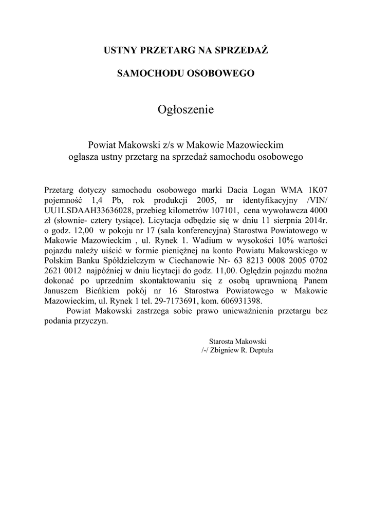 USTNY PRZETARG NA SPRZEDAŻ SAMOCHODU OSOBOWEGO Ogłoszenie Powiat Makowski z/s w Makowie Mazowieckim ogłasza ustny przetarg na sprzedaż samochodu osobowego Przetarg dotyczy samochodu osobowego marki Dacia Logan WMA 1K07 pojemność 1,4 Pb, rok produkcji 2005, nr identyfikacyjny /VIN/ UU1LSDAAH33636028, przebieg kilometrów 107101, cena wywoławcza 4000 zł (słownie- cztery tysiące). Licytacja odbędzie się w dniu 11 sierpnia 2014r. o godz. 12,00 w pokoju nr 17 (sala konferencyjna) Starostwa Powiatowego w Makowie Mazowieckim , ul. Rynek 1. Wadium w wysokości 10% wartości pojazdu należy uiścić w formie pieniężnej na konto Powiatu Makowskiego w Polskim Banku Spółdzielczym w Ciechanowie Nr- 63 8213 0008 2005 0702 2621 0012 najpóźniej w dniu licytacji do godz. 11,00. Oględzin pojazdu można dokonać po uprzednim skontaktowaniu się z osobą uprawnioną Panem Januszem Bieńkiem pokój nr 16 Starostwa Powiatowego w Makowie Mazowieckim, ul. Rynek 1 tel. 29-7173691, kom. 606931398. Powiat Makowski zastrzega sobie prawo unieważnienia przetargu bez podania przyczyn. Starosta Makowski /-/ Zbigniew R. Deptuła REGULAMIN SPRZEDAŻY Samochodu osobowego Dacia Logan I. Tryb postępowania : Postępowanie jest prowadzone w trybie licytacji ustnej i jest jawne. II. Cel postępowania: Celem postępowania jest: 1. Wyłonienie Kupującego pojazd będący przedmiotem licytacji. 2. Uzyskanie najwyższej ceny pojazdu. III. Organizator: 1. Organizatorem licytacji ustnej jest Starosta Makowski. 2. Organizator posiada tytuł prawny do przedmiotu licytacji. 3. W imieniu organizatora działa powołana komisja licytacyjna. IV. Przedmiot licytacji: 1. Cena wywołania I licytacji to 100% kwoty oszacowania pojazdu. 2. Cena wywołania II licytacji to 75% kwoty oszacowania pojazdu. V. Uczestnicy licytacji : 1. W licytacji mogą brać udział osoby fizyczne, osoby prawne i jednostki organizacyjne nie posiadające osobowości prawnej. 2. Oświadczenia woli w imieniu uczestnika może składać wyłącznie uczestnik lub osoba umocowana, która przedłoży stosowne pełnomocnictwo potwierdzone notarialnie. VI . Przebieg licytacji: 1. Przed przystąpieniem do licytacji uczestnik musi zapoznać się z regulaminem licytacji. 2. Przed rozpoczęciem licytacji uczestnicy mają obowiązek złożyć na ręce komisji licytacyjnej: a) oświadczenie, że uczestnik zapoznał się z regulaminem licytacji, oraz projektem umowy sprzedaży i, że nie wnosi do nich zastrzeżeń . b) potwierdzenie wpłaty wadium. 3. Wadium w sprawie przetargów organizowanych przez Powiat Makowski należy uiszczać w formie pieniężnej na konto Nr- 63 8213 0008 2005 0702 2621 0012 w Polskim Banku Spółdzielczym w Ciechanowie 4. Wadium zwraca się po zakończeniu (rozstrzygnięciu) licytacji z zastrzeżeniem, że wadium wniesione przez uczestnika, który licytację wygrał, zwraca się po podpisaniu umowy. Na wniosek uczestnika wadium może być zaliczone na poczet płatności za przedmiot licytacji. Wadium ulega przepadkowi na rzecz Starostwa Powiatowego w Makowie Mazowieckim w razie uchylenia się uczestnika, który licytację wygrał, od zawarcia umowy. Jeżeli w terminie 3 dni od zakończenia licytacji wpłynie skarga na czynności związane z przeprowadzeniem licytacji Organizator wstrzyma się z wypłatą wadium dla wszystkich uczestników do chwili jej rozstrzygnięcia przez Organizatora. VII. Przebieg licytacji: 1. Licytacja odbywa się ustnie. 2. Licytacja rozpoczyna się od wywołania ceny. Zaoferowana cena przestaje wiązać uczestnika licytacji, jeżeli inny uczestnik zaoferował cenę wyższą, zwaną dalej "postąpieniem". Powiat Makowski przyzna własność sprzedanej ruchomości, zwane dalej "przybiciem", osobie, która zaoferowała najwyższą cenę, 3. Przed rozpoczęciem licytacji prowadzący licytację podaje minimalną wysokość postąpienia 100 zł. złotych . 4. Licytację wygrywa uczestnik licytacji, który zgłosił najwyższą cenę, jeżeli po trzykrotnym wezwaniu do dalszych postąpień nikt więcej nie zaoferował wyższej ceny. 5. Przewodniczący zamyka licytację i ogłasza imię i nazwisko lub nazwę albo firmę, która licytację wygrała oraz wylicytowaną cenę. 6. Z chwilą udzielenia przybicia następuje zawarcie umowy sprzedaży przedmiotu licytacji. 7. Nabywca jest obowiązany zapłacić ustaloną w aukcji cenę sprzedaży na wskazany rachunek bankowy sprzedawcy przed podpisaniem umowy sprzedaży, w terminie 14 dni. 8. Jeżeli zwycięzca aukcji nie stawi się w terminie w celu podpisania umowy, sprzedający może odstąpić od umowy. 9. Osoby, które utraciły prawo wynikłe z przybicia, tracą prawo do zwrotu kwoty wpłaconej tytułem wadium. 10. Organizator w przypadku nie wyłonienia zwycięzcy pierwszej licytacji podejmie odpowiednie kroki zmierzające do ogłoszenia kolejnej licytacji. VIII . Postanowienia końcowe: 1. Komisja przeprowadzająca licytację sporządza protokół, którego wzór stanowi załącznik nr 1 do regulaminu. 2 Protokół z przeprowadzonej licytacji podpisuje przewodniczący i członkowie komisji licytacyjnej oraz osoba wyłoniona w licytacji jako kupujący. 3. Ogłoszenie o licytacji umieszcza się na tablicy ogłoszeń w siedzibie Starostwa Powiatowego w Makowie Mazowieckim, oraz na stronie internetowej organizatora pod adresem www.bip.powiat.makowski.pl najpóźniej na 3 dni przed wyznaczonym terminem licytacji. 4. Licytacja jest ważna jeżeli na I licytację zgłosi się minimum dwóch uczestników, w przypadku braku uczestników drugą licytację przeprowadza się z 1 uczestnikiem. 10. Uczestnik licytacji może działać przez pełnomocnika. W takim przypadku powinien przedstawić oryginał pełnomocnictwa które zostało potwierdzone notarialnie. 11. Wszelkich informacji udziela Pan – Remigiusz Dębek Załącznik nr 1 do regulaminu licytacji Protokół Sporządzony w dniu ………………….2014r. w Starostwie Powiatowym w Makowie Mazowieckim przy ul. Rynek 1 z lic