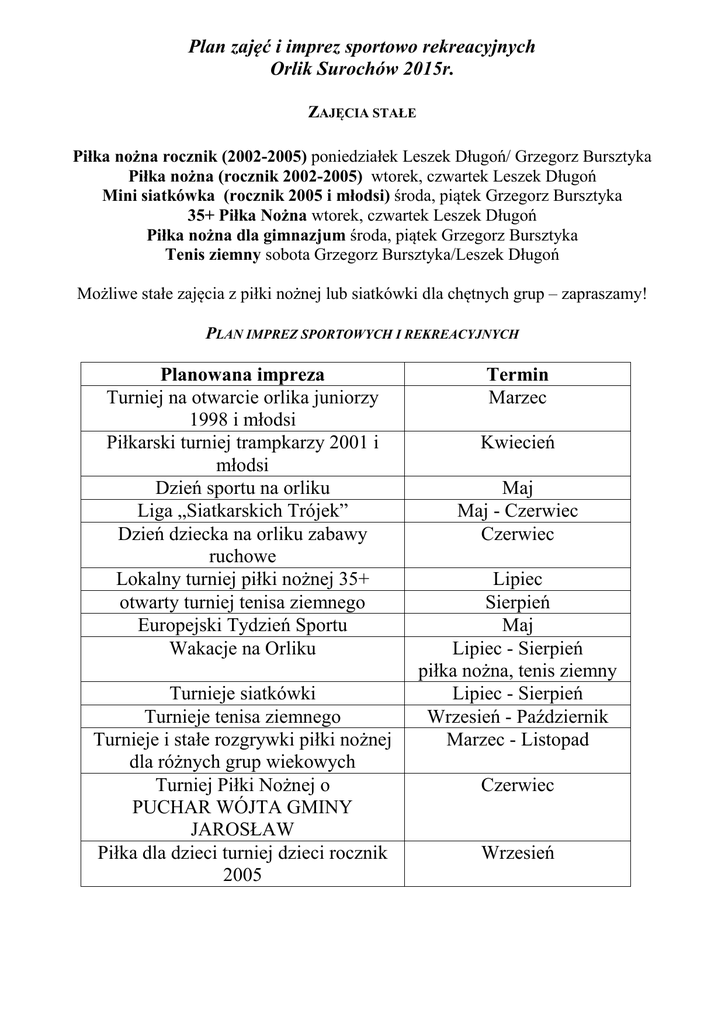 Plan zajęć i imprez sportowo rekreacyjnych Orlik Surochów 2015r