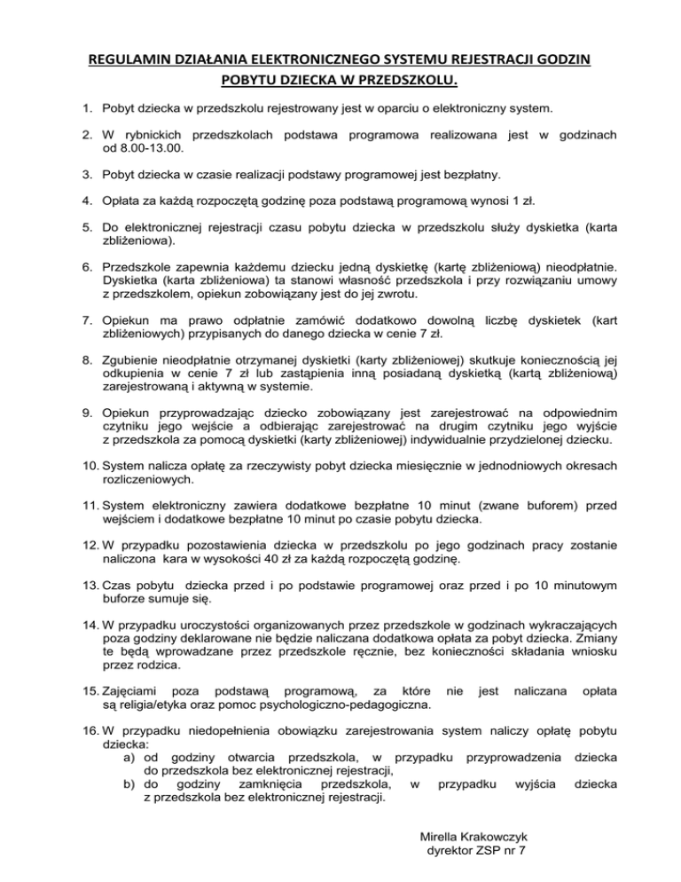 REGULAMIN DZIAŁANIA ELEKTRONICZNEGO SYSTEMU REJESTRACJI GODZIN POBYTU DZIECKA W PRZEDSZKOLU. 1. Pobyt dziecka w przedszkolu rejestrowany jest w oparciu o elektroniczny system. 2. W rybnickich przedszkolach podstawa programowa realizowana jest w godzinach od 8.00-13.00. 3. Pobyt dziecka w czasie realizacji podstawy programowej jest bezpłatny. 4. Opłata za każdą rozpoczętą godzinę poza podstawą programową wynosi 1 zł. 5. Do elektronicznej rejestracji czasu pobytu dziecka w przedszkolu służy dyskietka (karta zbliżeniowa). 6. Przedszkole zapewnia każdemu dziecku jedną dyskietkę (kartę zbliżeniową) nieodpłatnie. Dyskietka (karta zbliżeniowa) ta stanowi własność przedszkola i przy rozwiązaniu umowy z przedszkolem, opiekun zobowiązany jest do jej zwrotu. 7. Opiekun ma prawo odpłatnie zamówić dodatkowo dowolną liczbę dyskietek (kart zbliżeniowych) przypisanych do danego dziecka w cenie 7 zł. 8. Zgubienie nieodpłatnie otrzymanej dyskietki (karty zbliżeniowej) skutkuje koniecznością jej odkupienia w cenie 7 zł lub zastąpienia inną posiadaną dyskietką (kartą zbliżeniową) zarejestrowaną i aktywną w systemie. 9. Opiekun przyprowadzając dziecko zobowiązany jest zarejestrować na odpowiednim czytniku jego wejście a odbierając zarejestrować na drugim czytniku jego wyjście z przedszkola za pomocą dyskietki (karty zbliżeniowej) indywidualnie przydzielonej dziecku. 10. System nalicza opłatę za rzeczywisty pobyt dziecka miesięcznie w jednodniowych okresach rozliczeniowych. 11. System elektroniczny zawiera dodatkowe bezpłatne 10 minut (zwane buforem) przed wejściem i dodatkowe bezpłatne 10 minut po czasie pobytu dziecka. 12. W przypadku pozostawienia dziecka w przedszkolu po jego godzinach pracy zostanie naliczona kara w wysokości 40 zł za każdą rozpoczętą godzinę. 13. Czas pobytu dziecka przed i po podstawie programowej oraz przed i po 10 minutowym buforze sumuje się. 14. W przypadku uroczystości organizowanych przez przedszkole w godzinach wykraczających poza godziny deklarowane nie będzie naliczana dodatkowa opłata za pobyt dziecka. Zmiany te będą wprowadzane przez przedszkole ręcznie, bez konieczności składania wniosku przez rodzica. 15. Zajęciami poza podstawą programową, za które są religia/etyka oraz pomoc psychologiczno-pedagogiczna. nie jest naliczana opłata 16. W przypadku niedopełnienia obowiązku zarejestrowania system naliczy opłatę pobytu dziecka: a) od godziny otwarcia przedszkola, w przypadku przyprowadzenia dziecka do przedszkola bez elektronicznej rejestracji, b) do godziny zamknięcia przedszkola, w przypadku wyjścia dziecka z przedszkola bez elektronicznej rejestracji. Mirella Krakowczyk dyrektor ZSP nr 7