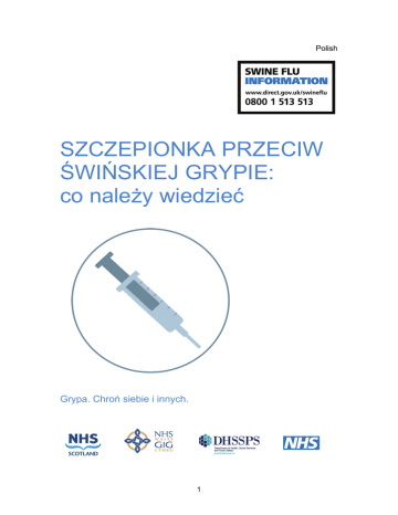 Polish SZCZEPIONKA PRZECIW ŚWIŃSKIEJ GRYPIE: co należy wiedzieć Grypa. Chroń siebie i innych. 1 Spis treści Czym jest świńska grypa? 3 O szczepionce przeciw świńskiej grypie 4 O czym jeszcze należy wiedzieć? 8 Co teraz należy zrobić? 10 2 Czym jest świńska grypa? Świńska grypa jest chorobą układu oddechowego wywoływaną przez nową odmianę wirusa grypy. Ponieważ obecnie dostępne szczepionki przeciw grypie sezonowej nie chronią przed świńską grypą, trzeba było opracować nową szczepionkę przeciwgrypową. Jak poważną chorobą jest świńska grypa? Większość osób przechodzi świńską grypę łagodnie. Choroba nadchodzi szybko i przeważnie trwa około tygodnia. Powoduje gorączkę, zmęczenie, kaszel i ból gardła. Do innych objawów mogą należeć bóle głowy i mięśni, dreszcze, kichanie, katar, brak apetytu, wymioty oraz biegunka. Niektóre osoby mogą poważnie zachorować w wyniku zarażenia świńską grypą. Może się to odnosić do osób cierpiących na przewlekłe schorzenia, kobiet ciężarnych lub osób z osłabionym – przez chorobę lub leczenie stanu chorobowego – systemem immunologicznym. Osoby te mogą wymagać leczenia szpitalnego, a - w najgorszych przypadkach - choroba może okazać się śmiertelna. Dlatego poddanie się szczepieniom zapobiegającym świńskiej grypie jest tak ważne. O szczepionce przeciw świńskiej grypie Opracowano szczepionki chroniące przed wirusem wywołującym świńską grypę. Obecnie dostępne są dwie szczepionki pod nazwami Pandemrix oraz Celvapan. Wielu osobom, które otrzymają szczepionkę Pandemrix, wystarczy tylko jedna dawka. Osoby, które otrzymają Celvapan, będą potrzebować dwóch dawek w odstępie trzech tygodni. Czy jest ona taka sama jak szczepionka przeciw grypie sezonowej? Nie. Szczepionka przeciw świńskiej grypie różni się od oferowanej rokrocznie szczepionce przeciw grypie sezonowej. Szczepionka przeciw grypie sezonowej nie chroni przed świńską grypą. Jeśli jest ci zwykle zalecana szczepionka przeciw grypie sezonowej, należy się zaszczepić. Możesz także otrzymać zalecenie zaszczepienia się przeciw świńskiej grypie. Szczepionka przeciw grypie sezonowej nie chroni przed świńską grypą. 3 Kto w pierwszym rzędzie otrzyma szczepionkę? Szczepionka zostanie zaoferowana przede wszystkim osobom narażonym na ryzyko najcięższej formy świńskiej grypy. Osoby te należą do następujących grup pierwszeństwa: 1. Dorośli i dzieci w wieku powyżej sześciu miesięcy, którzy cierpią na przewlekłe schorzenia, takie jak: • Przewlekłą chorobę płuc, • Przewlekłą chorobę serca, • Przewlekłą chorobę nerek, • Przewlekłą chorobę wątroby, • Przewlekłe choroby neurologiczne, • Cukrzycę (diabetes mellitus), • Obniżoną odporność spowodowaną chorobą lub leczeniem schorzenia. Na przykład, może to obejmować osoby z usuniętą śledzioną oraz osoby poddawane leczeniu, które powoduje obniżenie odporności, albo osoby przyjmujące wysokie dawki sterydów. 2. Ciężarne kobiety we wszystkich stadiach ciąży Będąc w ciąży możesz być bardziej narażona na ciężką chorobę w przypadku zachorowania na świńską grypę. Dotychczasowe doświadczenia dowodzą, że kobiety ciężarne są cztery razy bardziej narażone na ryzyko poważnych komplikacji spowodowanych świńską grypą oraz, że kobiety ciężarne pięć razy częściej mogą wymagać hospitalizacji. Ryzyko spowodowane grypą jest najwyższe w zaawansowanej ciąży. 3. Osoby mieszkające w tym samym domu co osoba, której systém odpornościowy został osłabiony chorobą lub leczeniem Jeśli mieszkasz z kimś, kto – na przykład – jest w trakcie leczenia nowotworowego, oraz jeśli zachorujesz na świńską grypę, osoba ta może się od ciebie zarazić i poważnie zachorować. Jeśli masz poważnie osłabiony system odpornościowy, poproś osoby, z którymi mieszkasz o zaszczepienie się, aby zmniejszyć ryzyko zarażenia ciebie świńską grypą. Jeśli nie masz pewności, czy należy się zaszczepić, porozmawiaj ze swoim lekarzem GP lub pielęgniarką w przychodni. 4 Szczepionkę oferuje się także pracownikom opieki zdrowotnej i społecznej, którzy mogą blisko stykać się z osobami z powyższych grup. Kto nie może przyjąć szczepionki przeciw świńskiej grypie? Tylko niewielka grupa osób nie może przyjąć szczepionki przeciw świńskiej grypie. Nie należy podawać szczepionek nikomu, kto miał silną reakcję alergiczną na poprzednią dawkę szczepionki lub jakikolwiek składnik szczepionki.Jeśli się niepokoisz, że może to ciebie dotyczyć, porozmawiaj ze swoim lekarzem GP lub pielęgniarką w przychodni. A co w przypadku uczulenia na jaja? Szczepionka Pandemrix produkowana jestna bazie jaj kurzych w taki sam sposób jak szczepionki przeciw grypie sezonowej. Nie należy jej podawać osobom, które miały potwierdzoną reakcję anafilaktyczną (wstrząs lub trudności w oddychaniu) w wyniku kontaktu z produktami jaj kurzych. Szczepionka Celvapan jest produkowana bez użycia jaj – tak więc należy przyjąć tę szczepionkę, jeśli masz silną alergię na jaja. A jeśli chodzi o wszystkich innych? Osoby nie należące do wyżej wymienionych grup pierwszeństwa, mogą otrzymać zaproszenie na szczepienie w późniejszym terminie. Rząd zamówił wystarczającą ilość szczepionek dla wszystkich osób w kraju, jeśli zajdzie taka potrzeba. O czym jeszcze należy wiedzieć? Czy istnieją jakieś skutki uboczne? Wszystkie szczepionki mogą spowodować skutki uboczne takie jak zaczerwienienie, ból oraz opuchnięcie w miejscu zastrzyku. Szczepionki przeciw grypie mogą spowodować takie objawy jak gorączka, ból głowy oraz bóle mięśniowe, lecz są one znacznie łagodniejsze niż sama grypa i trwają tylko około jednego dnia. Jeśli uważasz, że u ciebie lub u kogoś znajomego objawiły się poważniejsze skutki uboczne szczepionki Pandemrix cz