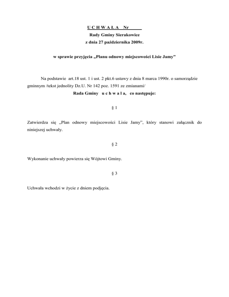 U C H W A Ł A Nr Rady Gminy Sierakowice z dnia 27 października 2009r. w sprawie przyjęcia „Planu odnowy miejscowości Lisie Jamy” Na podstawie art.18 ust. 1 i ust. 2 pkt.6 ustawy z dnia 8 marca 1990r. o samorządzie gminnym /tekst jednolity Dz.U. Nr 142 poz. 1591 ze zmianami/ Rada Gminy u c h w a l a, co następuje: §1 Zatwierdza się „Plan odnowy miejscowości Lisie Jamy”, który stanowi załącznik do niniejszej uchwały. §2 Wykonanie uchwały powierza się Wójtowi Gminy. §3 Uchwała wchodzi w Ŝycie z dniem podjęcia. Plan odnowy miejscowości Lisie Jamy Plan odnowy miejscowości Lisie Jamy Województwo Pomorskie Powiat Kartuski Gmina Sierakowice Projekt jest współfinansowany ze środków Europejskiego Funduszu Rolnego na Rzecz Rozwoju Obszarów Wiejskich Sierakowice 2009 Spis treści: 1. Charakterystyka miejscowości: a) PołoŜenie miejscowości b) Historia miejscowości c) Określenie przestrzennej struktury miejscowości 2. Inwentaryzacja zasobów słuŜących odnowie miejscowości. 3. Ocena mocnych i słabych stron miejscowości, w której będzie realizowana operacja oraz analiza szans i potencjalnych zagroŜeń. 4. Wykaz planowanych zadań inwestycyjnych i przedsięwzięć aktywizujących społeczność lokalną. 1. Charakterystyka miejscowości: a) połoŜenie miejscowości: Lisie Jamy (kasz.Lësé Jamë) to kaszubska wieś na Pojezierzu Kaszubskim połoŜona w województwie pomorskim ( w latach 1975-1998 w województwie gdańskim), w powiecie kartuskim, na południowym wschodzie gminy Sierakowice, na Pojezierzu Kaszubskim. Wieś wchodzi w skład sołectwa Długi Kierz (kaszub. Długë Kiérz). Obszar sołectwa jest równy 494,04 ha. Liczba mieszkańców (według danych Urzędu Gminy z października 2009 r.) wynosi 462 osób, z czego 159 zamieszkuje miejscowość Lisie Jamy. Uwaga- w uŜyciu niekiedy funkcjonuje druga nazwa wsi - Lisia Jama. PołoŜenie geograficzne miejscowości: 54° 18' 09'' N, 17° 57' 13'' E Ilustracja 1 – połoŜenie wsi Ilustracja 2 – mapa gminy Sierakowice b) historia miejscowości Lisie Jamy otrzymały nazwę od lisiej nory( jamy), przy której miała zostać zbudowana pierwsza zagroda. Pierwotnie uŜywano liczby pojedynczej Lisia Jama. Liczbę mnoga wprowadzono w okresie międzywojennym. Wykaz urzędowych nazw miejscowości w Polsce z roku 1981 podaje 8 miejscowości o nazwie Lisie Jamy . Historia wsi wiąŜe się ściśle z dziejami sołectwa Długi Kierz, którego jest integralną częścią. Jak podają źródła nazwa Długi Kierz wywodzi się od potęŜnego buka, który rozrósł się koło pierwszych zabudowań. Na uwagę zasługuje występowanie na tym terenie złóŜ gliny, które pozwoliło załoŜyć na pograniczu obu miejscowości, w końcu XIX wieku cegielnię produkującą czerwoną, paloną cegłę. Była to pierwotnie cegielnia polowa. Jej załoŜycielem był Niemiec Klucke. Na początku XX wieku zmodernizowano ją budując nowoczesny na owe czasy piec typu Hoffmana pozwalający na ciągłą produkcję cegły. Osobą, która przyczyniła się do masowej produkcji cegły przez mieszkańców był ks. Anastazy Sadowski - pierwszy proboszcz parafii i budowniczy kościoła w Wygodzie. To z tej cegielni pochodzi cegła, z której w latach 1910-1914 zbudowano wspomniany kościół parafialny św. Józefa. Cegielnia w późniejszym czasie zmieniała właścicieli i ostatecznie z licytacji nabył ją pan Alfons Grabowski. W czasie II wojny światowej przejął ją okupant, a rodzina Grabowskich musiała opuścić zakład i mieszkanie. Po wojnie cegielnię ponownie uruchomił pan Grabowski, jednak w 1949r. została ona znacjonalizowana. Funkcjonowała do początku lat 90-tych najpierw jako zakład państwowy, a pod koniec była dzierŜawiona przez zespół rolników. Obecnie wróciła do spadkobierców. Ze względu na znaczne zniszczenia nie funkcjonuje i jest nie udostępniana do zwiedzania. Obiekt ten stanowi jedną z atrakcji i a jego komin jest najbardziej rozpoznawalny na terenie sołectwa. Ilustracja 3 – cegielnia W połowie XIX na terenie sołectwa Długi Kierz zbudowano między Szklaną i Lisimi Jamami szkołę, której nauczyciel (jego imię i nazwisko nie zachowało się do dziś) był wyzwania ewangelickiego. Człowiek ten był dobrze wykształcony i pełnił dodatkowo sprawował rolę pastora (miał podobno święcenia uprawniające do takiej funkcji). PoniewaŜ w najbliŜszym otoczeniu nie było zborów ewangelickich, mieszkańcy tego wyznania byli chrzczeni i grzebani przez wspomnianego nauczyciela. W pobliŜu szkoły załoŜono cmentarz ewangelicki zachowany do dziś jako obiekt prawnie chroniony, chociaŜ zaprzestano na nim grzebać przed pierwszą wojną światową. Wspomniany nauczyciel posadził truskawki w swoim ogródku przyszkolnym, które sprowadził na te tereny z Berlina. W czasie I wojny światowej szkoła spłonęła, zaś nauczyciel wyprowadził się w nieznane strony. Po wojnie juŜ szkoły nie reaktywowano. W ogródku jednak zostały bezpańskie juŜ truskawki. Okoliczni mieszkańcy zaczęli przesadzać młode rozsadki do swoich ogródków. Pierwotnie roślinę tą uprawiano w niewielkich ilościach na tzw. potrzeby własne, gdyŜ nie było dla niej zbytu. Gorącym propagatorem uprawy truskawki był pierwszy wygodzki proboszcz ks. Anastazy Sadowski. Sprowadzał on z Węgier nowe odmiany tej rośliny i na duŜą skalę rozpowszechnił jej uprawę oraz pomógł mieszkańcom w jej zbycie (co ułatwiła równieŜ budowa portu w Gdyni). Uprawę na szerszą skalę rozpoczęła teŜ pani Helena Gruchała i trochę później pani Bronisława Polaszk. Po drugiej wojnie światowej uprawa rozpowszechniła się w szeregu sąsiednich sołectw, a nawet objęła sąsiednie gminy. Lisie Jamy i Długi Kierz były kolebką tej rośliny, a dziś są istotnym zagłębiem truskawkowym. Po spaleniu się pierwotnego budynku szkoły, kolejną pobudowano w centrum miejscowości. Jej historia sięga czasów sprzed 1898