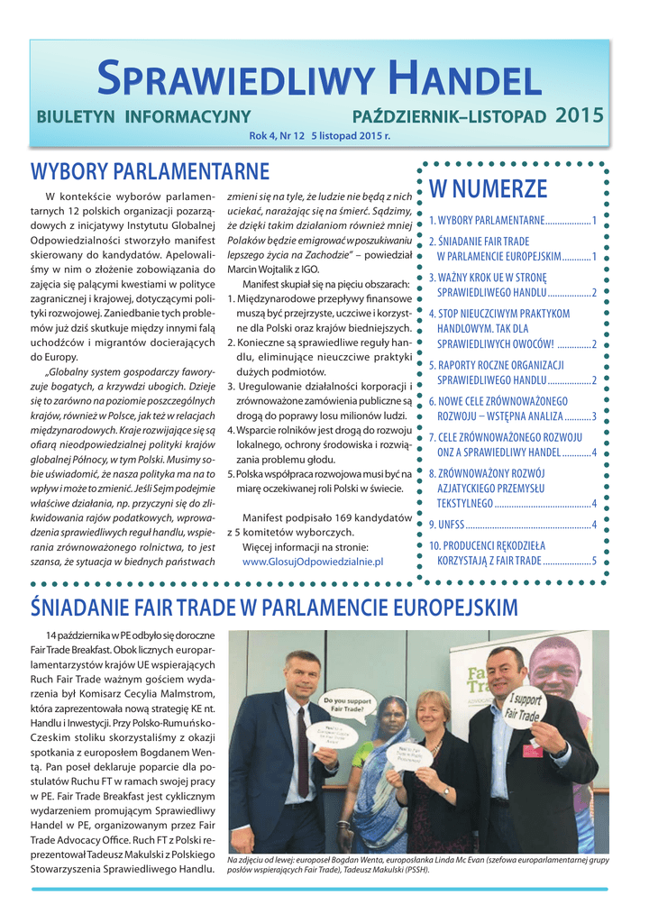 spraWiEdliWy HandEl BiUlEtyn inFormacyjny paŹdziErnik–listopad 2015 rok 4, nr 12 5 listopad 2015 r. WyBory parlamEntarnE W kontekście wyborów parlamentarnych 12 polskich organizacji pozarządowych z inicjatywy Instytutu Globalnej Odpowiedzialności stworzyło manifest skierowany do kandydatów. Apelowaliśmy w nim o złożenie zobowiązania do zajęcia się palącymi kwestiami w polityce zagranicznej i krajowej, dotyczącymi polityki rozwojowej. Zaniedbanie tych problemów już dziś skutkuje między innymi falą uchodźców i migrantów docierających do Europy. „Globalny system gospodarczy faworyzuje bogatych, a krzywdzi ubogich. Dzieje się to zarówno na poziomie poszczególnych krajów, również w Polsce, jak też w relacjach międzynarodowych. Kraje rozwijające się są ofiarą nieodpowiedzialnej polityki krajów globalnej Północy, w tym Polski. Musimy sobie uświadomić, że nasza polityka ma na to wpływ i może to zmienić. Jeśli Sejm podejmie właściwe działania, np. przyczyni się do zlikwidowania rajów podatkowych, wprowadzenia sprawiedliwych reguł handlu, wspierania zrównoważonego rolnictwa, to jest szansa, że sytuacja w biednych państwach zmieni się na tyle, że ludzie nie będą z nich uciekać, narażając się na śmierć. Sądzimy, że dzięki takim działaniom również mniej Polaków będzie emigrować w poszukiwaniu lepszego życia na Zachodzie” – powiedział Marcin Wojtalik z IGO. Manifest skupiał się na pięciu obszarach: 1. Międzynarodowe przepływy finansowe muszą być przejrzyste, uczciwe i korzystne dla Polski oraz krajów biedniejszych. 2. Konieczne są sprawiedliwe reguły handlu, eliminujące nieuczciwe praktyki dużych podmiotów. 3. Uregulowanie działalności korporacji i zrównoważone zamówienia publiczne są drogą do poprawy losu milionów ludzi. 4. Wsparcie rolników jest drogą do rozwoju lokalnego, ochrony środowiska i rozwiązania problemu głodu. 5. Polska współpraca rozwojowa musi być na miarę oczekiwanej roli Polski w świecie. Manifest podpisało 169 kandydatów z 5 komitetów wyborczych. Więcej informacji na stronie: www.GlosujOdpowiedzialnie.pl W nUmErzE 1. WYBORY PARLAMENTARNE ...................1 2. ŚNIADANIE FAIR TRADE W PARLAMENCIE EUROPEJSKIM ............1 3. WAŻNY KROK UE W STRONĘ SPRAWIEDLIWEGO HANDLU ..................2 4. STOP NIEUCZCIWYM PRAKTYKOM HANDLOWYM. TAK DLA SPRAWIEDLIWYCH OWOCÓW! ..............2 5. RAPORTY ROCZNE ORGANIZACJI SPRAWIEDLIWEGO HANDLU ..................2 6. NOWE CELE ZRÓWNOWAŻONEGO ROZWOJU – WSTĘPNA ANALIZA ...........3 7. CELE ZRÓWNOWAŻONEGO ROZWOJU ONZ A SPRAWIEDLIWY HANDEL ............4 8. ZRÓWNOWAŻONY ROZWÓJ AZJATYCKIEGO PRZEMYSŁU TEKSTYLNEGO ........................................4 9. UNFSS ....................................................4 10. PRODUCENCI RĘKODZIEŁA KORZYSTAJĄ Z FAIR TRADE ....................5 ŚniadaniE Fair tradE W parlamEnciE EUropEjskim 14 października w PE odbyło się doroczne Fair Trade Breakfast. Obok licznych europarlamentarzystów krajów UE wspierających Ruch Fair Trade ważnym gościem wydarzenia był Komisarz Cecylia Malmstrom, która zaprezentowała nową strategię KE nt. Handlu i Inwestycji. Przy Polsko-RumuńskoCzeskim stoliku skorzystaliśmy z okazji spotkania z europosłem Bogdanem Wentą. Pan poseł deklaruje poparcie dla postulatów Ruchu FT w ramach swojej pracy w PE. Fair Trade Breakfast jest cyklicznym wydarzeniem promującym Sprawiedliwy Handel w PE, organizowanym przez Fair Trade Advocacy Office. Ruch FT z Polski reprezentował Tadeusz Makulski z Polskiego Stowarzyszenia Sprawiedliwego Handlu. Na zdjęciu od lewej: europoseł Bogdan Wenta, europosłanka Linda Mc Evan (szefowa europarlamentarnej grupy posłów wspierających Fair Trade), Tadeusz Makulski (PSSH). 2 Ważny krok UE w stronę Sprawiedliwego Handlu 14 października 2015 Komisja Europejska opublikowała nową Strategię Handlu i Inwestycji UE. Prezentując ją podczas Śniadania Fair Trade w PE, Cecilia Malmstrom - Komisarz UE ds. Handlu, zaprezentowała szereg nowych inicjatyw mających wspierać wdrażanie Sprawiedliwego Handlu, „Handel z korzyścią dla wszystkich: W kierunku bardziej odpowiedzialnej polityki handlowej i inwestycyjnej” . W planie nowej polityki handlowej UE Komisja przyznała, że Sprawiedliwy Handel przyczynia się do rozwoju bardziej zrów- noważonych możliwości handlowych dla drobnych producentów z państw rozwijających się. Zaprezentowała także listę planowanych proaktywnych inicjatyw, takich jak wspieranie delegatów unijnych w promocji Sprawiedliwego Handlu pośród małych producentów krajów rozwijających się oraz wprowadzenie nagrody „Europejscka stolica Sprawiedliwego Handlu”. Ruch Ruch Fair Trade z radością przyjął fakt uświadomienia sobie przez Komisję Europejską, że wprowadzenie w życie zasad Sprawiedliwego Stop nieuczciwym praktykom handlowym. Tak dla sprawiedliwych owoców! Podpisz petycję do Komisarz Bieńkowskiej! To ona niebawem zadecyduje czy UE wprowadzi bardziej zdecydowane regulacje przeciwko nadużyciom supermarketów. Handlu w nowej strategii unijnej musi angażować możliwości i szanse pochodzące od obywateli, przedsiębiorców, drobnych wytwórców i władz lokalnych oraz w sposób odpowiedni wykorzystywać wszystkie oddolne inicjatywy w tym zakresie. Ruch FT również pozytywnie przyjmuje stwierdzenie, że „handel nie powinien być celem samym w sobie”. Jednocześnie wzywa Komisję Europejską do implementacji nowej unijnej agendy zakładającej, że ludzie i planeta są najważniejsi, zgodnie z wezwaniem Sojuszu Alternative Trade Mandate. Za pozytywne uznano także zobowiązanie Komisji do zapewnienia przejrzystości na wszystkich etapach negocjacji handlowych. Marginalizowani producenci oraz pracownicy najemni muszą mieć możliwość zabrania głosu podczas podczas negocjowania umów handlowych. Źródło: Fair Trade Advocacy Office Raporty roczne organizacj