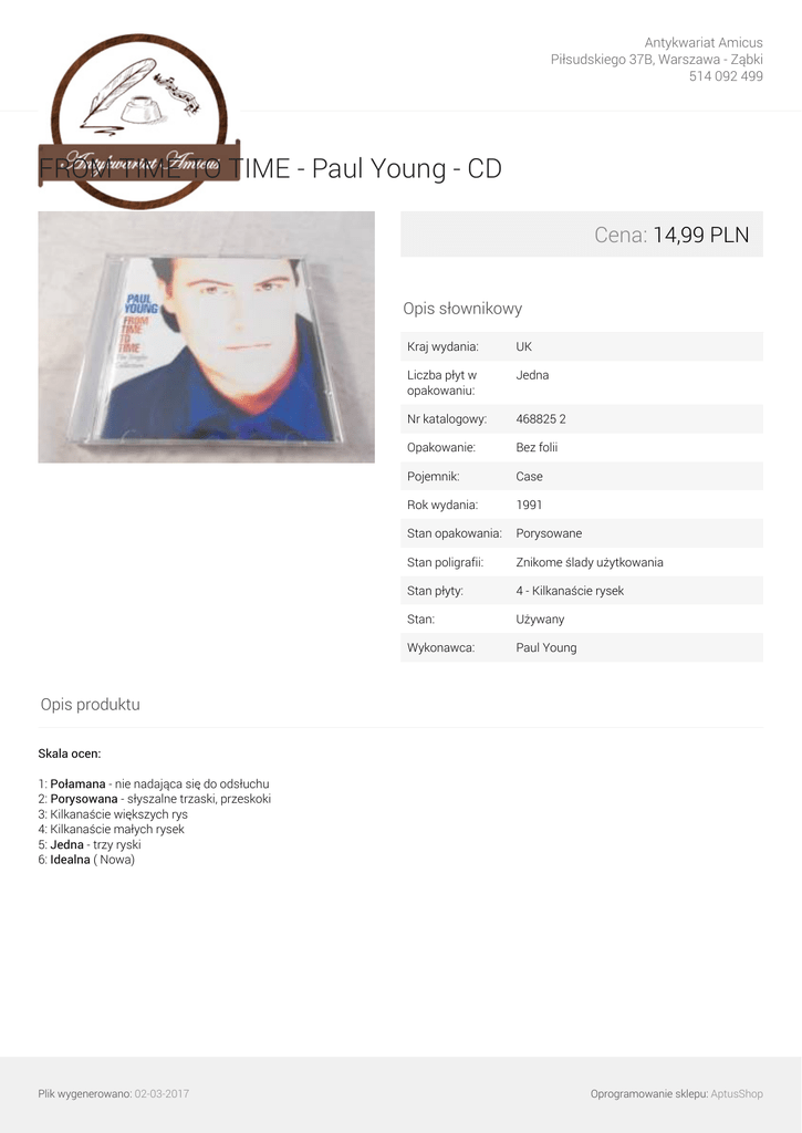 Antykwariat Amicus Piłsudskiego 37B, Warszawa - Ząbki 514 092 499 FROM TIME TO TIME - Paul Young - CD Cena: 14,99 PLN Opis słownikowy Kraj wydania: UK Liczba płyt w opakowaniu: Jedna Nr katalogowy: 468825 2 Opakowanie: Bez folii Pojemnik: Case Rok wydania: 1991 Stan opakowania: Porysowane Stan poligrafii: Znikome ślady użytkowania Stan płyty: 4 - Kilkanaście rysek Stan: Używany Wykonawca: Paul Young Opis produktu Skala ocen: 1: Połamana - nie nadająca się do odsłuchu 2: Porysowana - słyszalne trzaski, przeskoki 3: Kilkanaście większych rys 4: Kilkanaście małych rysek 5: Jedna - trzy ryski 6: Idealna ( Nowa) Plik wygenerowano: 02-03-2017 Oprogramowanie sklepu: AptusShop Antykwariat Amicus Piłsudskiego 37B, Warszawa - Ząbki 514 092 499 Galeria Plik wygenerowano: 02-03-2017 Powered by TCPDF (www.tcpdf.org) Oprogramowanie sklepu: AptusShop